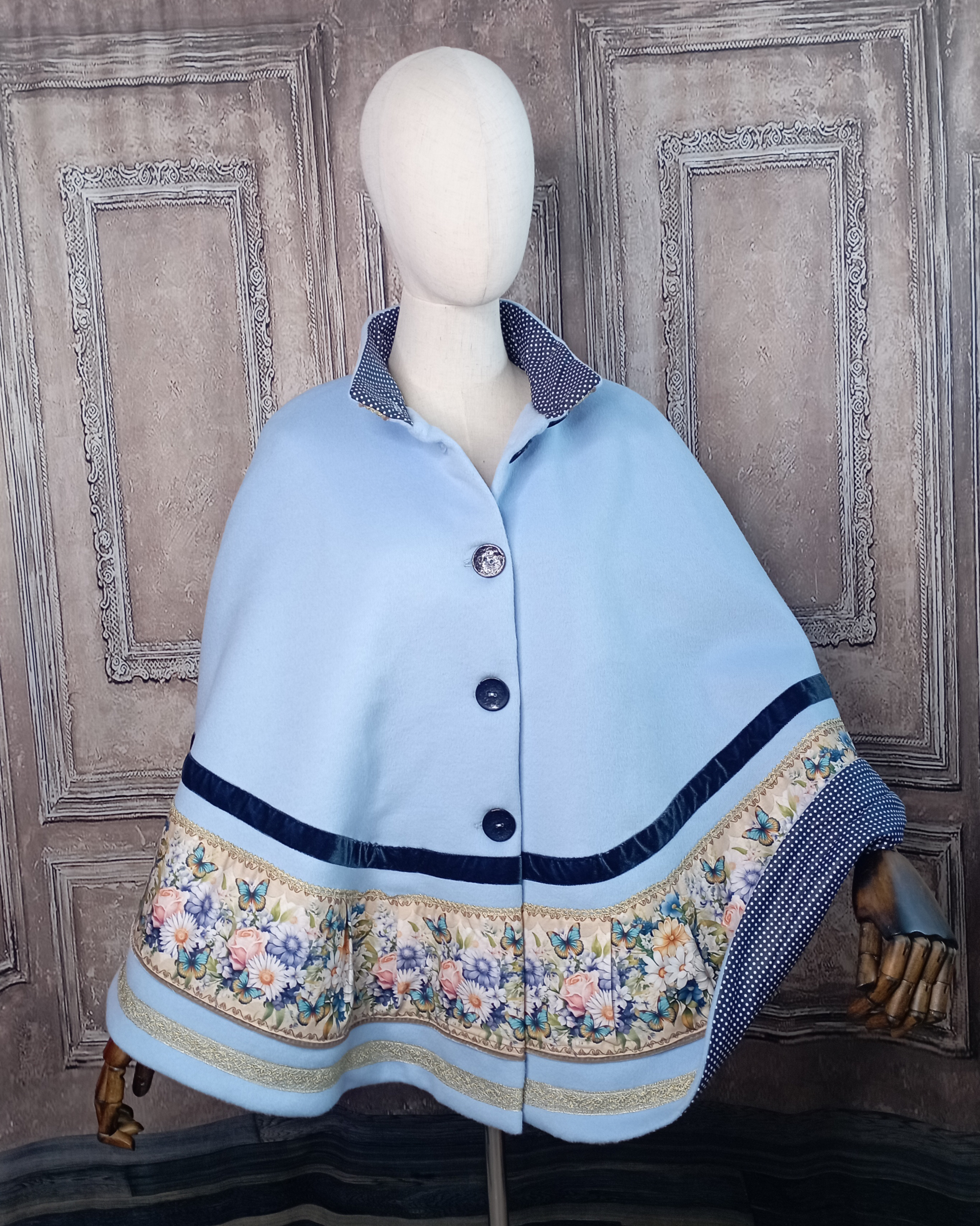 Une cape bleu clair très unique, en drap de laine bleu pervenche et une jolie doublure de coton bleu marine à pois.
