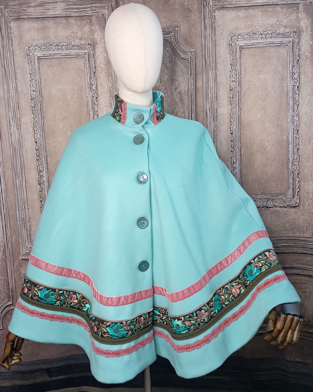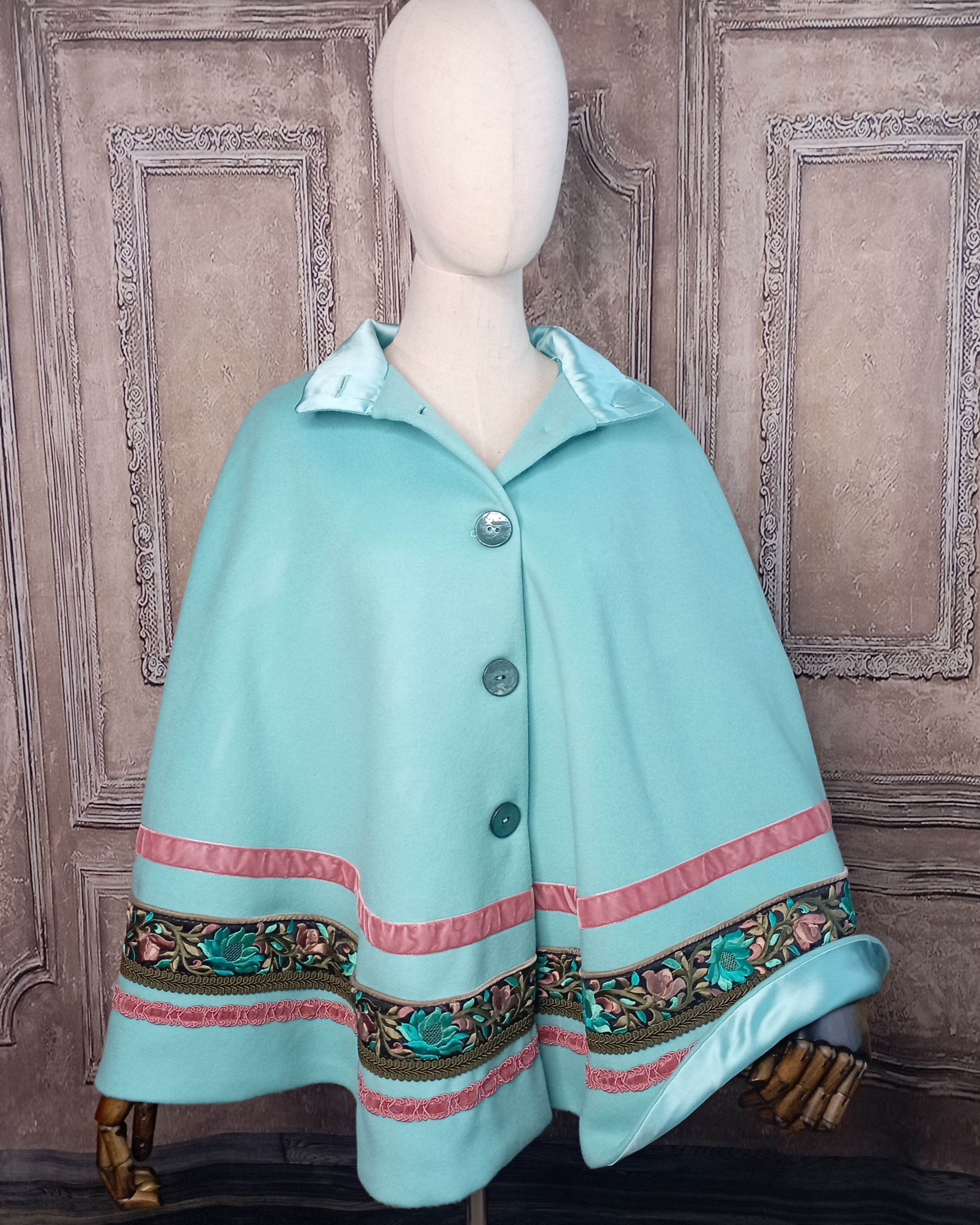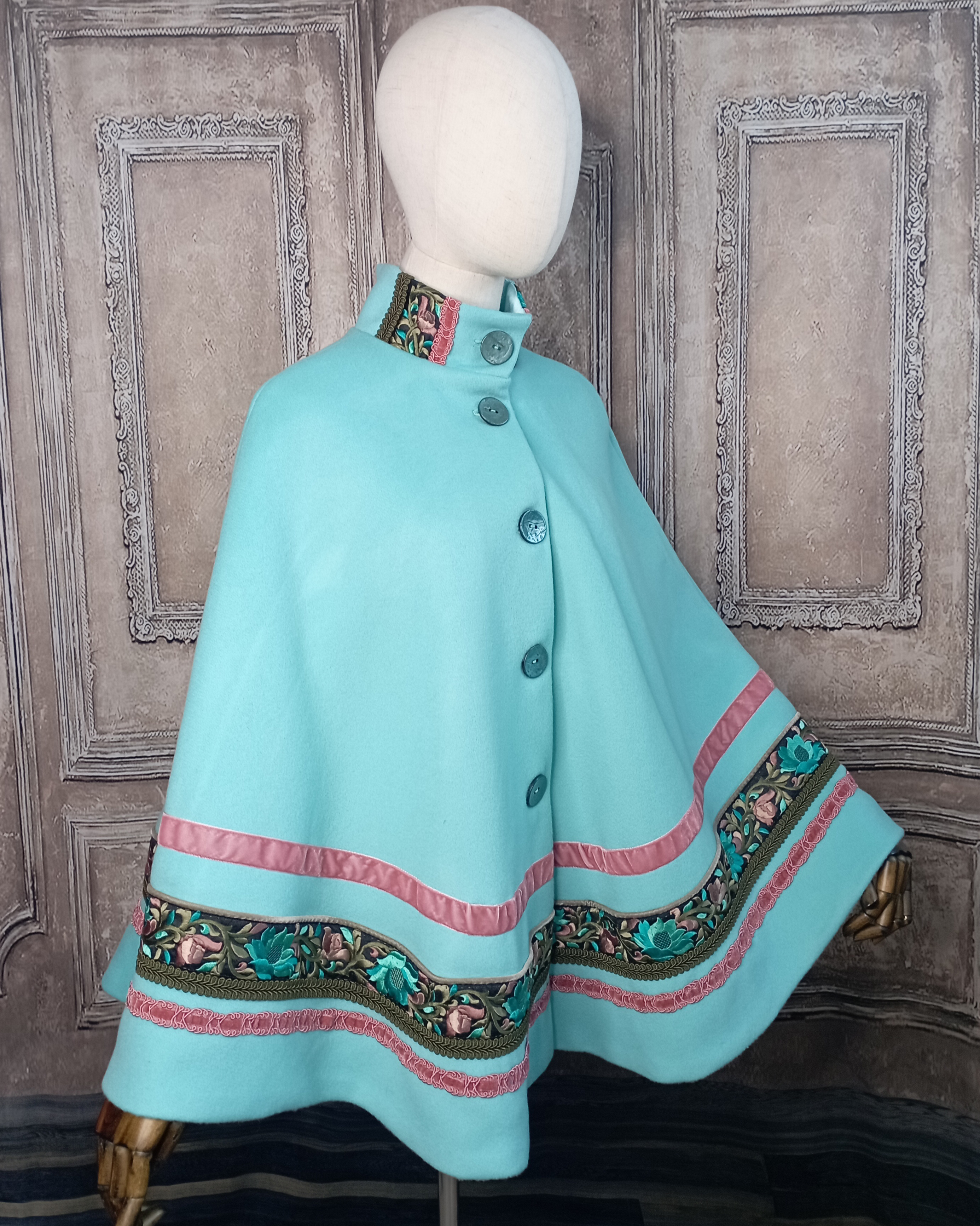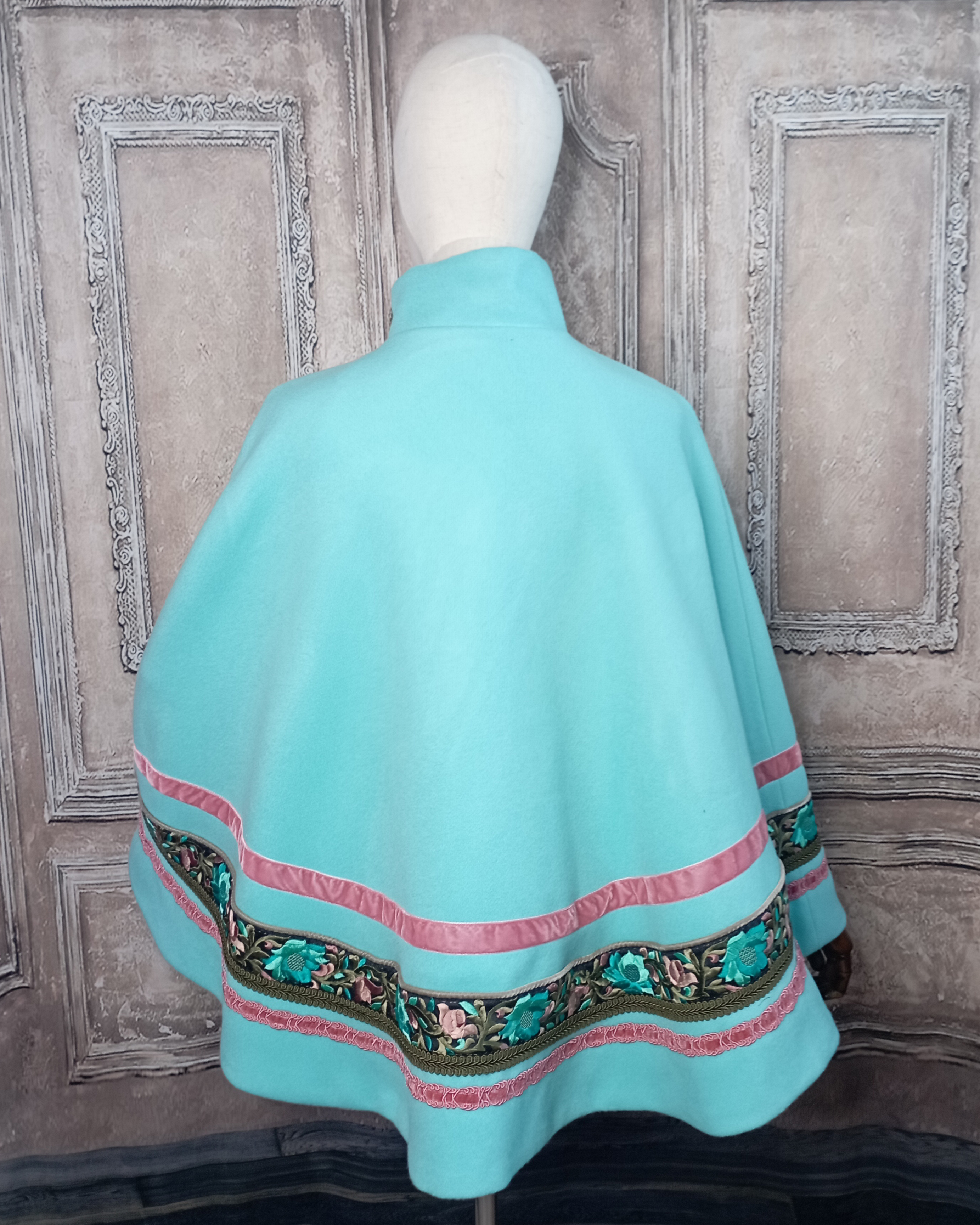 Cape bleu turquoise en laine et ruban brodé de fleurs.