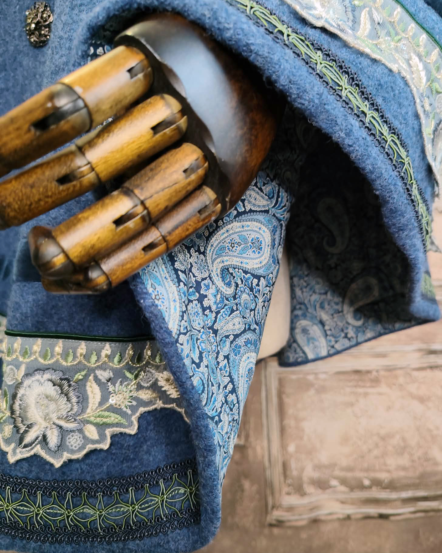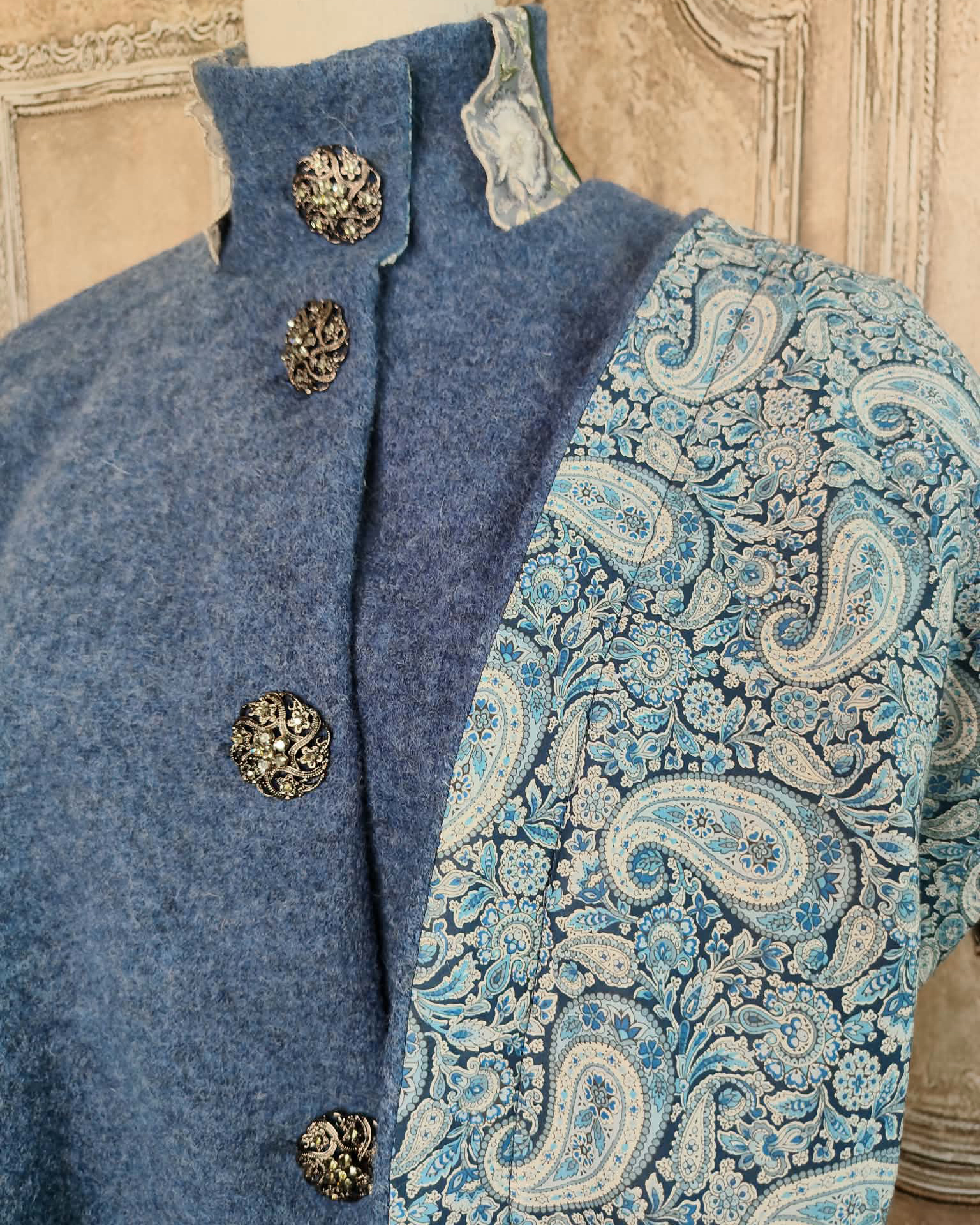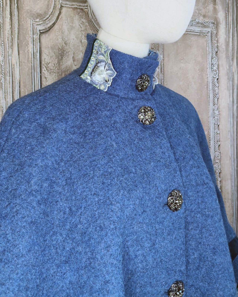 Cape en laine bleue et galon brodé bleu doublure Liberty