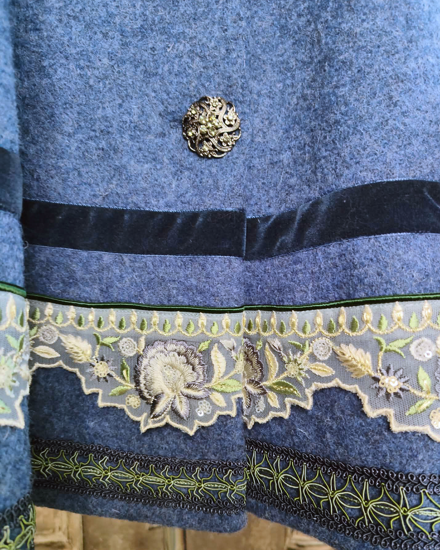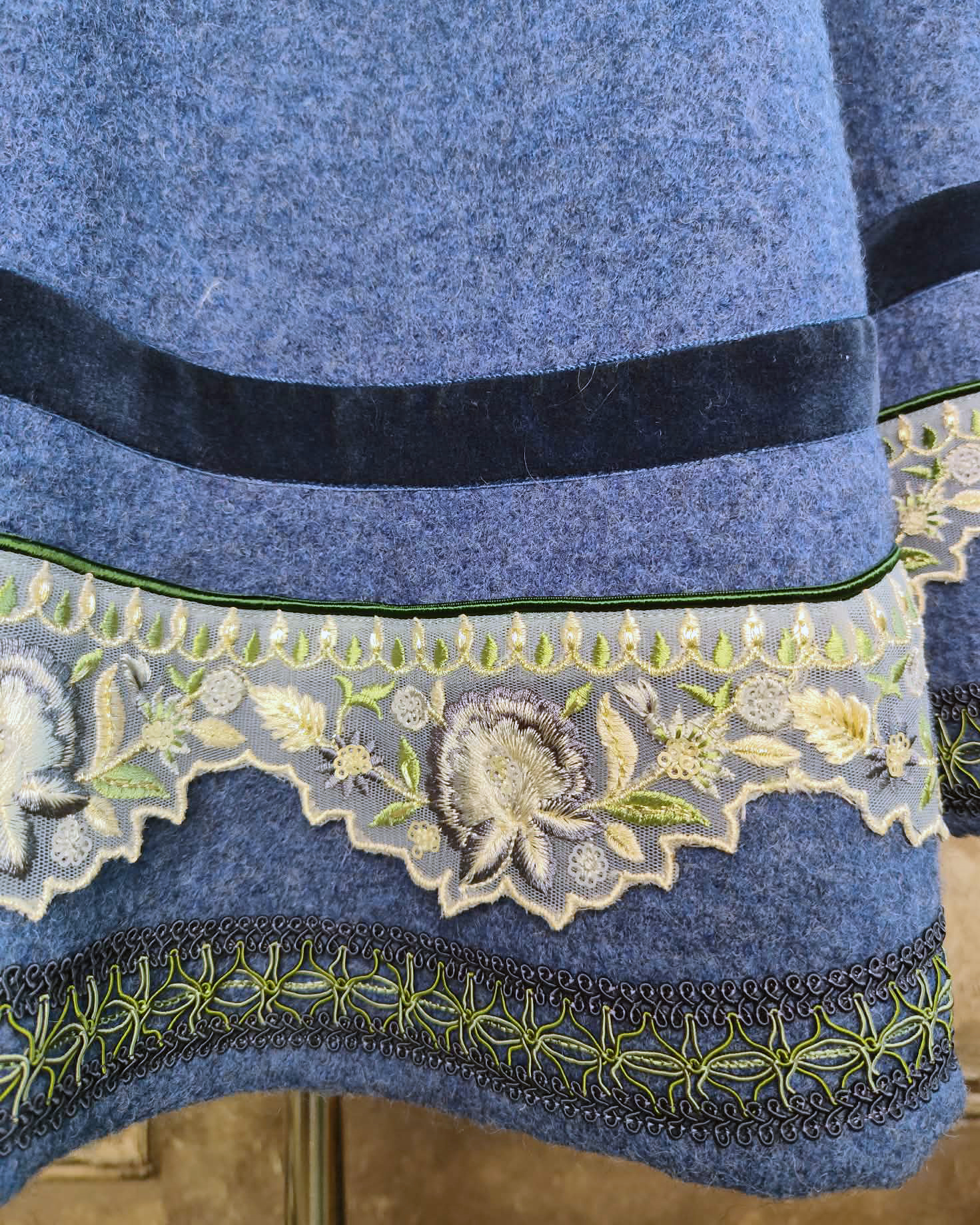 Pour cette cape j'ai choisi une coupe simple avec un petit col montant et des détails soignés : un galon de tulle brodé, un rang de velours bleu, de la passementerie bleu et vert, un passepoil de satin vert.