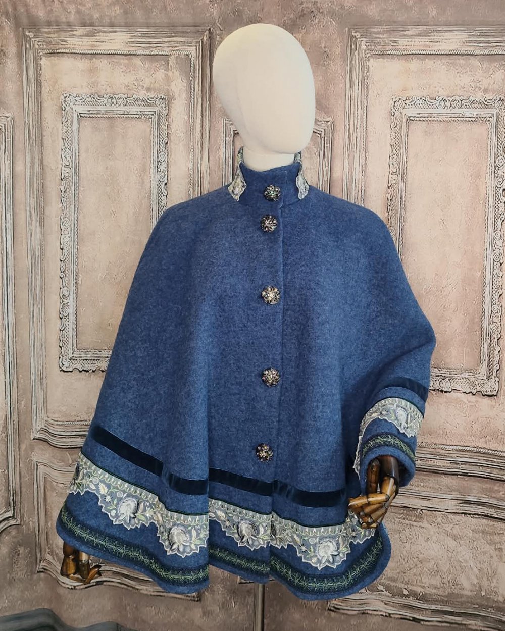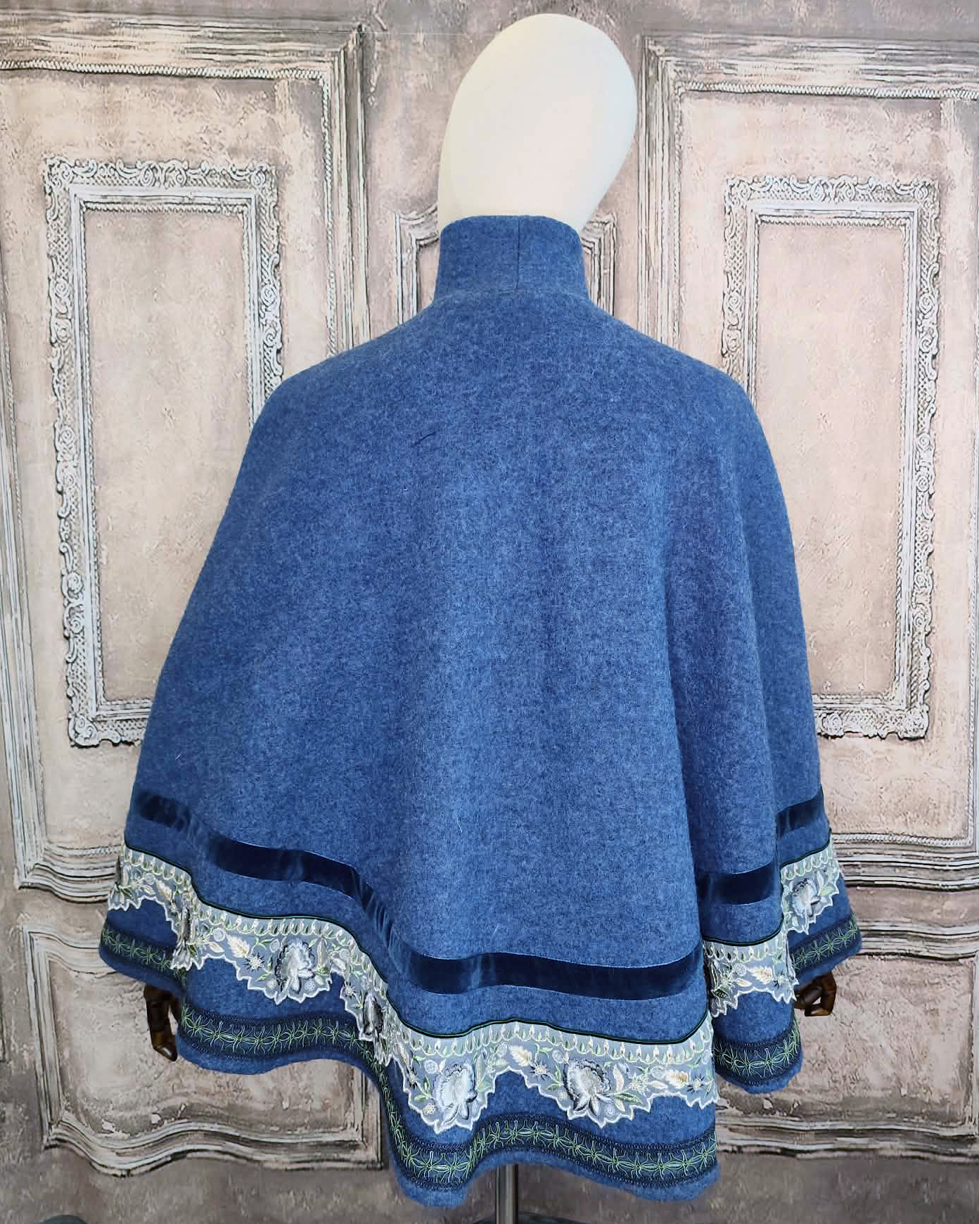 Cape bleue en laine et ruban brodé bleu et argent.