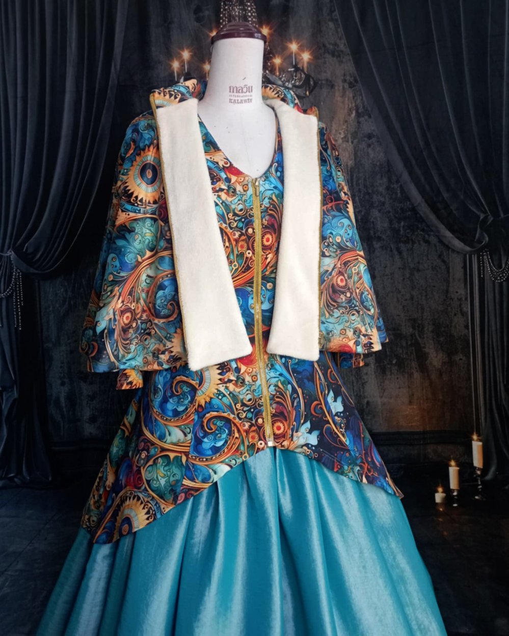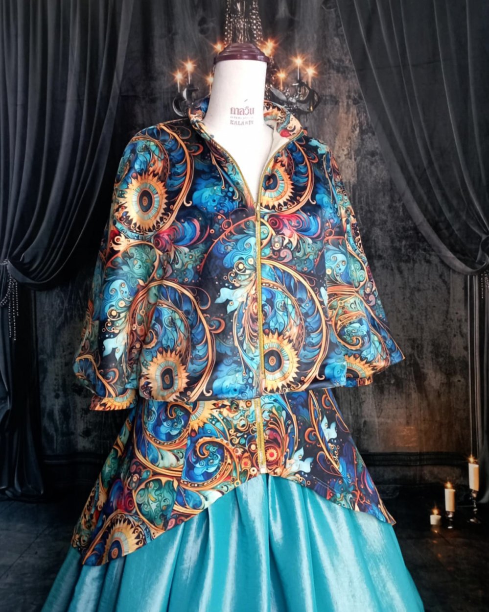 Une cape très unique, dans des couleurs chaudes, et un magnifique imprimé bleu et doré.