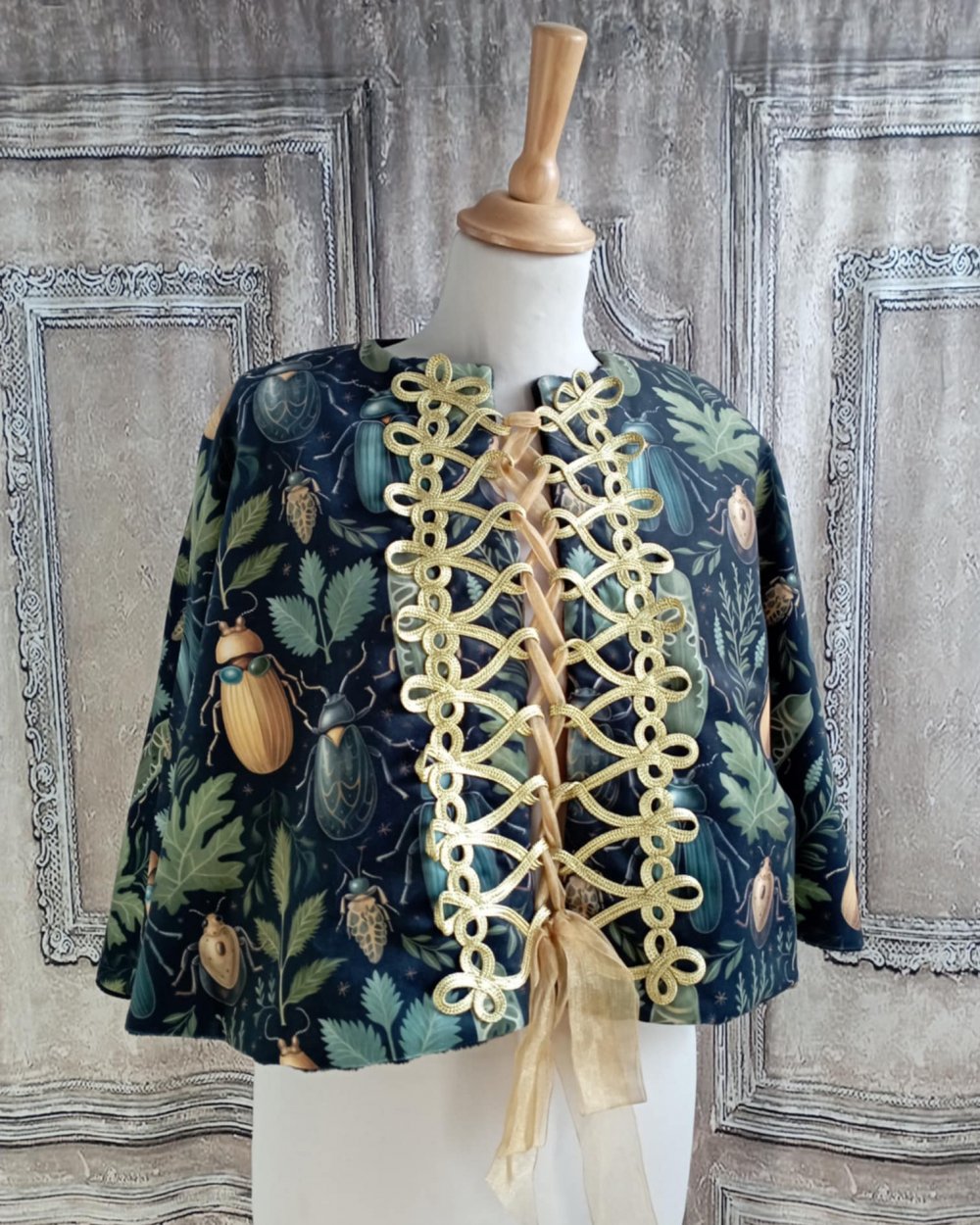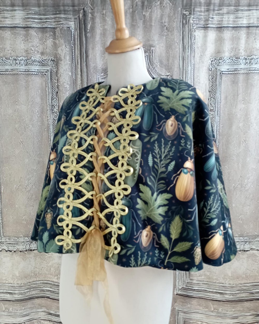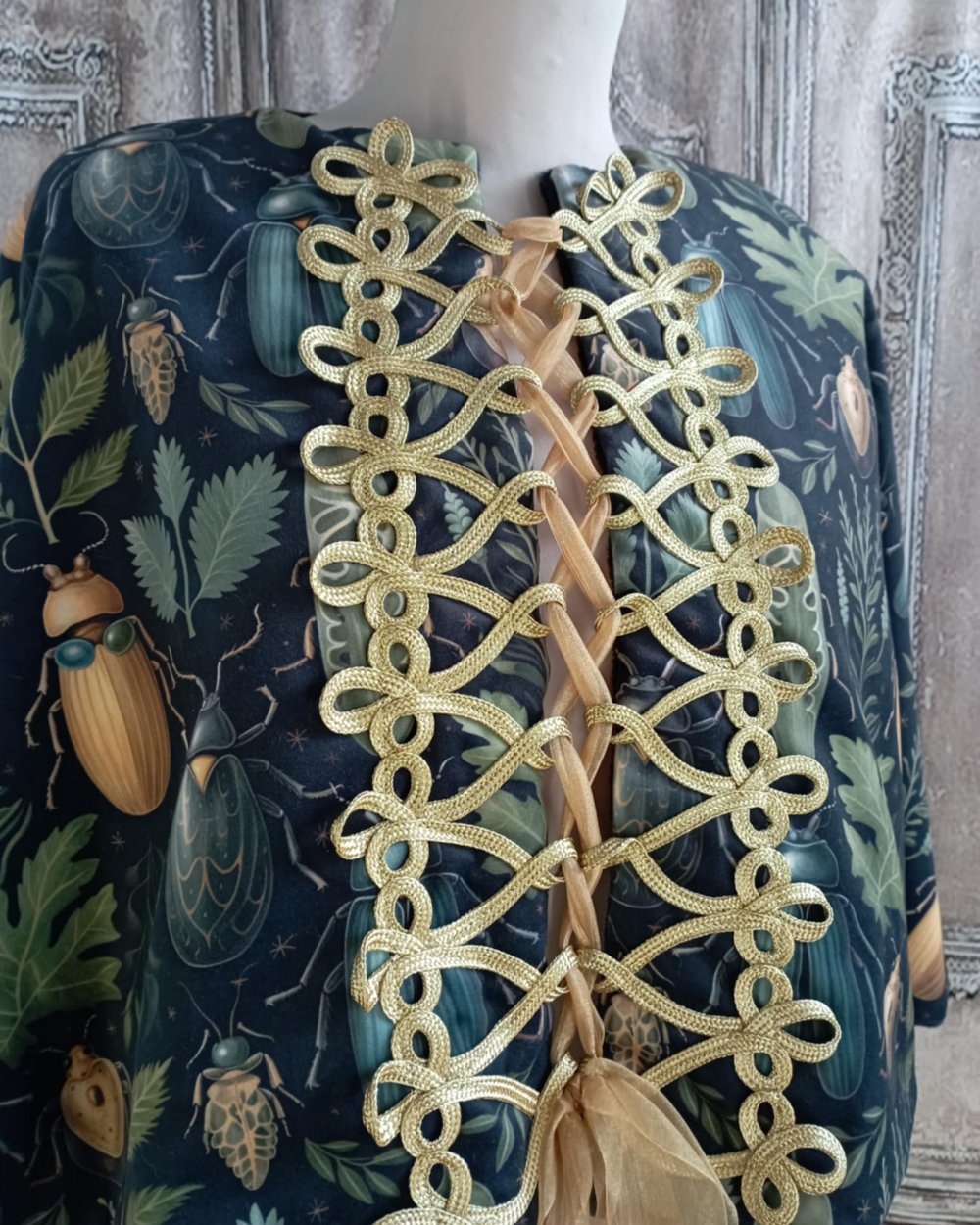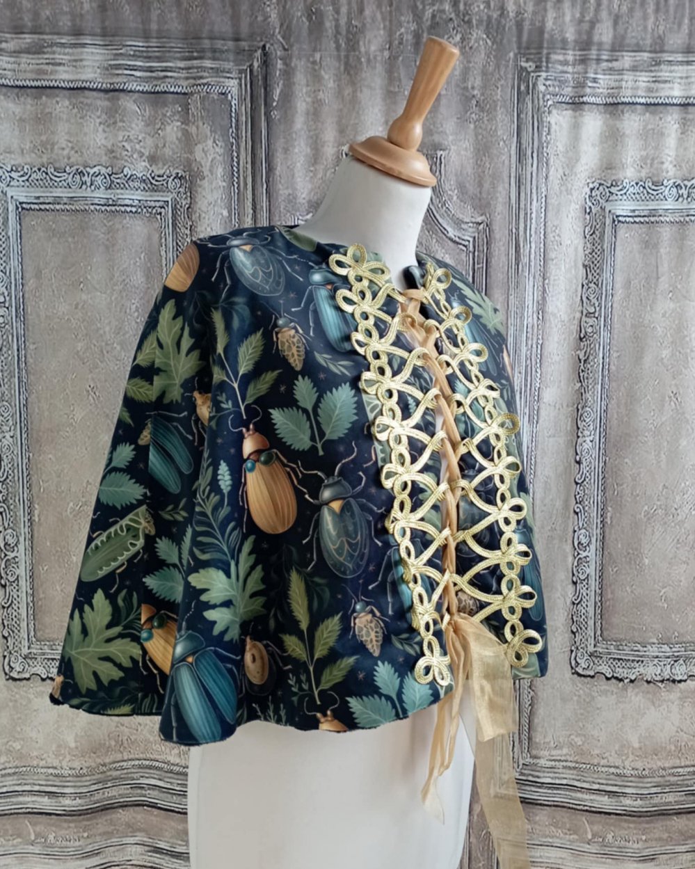 Une cape très unique, dans un coloris noir classique, et un magnifique imprimé insectes en jaune et vert, avec un grand brandebourg façon Hussard en fil lurex doré sur l'avant