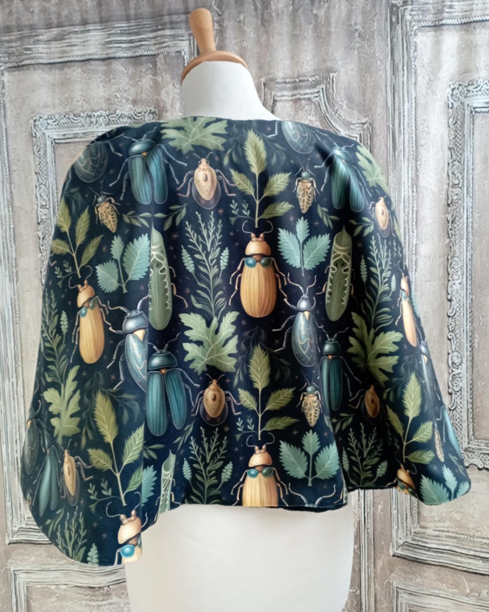 Cape noire imprimé insectes scarabées et brandebourg doré