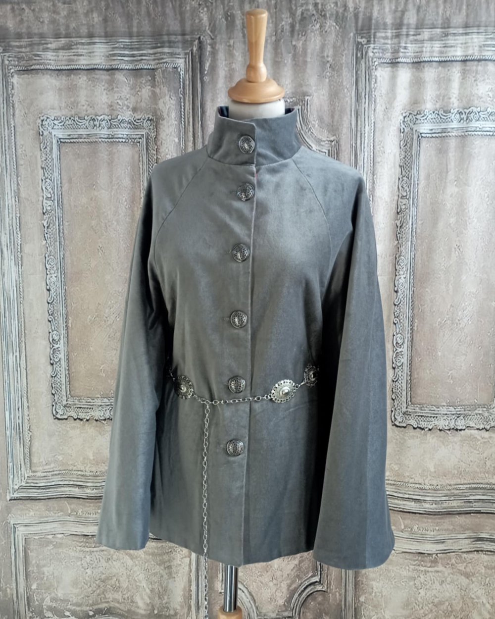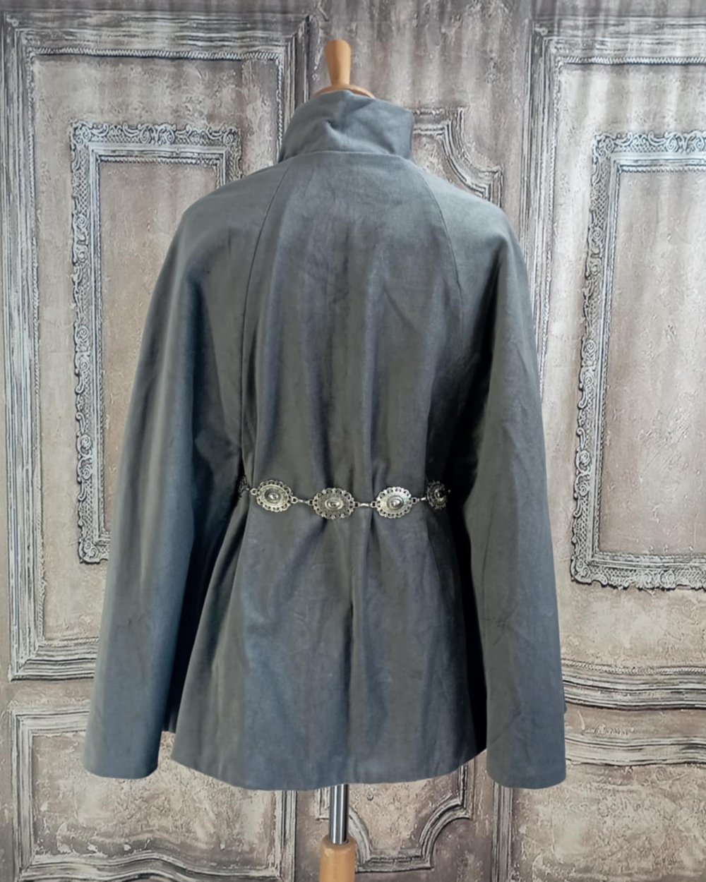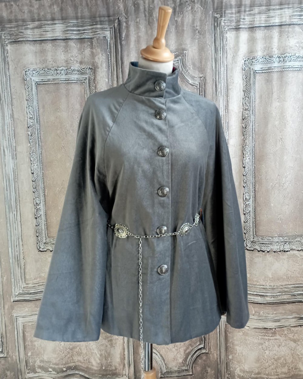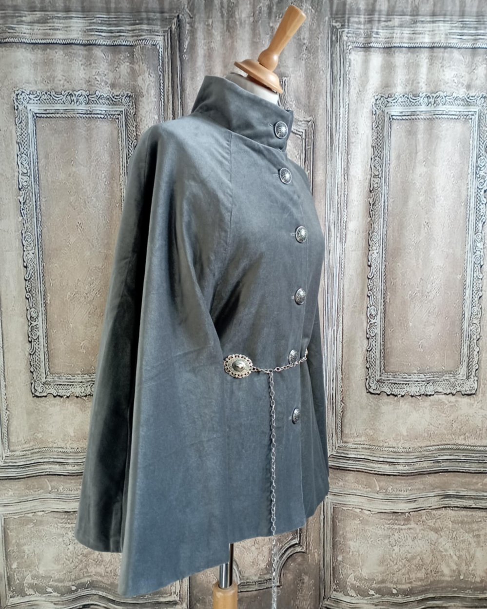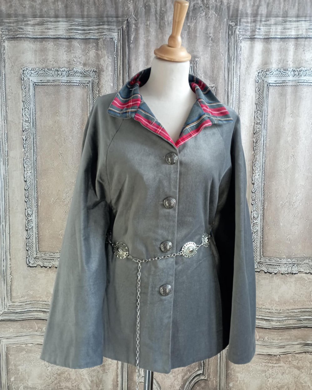 Cape en velours gris et doublure en écossais gris. Cape ou pas cape en velours de coton gris et ceinture argentée. Pour cette cape j'ai choisi un velours de coton, et une doublure en tissu écossais gris. La coupe est simple avec un col montant. L'originalité de cette cape est double : une ceinture en métal argenté réglable permet de la cintrer sur l'avant et le dos et de créer un effet de manches sur les cotés. La doublure en écossais gris se devine dans le bas de la cape et au niveau du col. Elle se ferme par une rangée de boutons argentés. Au final une coupe sobre, des détails argentés et une doublure fantaisie pour une pièce unique.