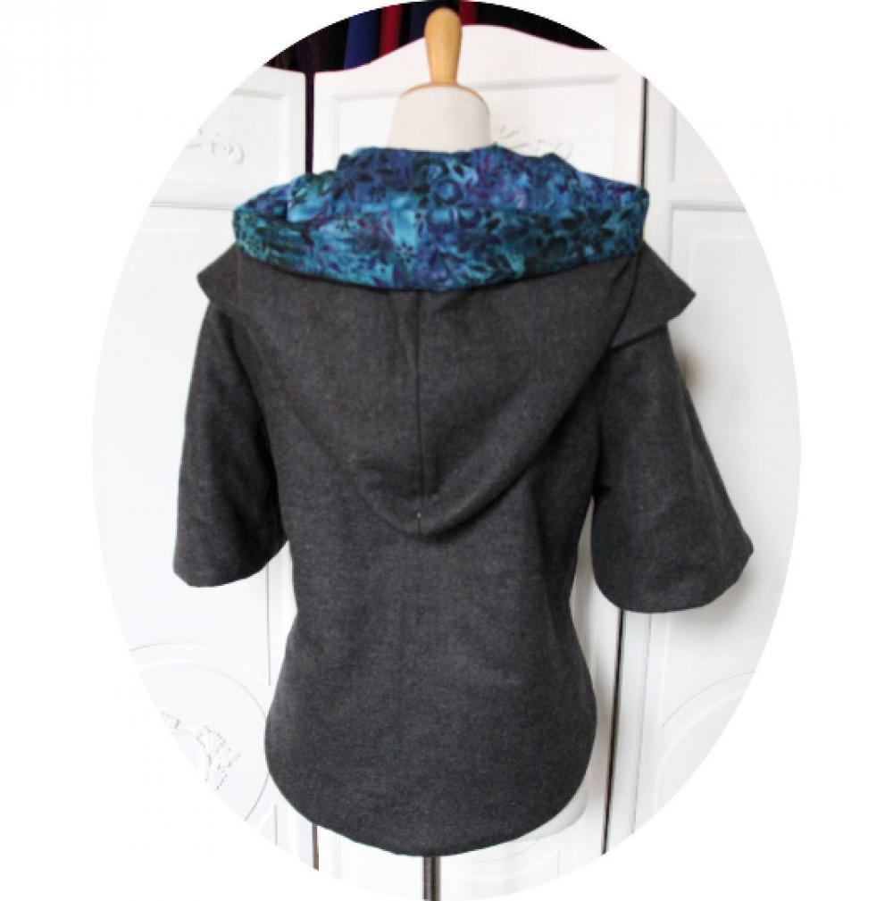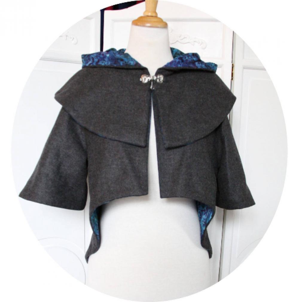 Une petite capeline a capuche en pure laine gris anthracite, toute doublée en coton batik bleu mauve et vert.