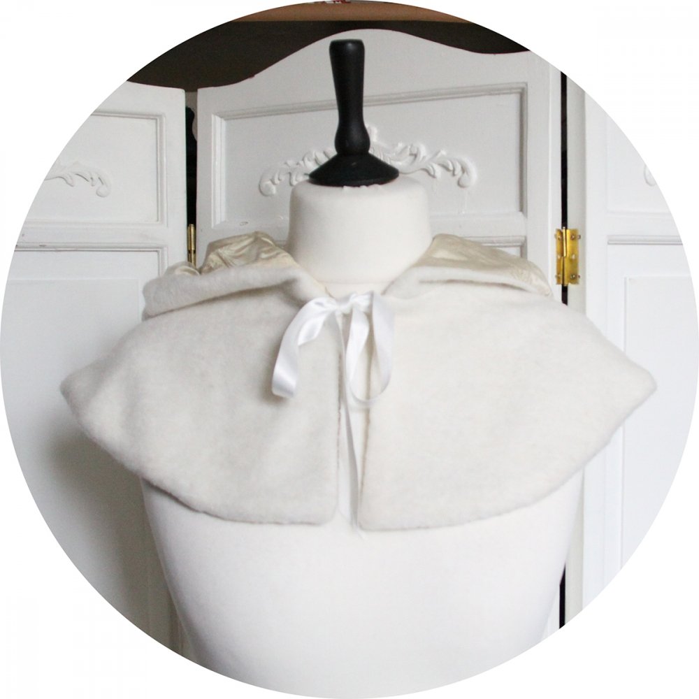 Une petite capeline a capuche en pure laine ivoire souple et douce dans un coloris écru classique, toute doublée en brocard crème.