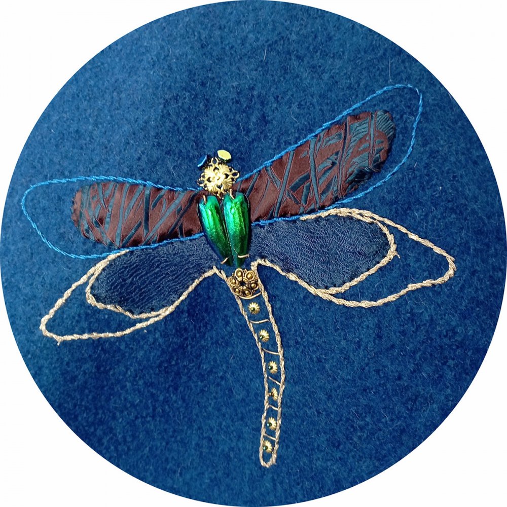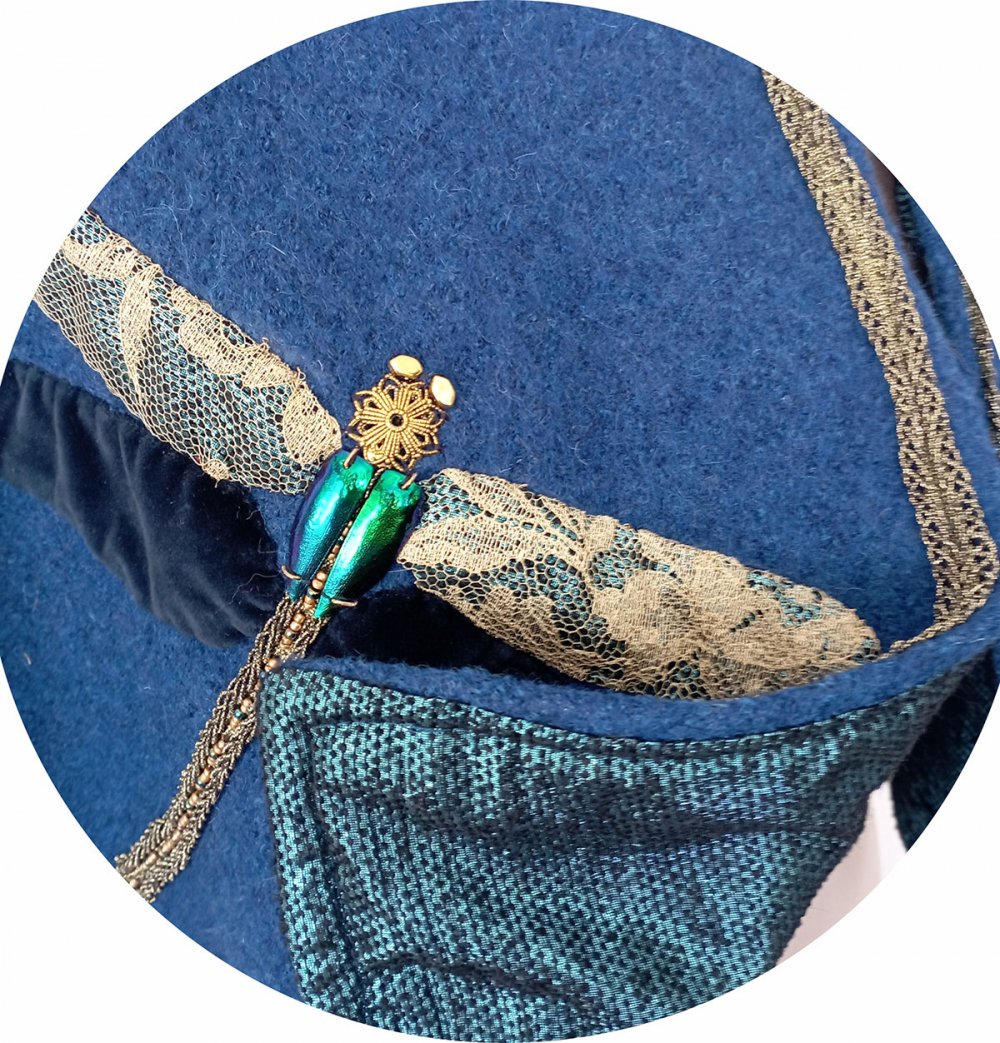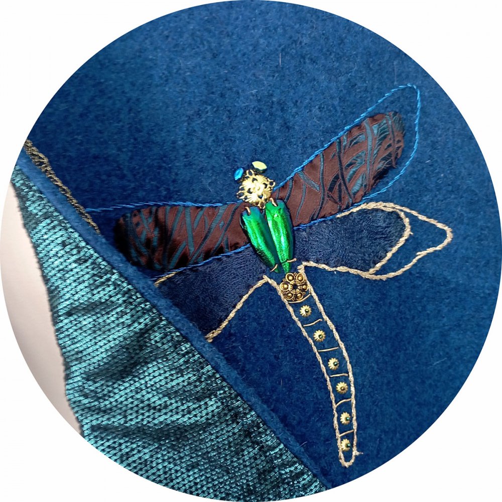 Pour cette capeline en laine, j'ai repris mon motif de libellulre et broderie et appliqué de tissu, que j'avais mis au point pour une pièce de concours et décliné en décembre 2022 sur des manteaux. Les libellules sont composées de broderie, perles, velours bleu marine, de la dentelle de Calais dorée, du brocard, pièces métalliques, hélitres de scarabée, de l'organza métallique italien...
