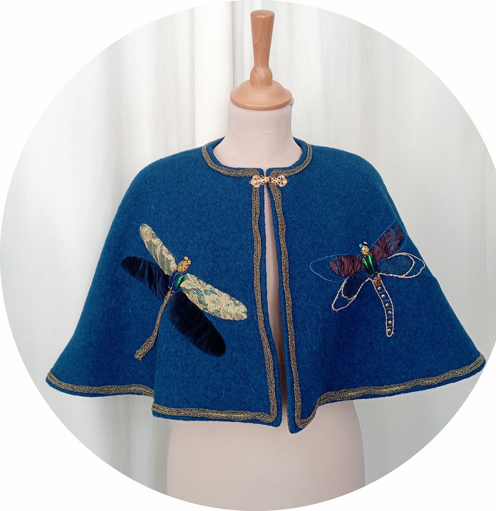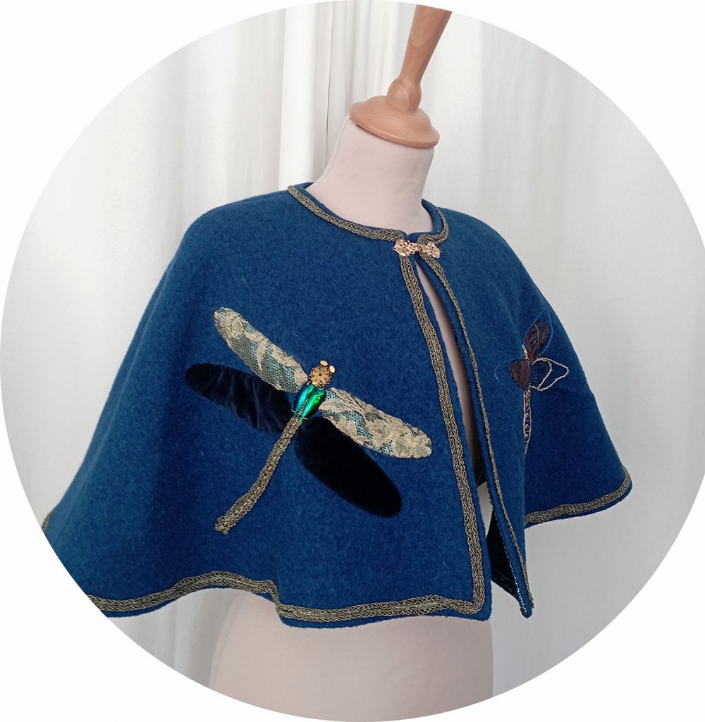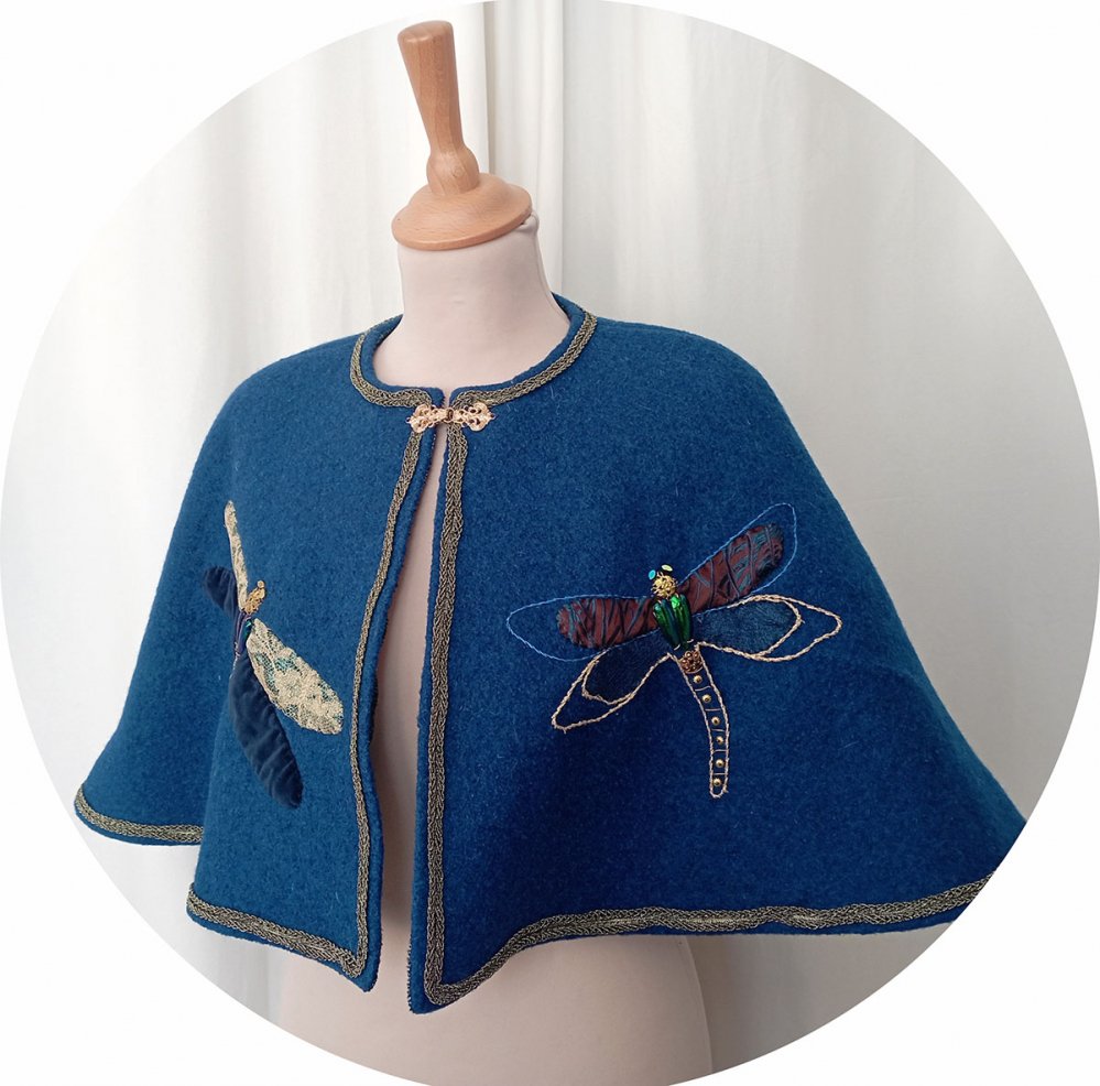 Cape bleue en laine bouillie brodée de libellules bleu et or.