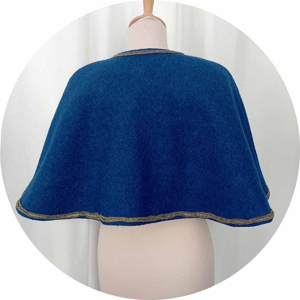 Une cape bleue très unique, en pure laine bouillie bleue et une jolie doublure en brocard bleu irisé. Cette cape en laine bleue est soulignée d'un galon de passementerie doré et fermée au cou par une attache en métal doré.