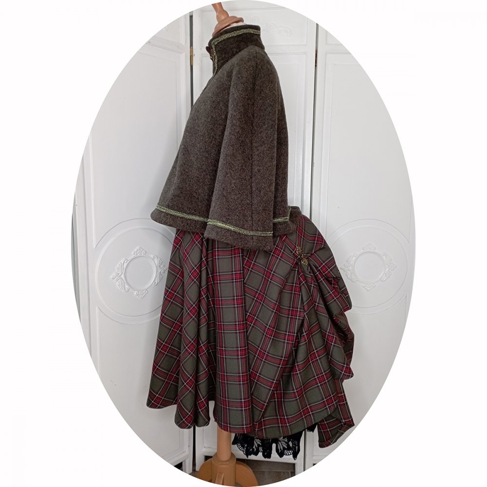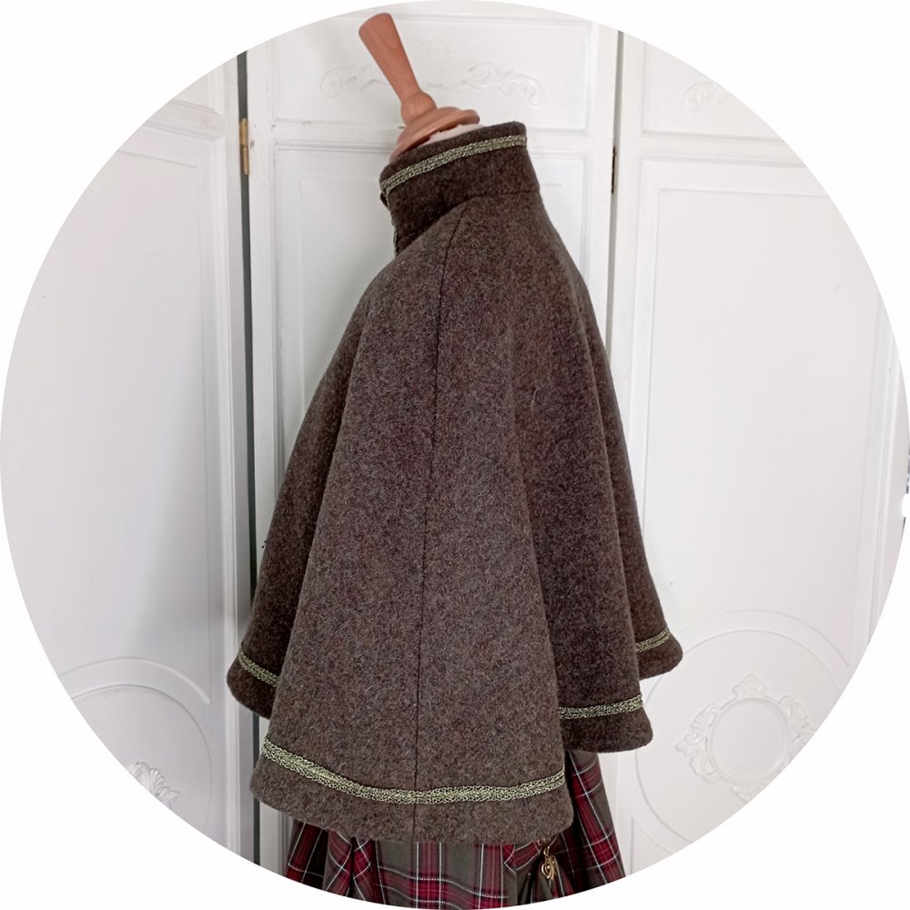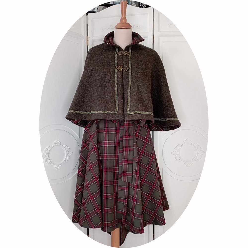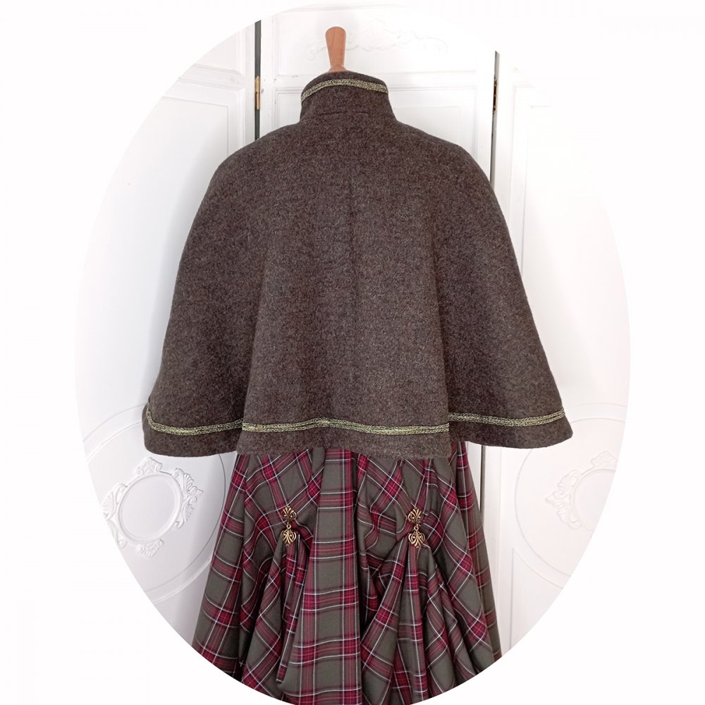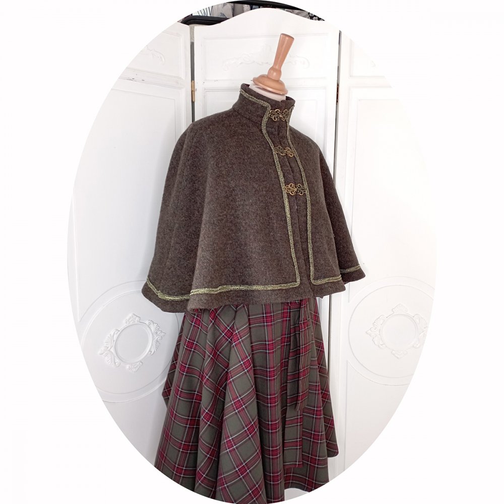 Une cape vert armée très unique, en pure laine bouillie chinée et une jolie doublure en tissu à carreaux vert et bordeaux. Cette cape en laine verte est soulignée d'un galon de passementerie doré et fermée par des attaches en métal bronze.