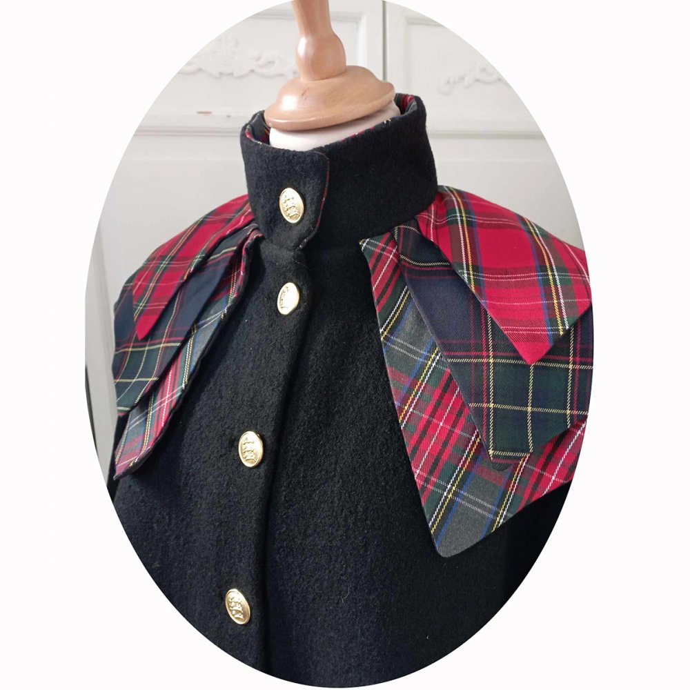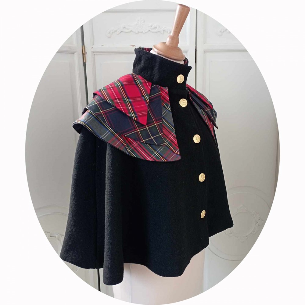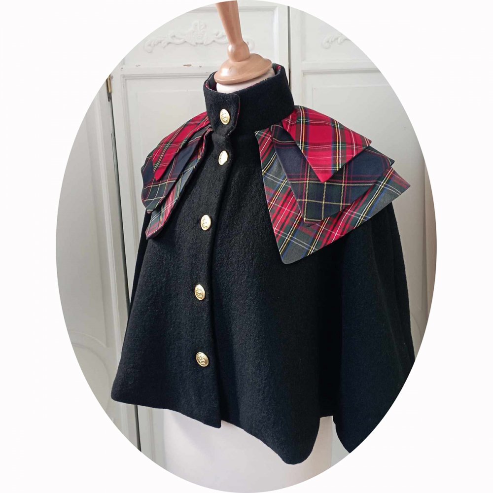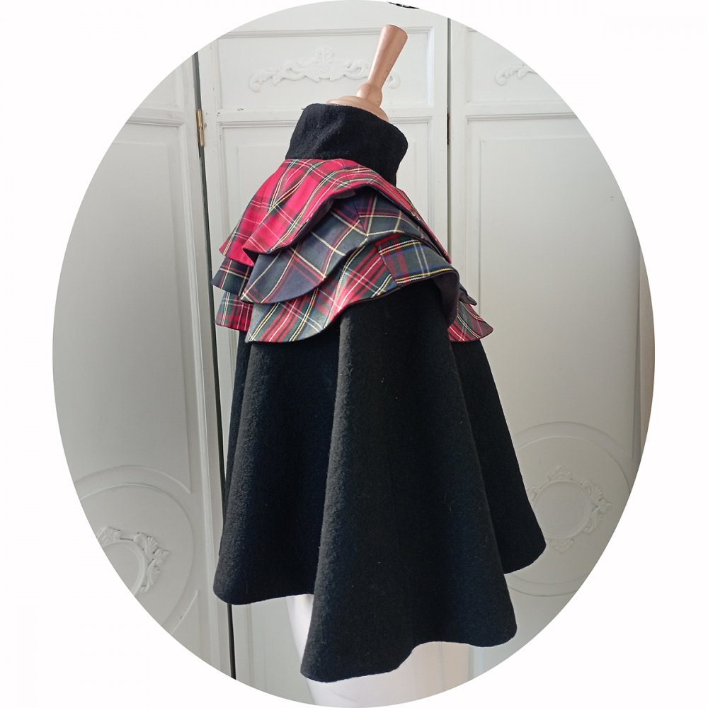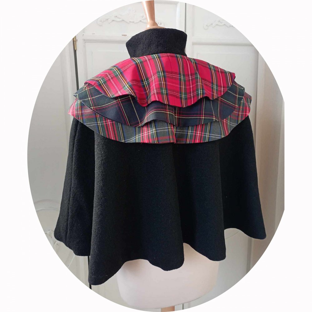 Cape noire en laine bouillie noire à volants d'épaule en écossais.