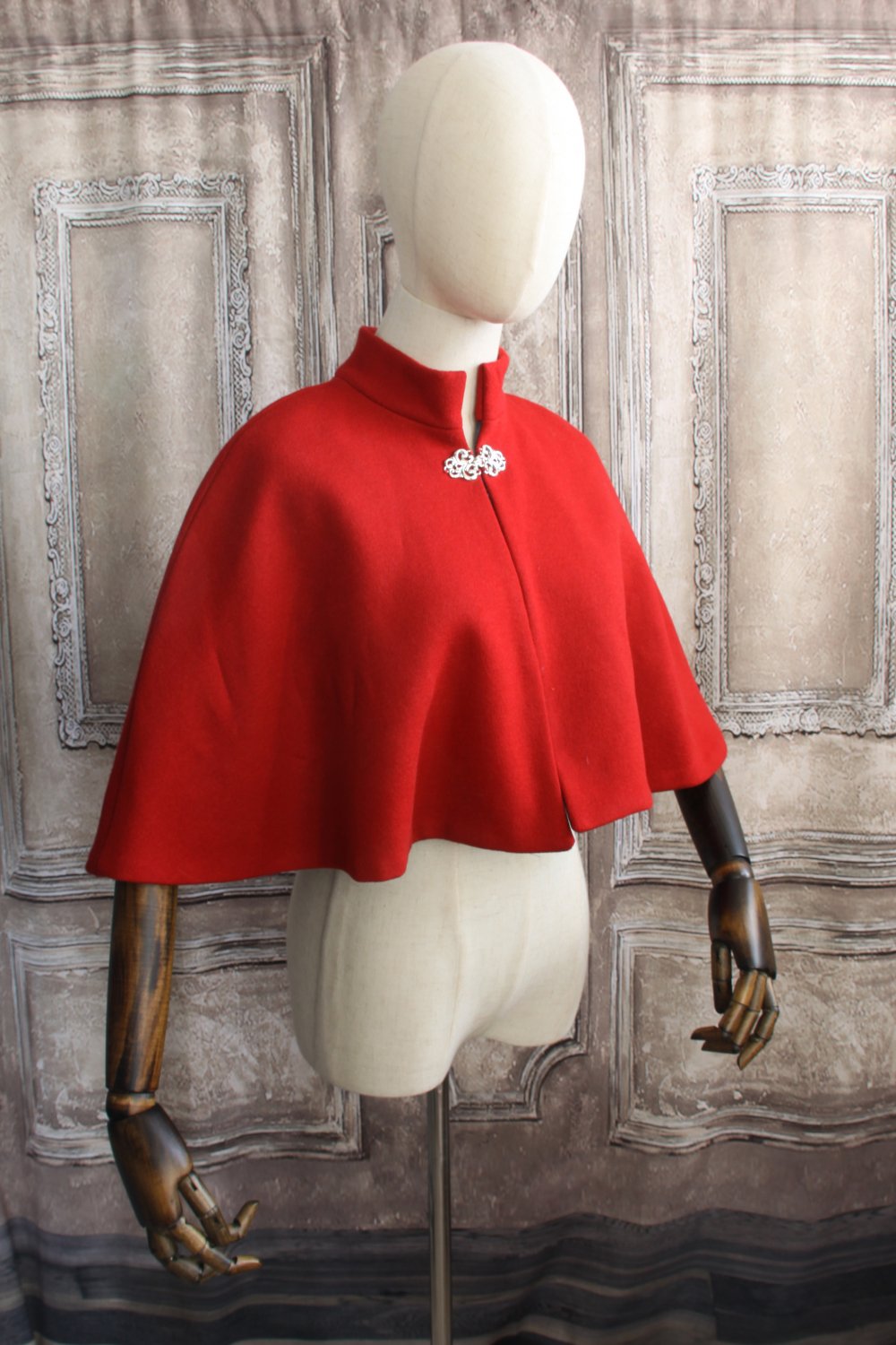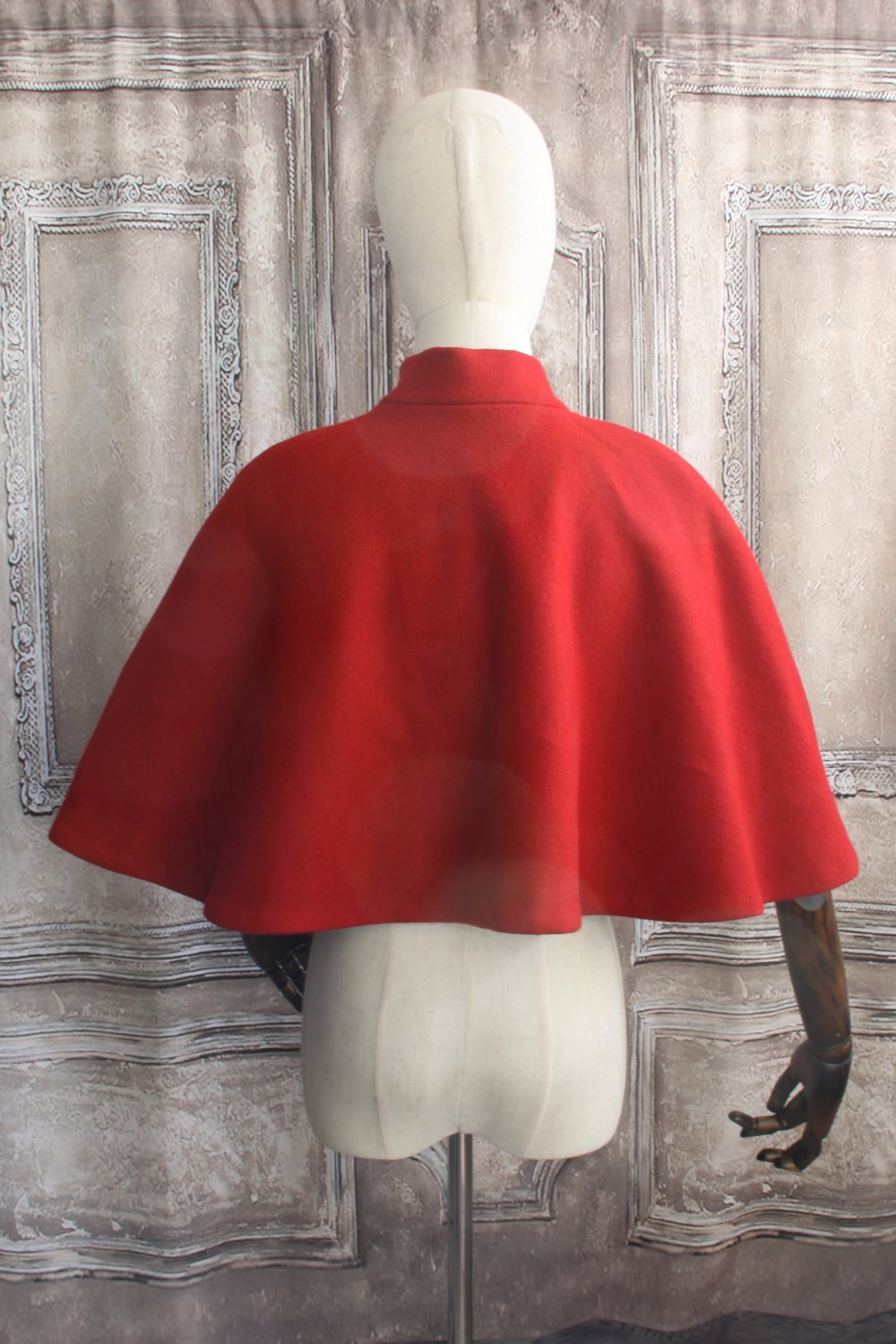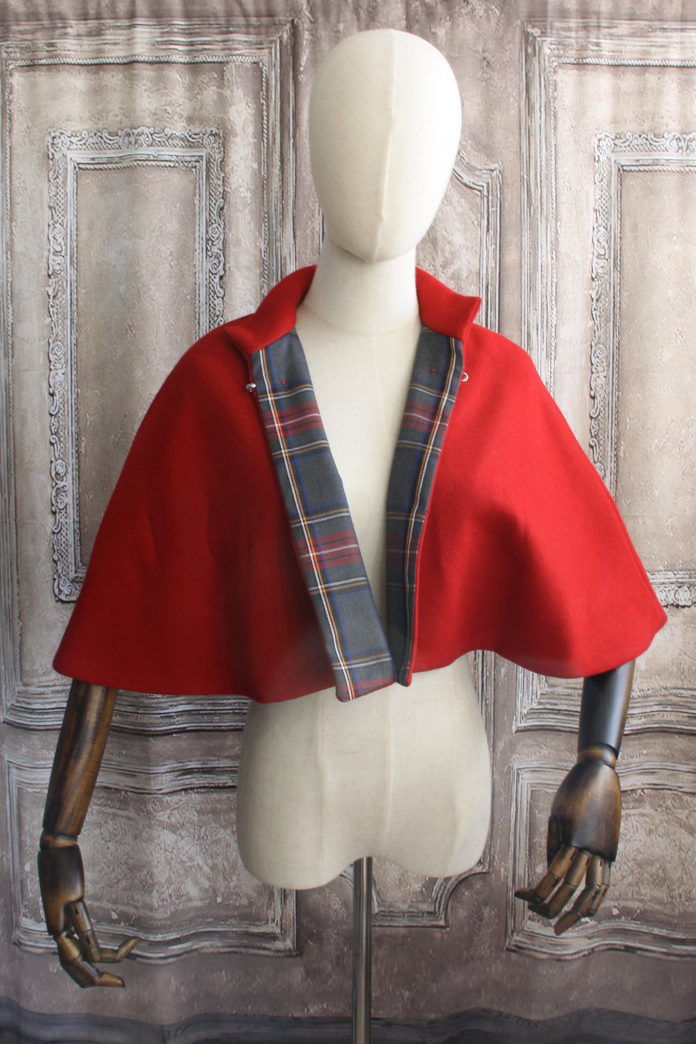 Une cape courte très unique, composée d'une maille de laine rouge vif. La capeline est doublée de tissu écossais gris et se ferme par une attache métallique au niveau du cou.