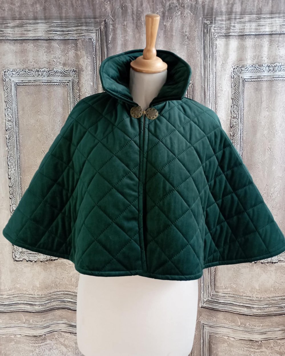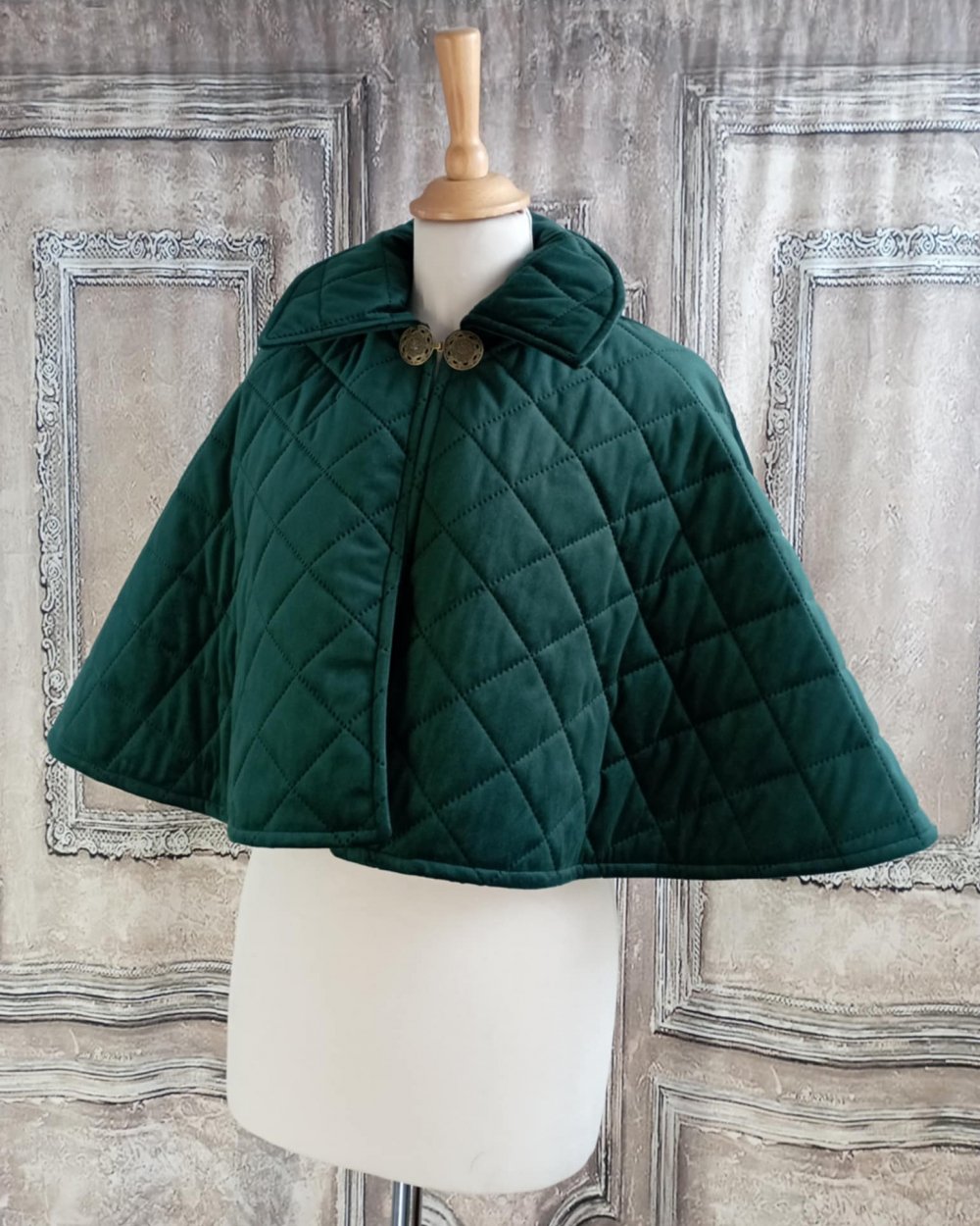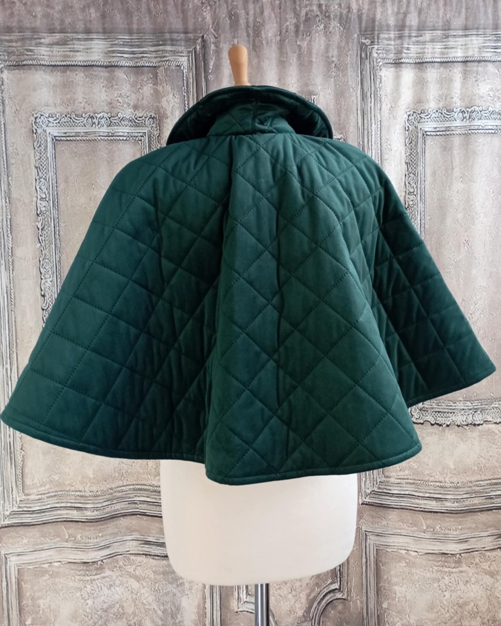 Cape vert émeraude en velours matelassé et doublure taffetas vert.