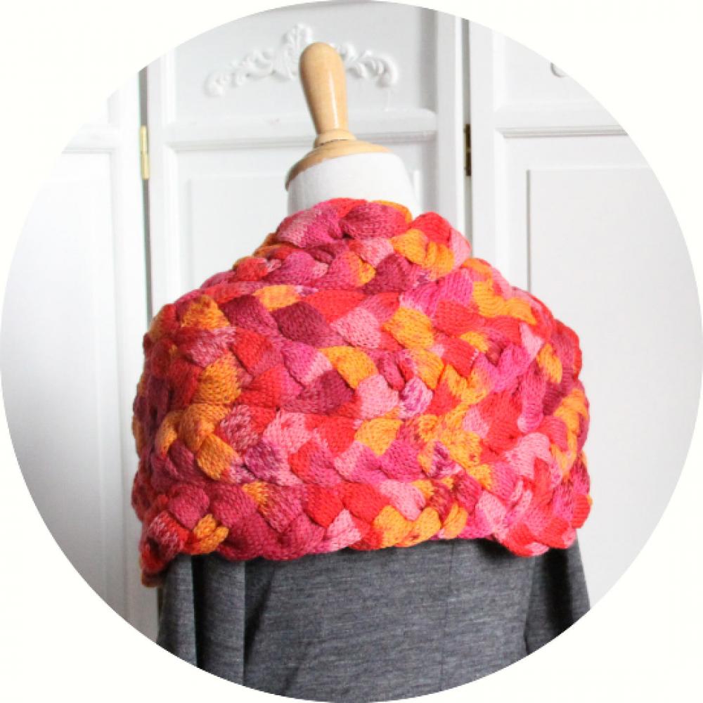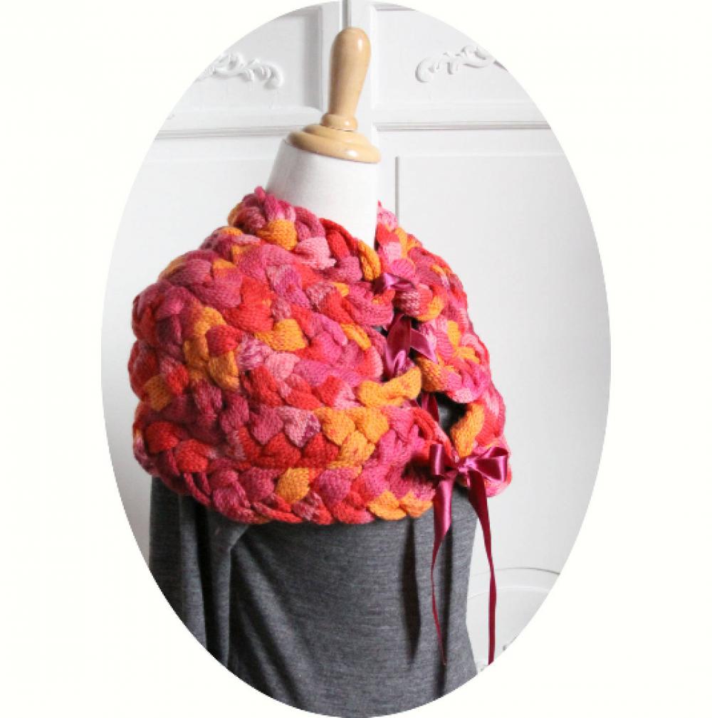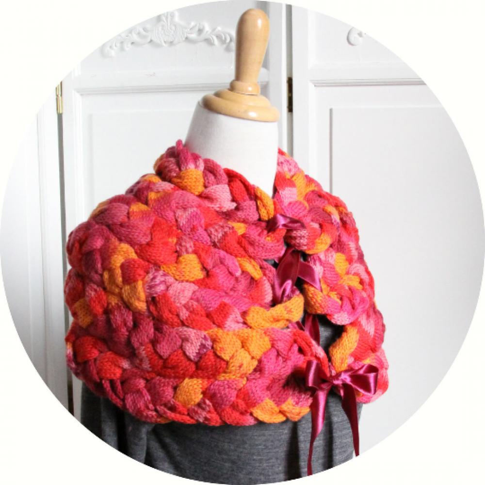 Chauffe épaule en laine chinée rose orange violet tricoté avec noeud en satin