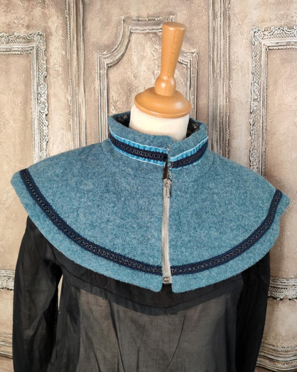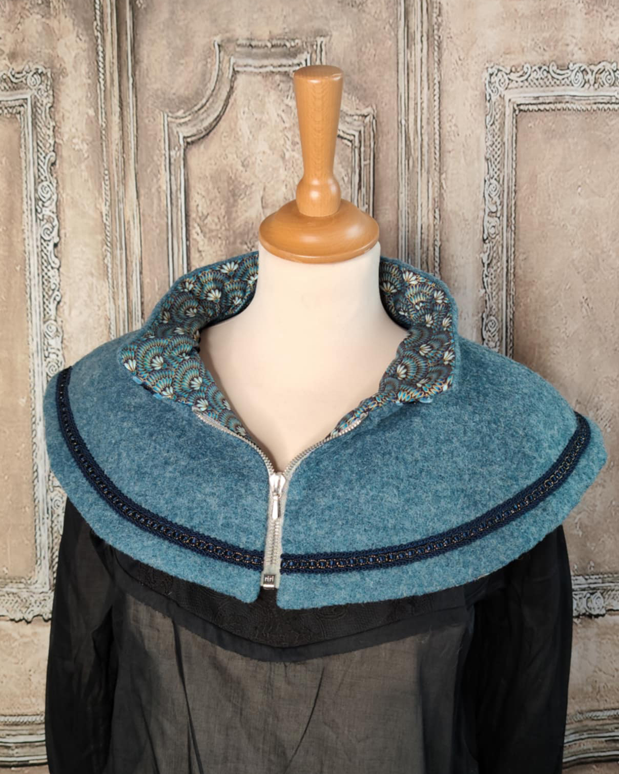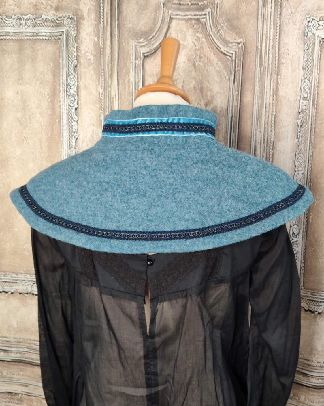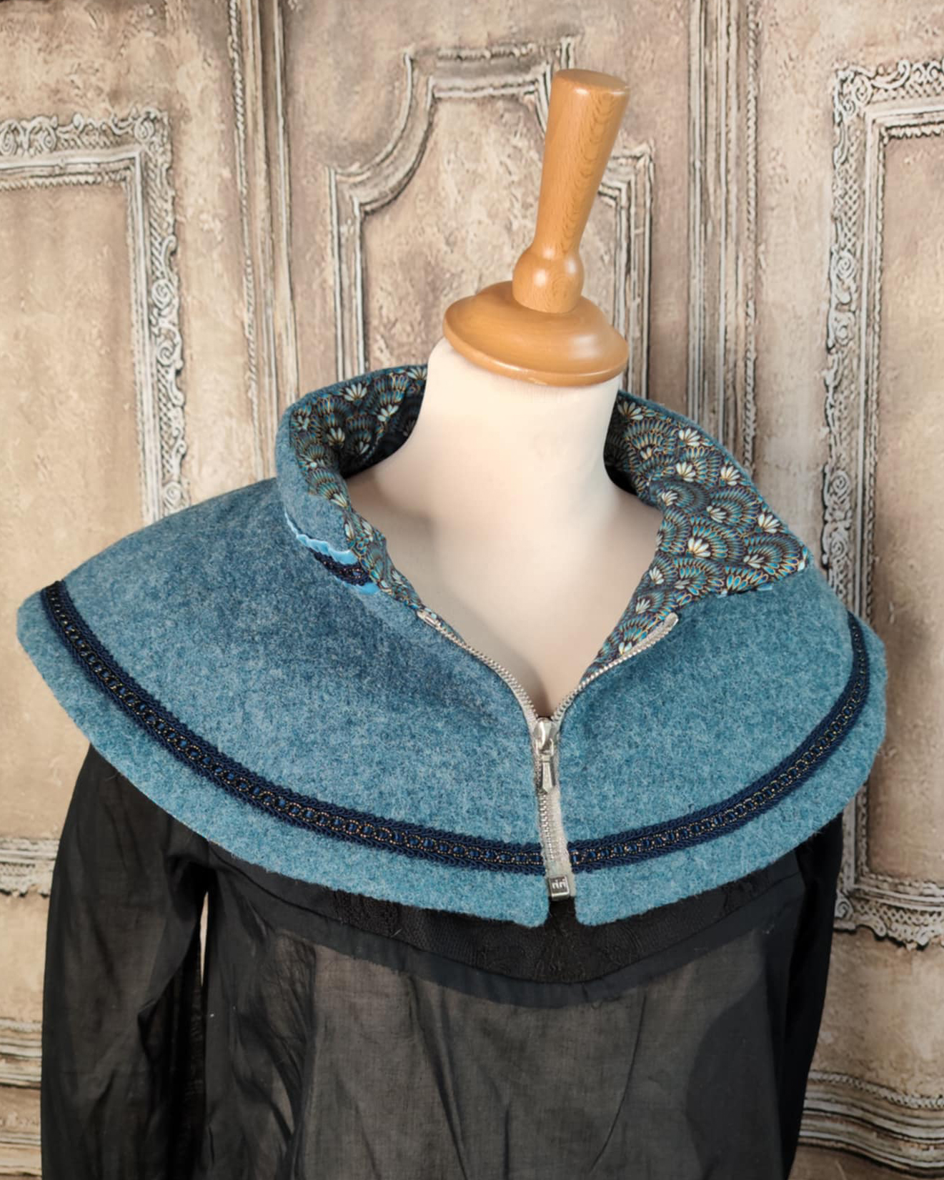Ce col - mini capeline est coupé dans une étoffe en laine bouillie bleue. Il se porte sur un pull, une veste, sous un manteau... Le tour du col est souligné d'une bande de passementerie bleu marine et doré et d'un ruban de velours bleu.