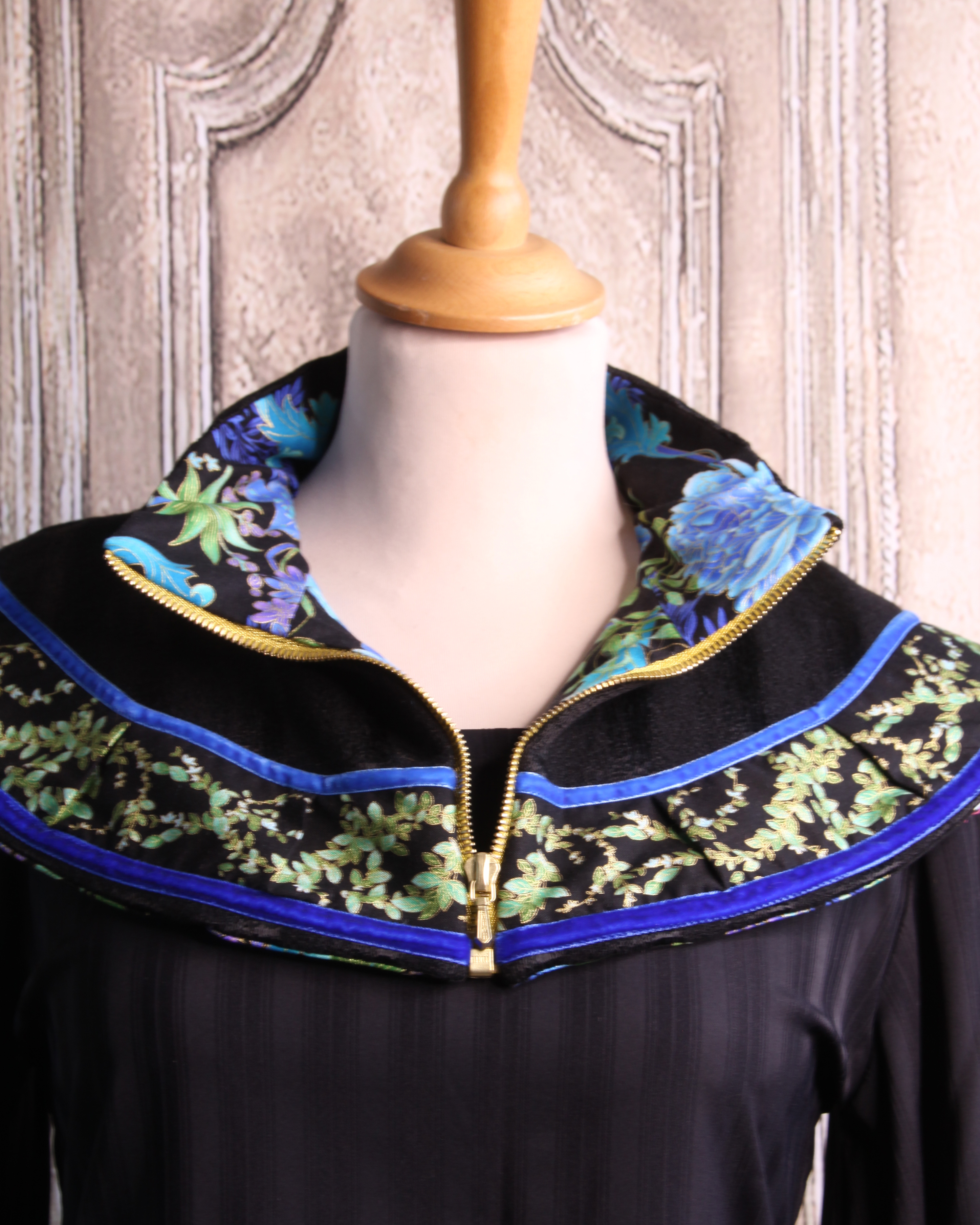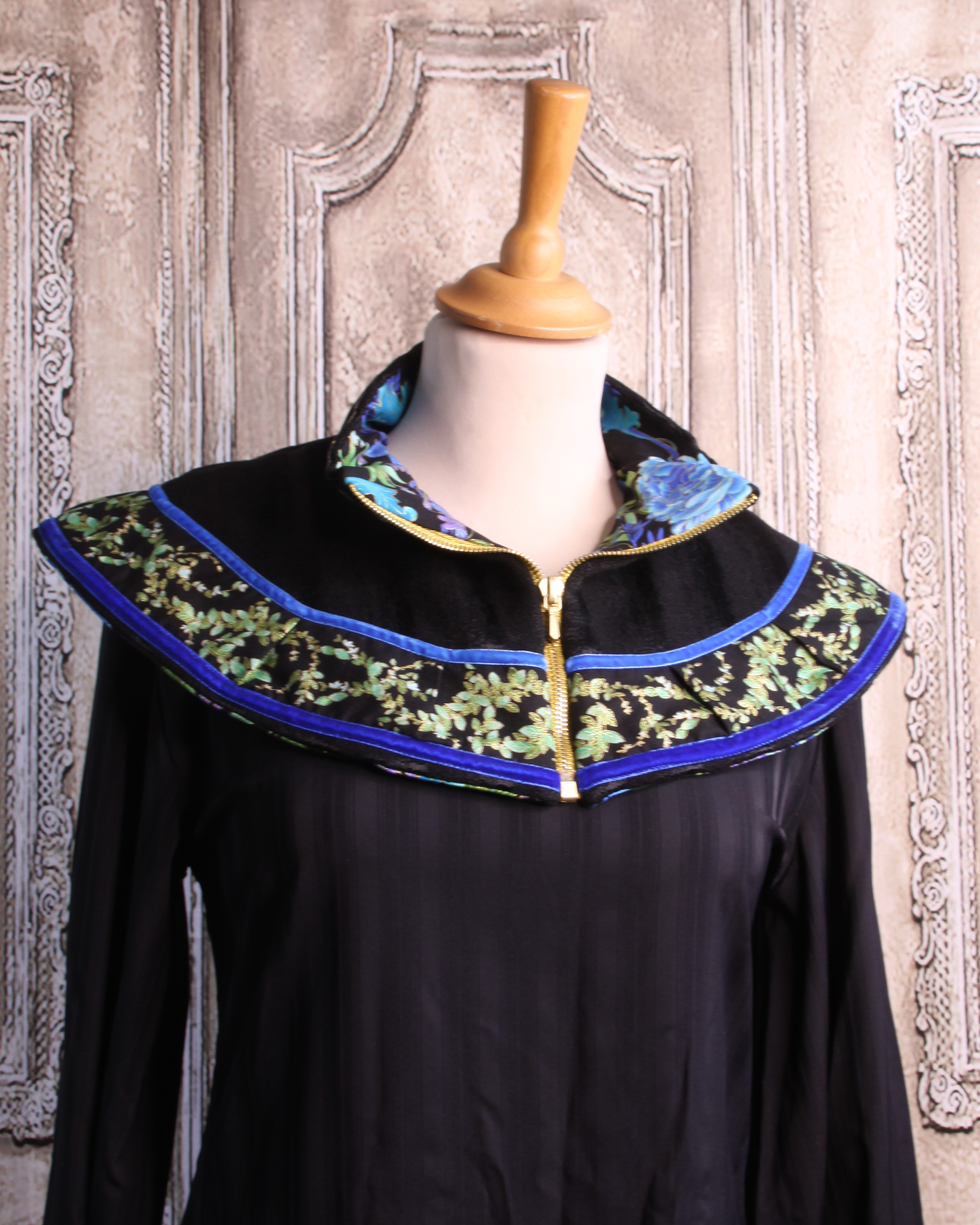Ce col - mini capeline est coupé dans une laine noire. Il se porte sur un pull, une veste, sous un manteau... Le tour du col est souligné d'un galon de coton imprimé de feuilles vertes et dorées et d'un ruban de velours bleu.