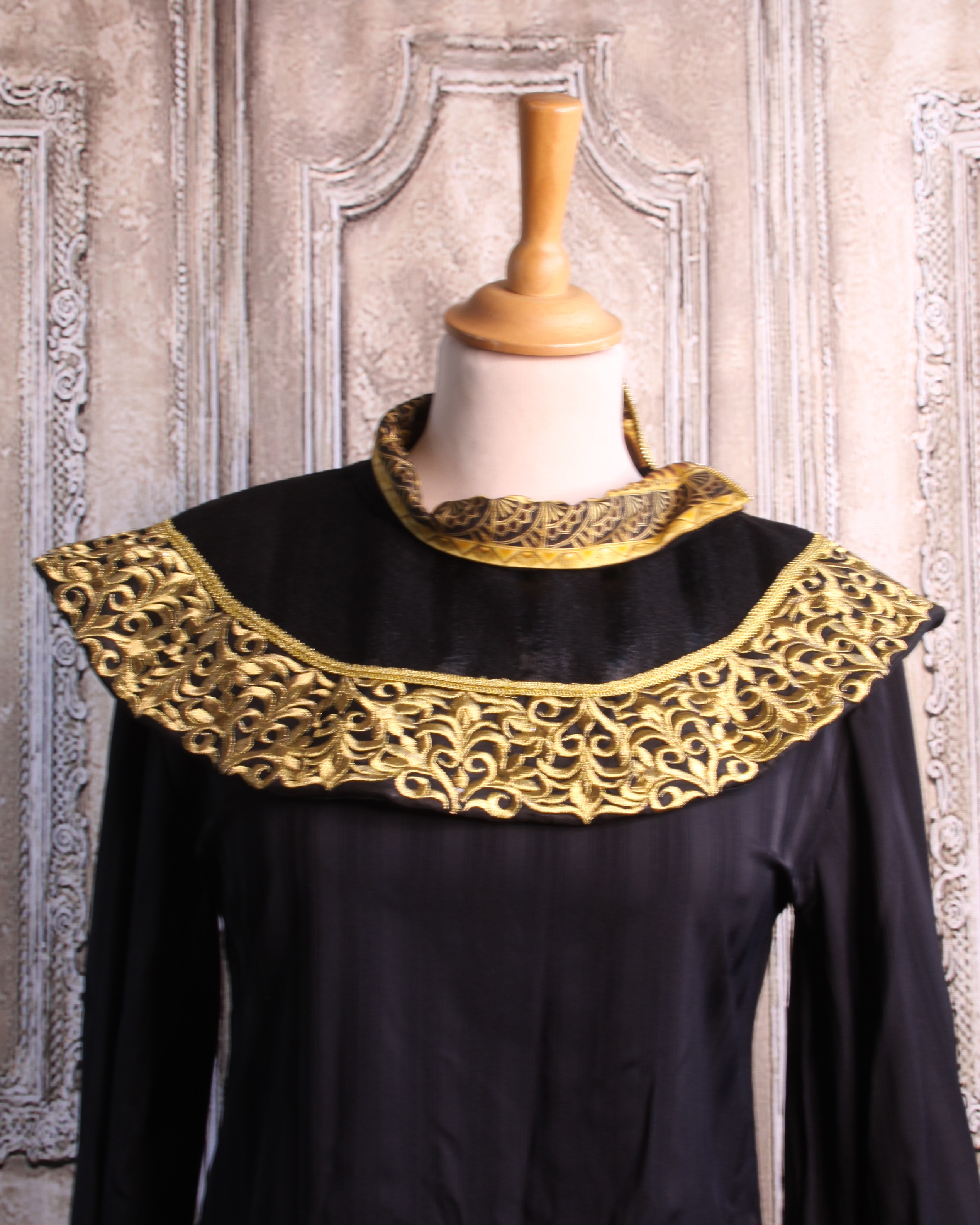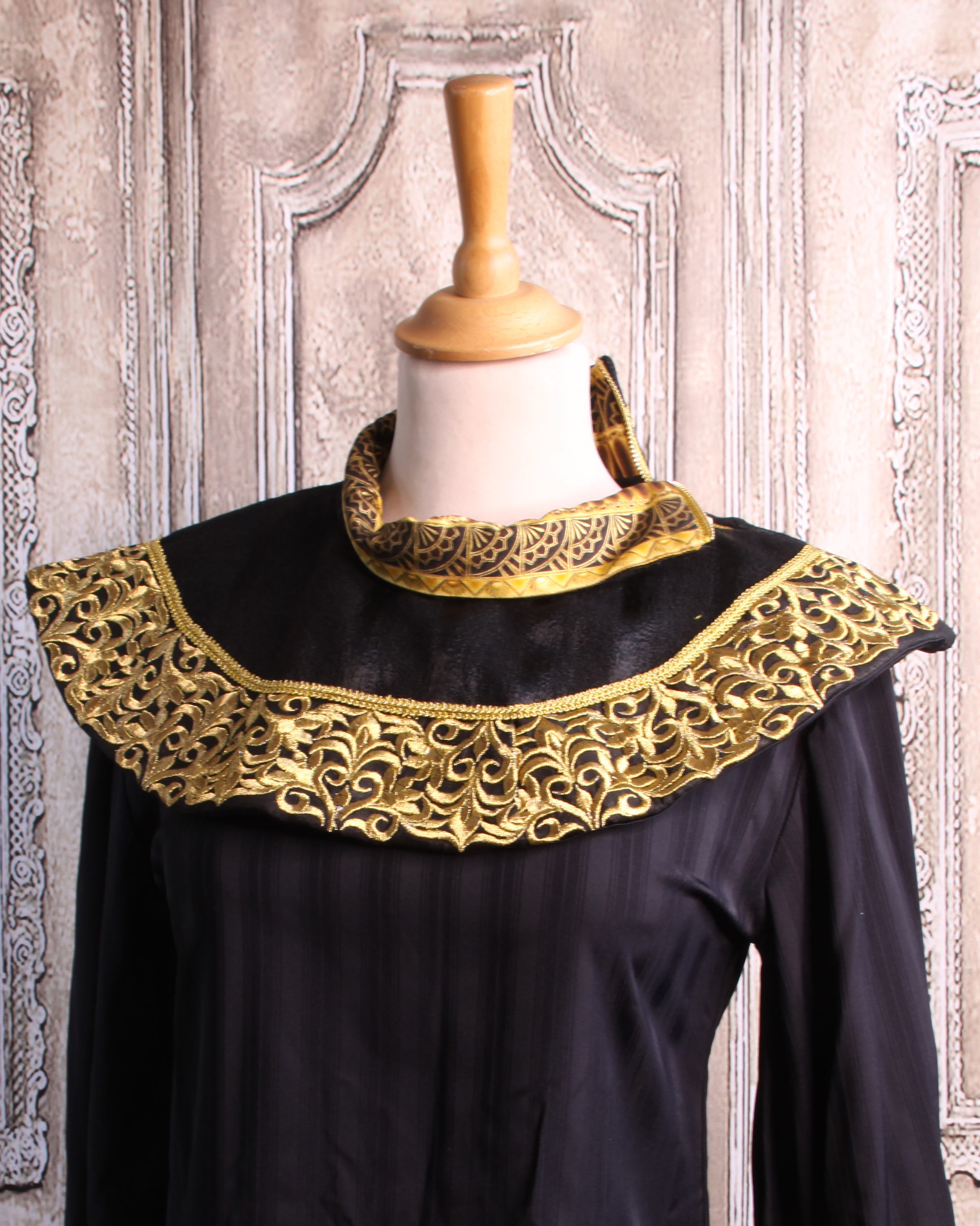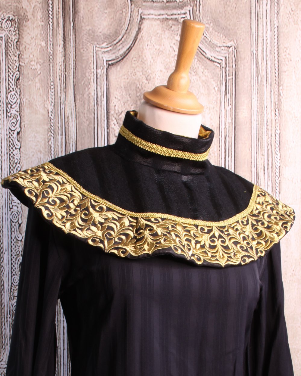 Ce col - mini capeline est coupé dans un drap de laine noire. Il se porte sur un pull, une veste, sous un manteau... Le tour du col est souligné d'un galon brodé noir et or et d'un galon de passementerie doré.