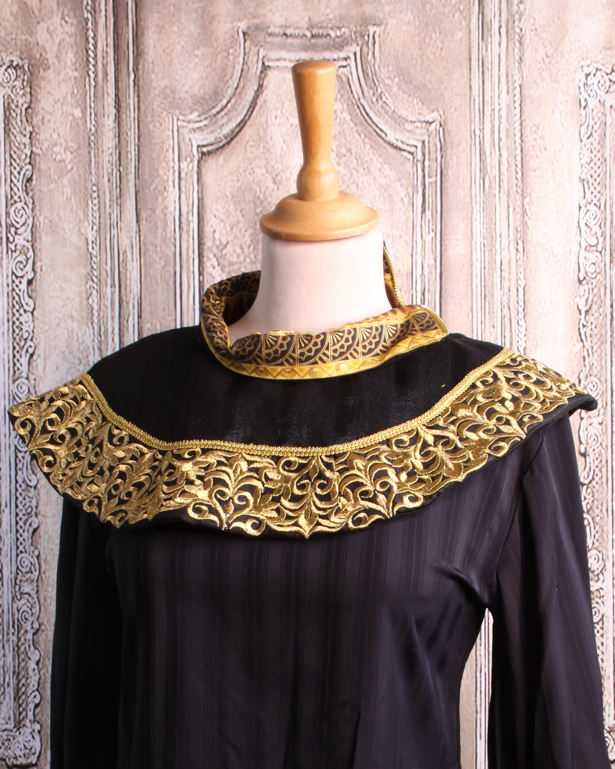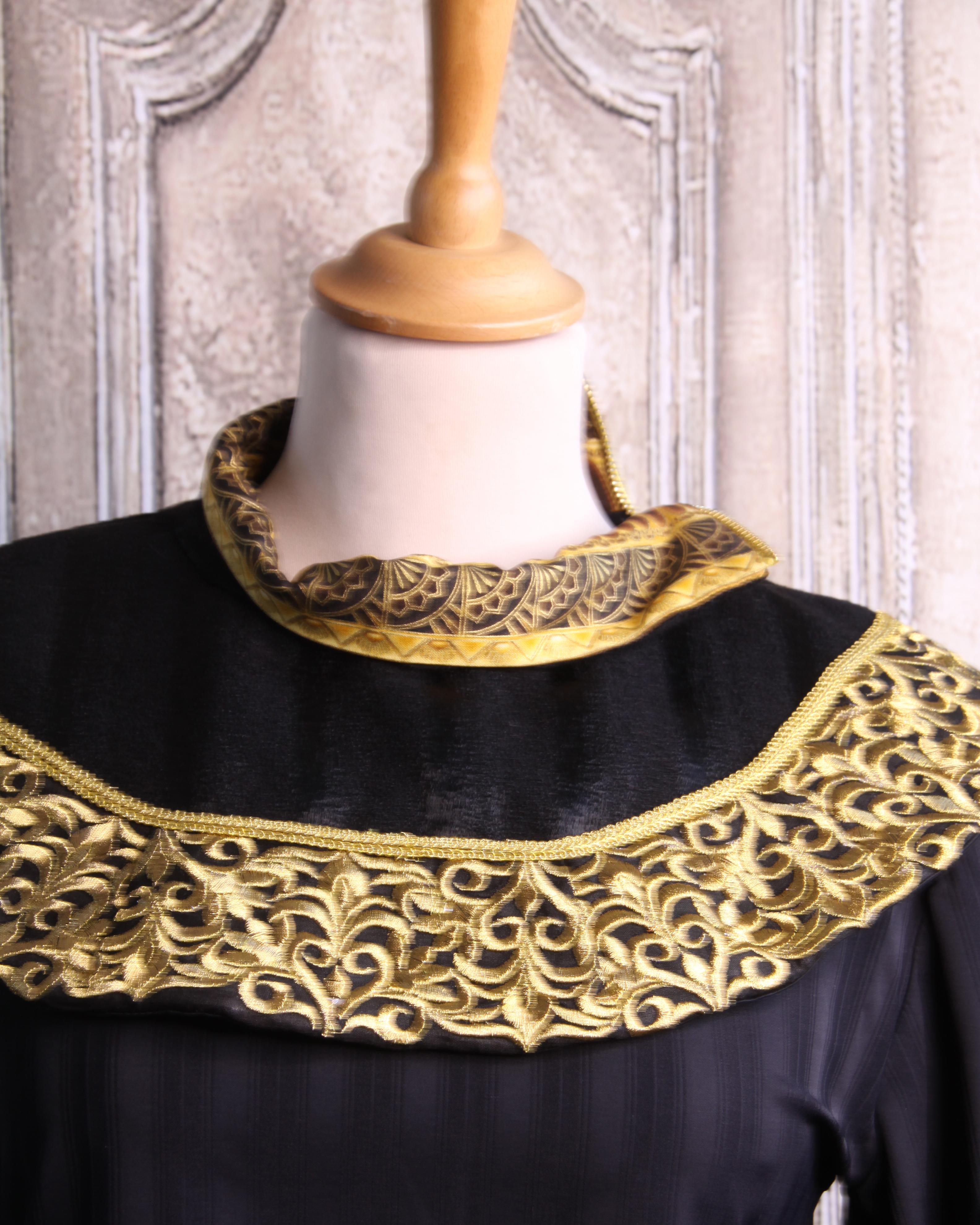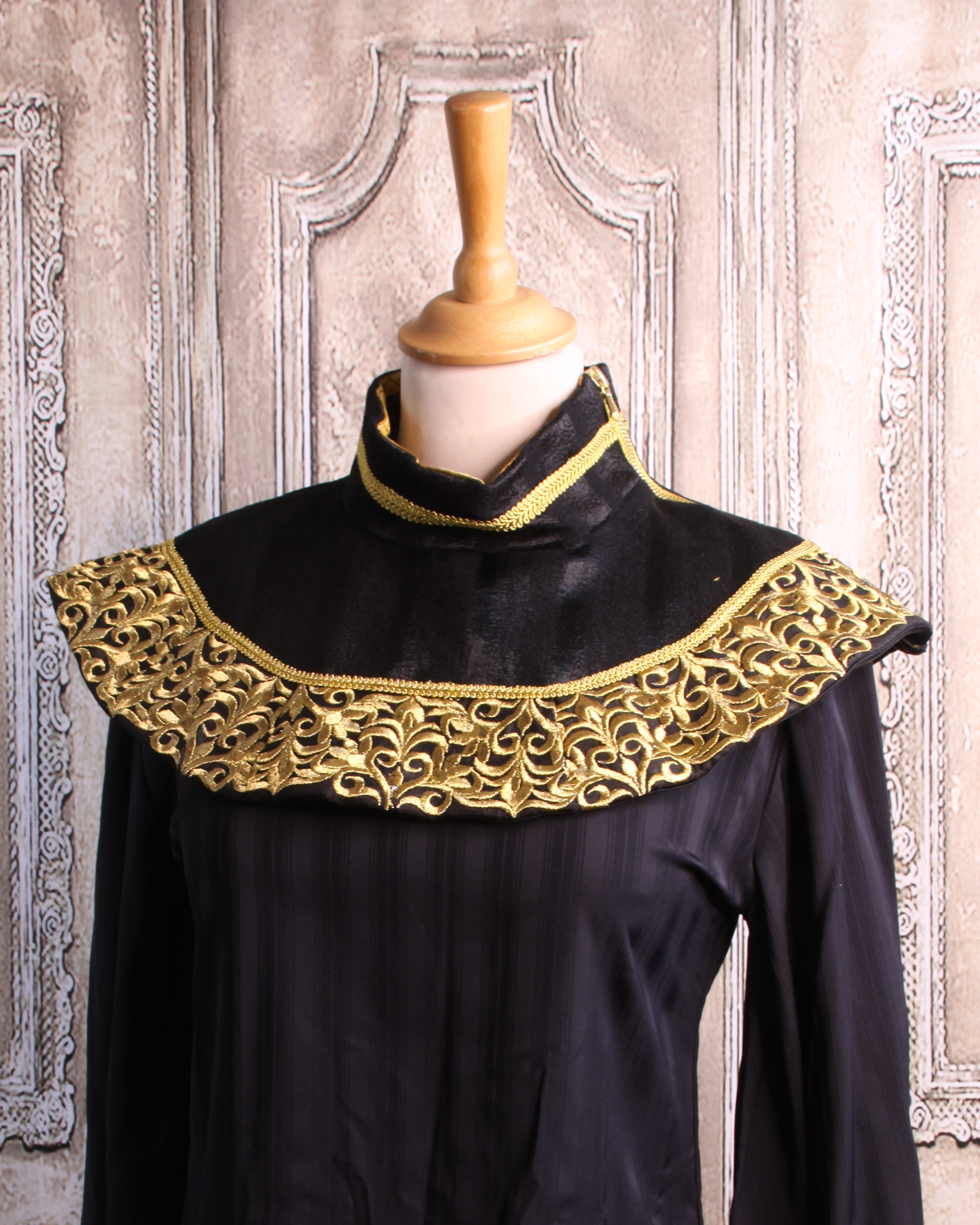 Ce col - mini capeline est coupé dans un drap de laine noire. Il se porte sur un pull, une veste, sous un manteau... Le tour du col est souligné d'un galon brodé noir et or et d'un galon de passementerie doré.