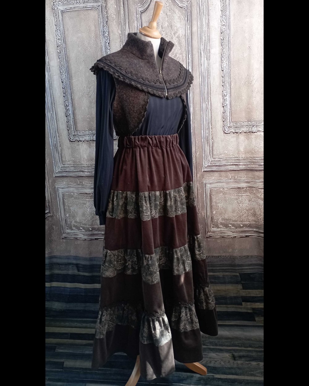 Il est présenté avec le boléro assorti et une jupe en velours et coton imprimé.