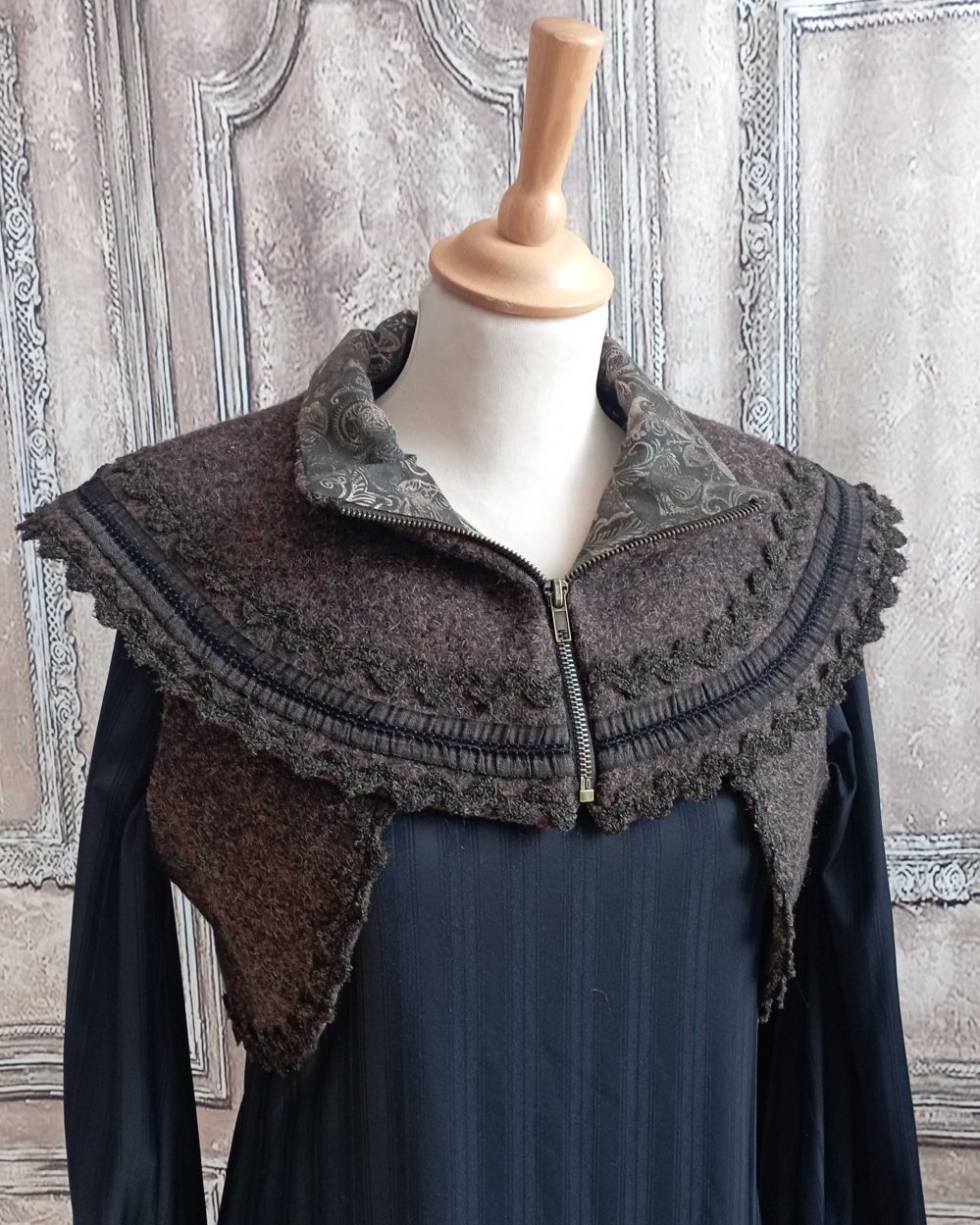 Ce col - mini capeline est coupé dans une laine bouillie chinée marron. Il se porte sur un pull, une veste, sous un manteau... Le tour du col est souligné d'un double rang de croquet noir chiné marron et d'un galon marron et noir.