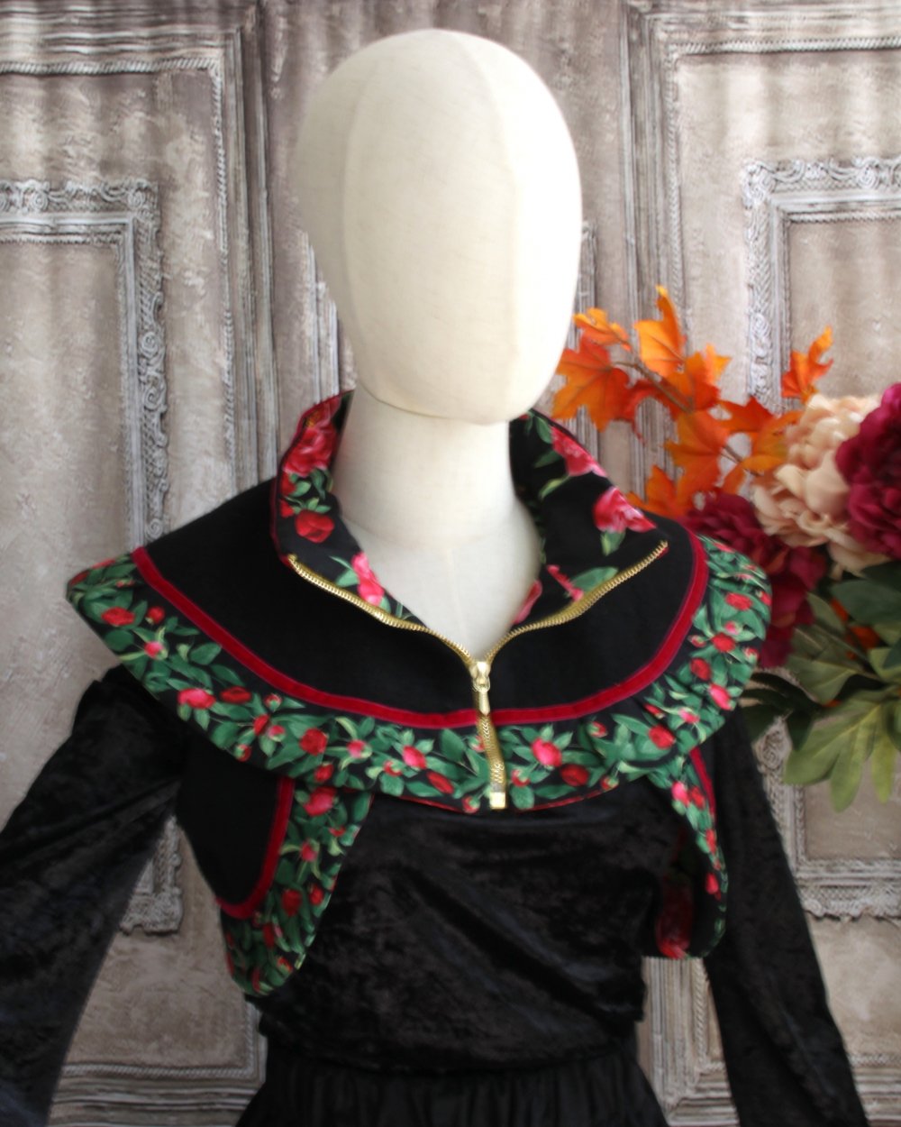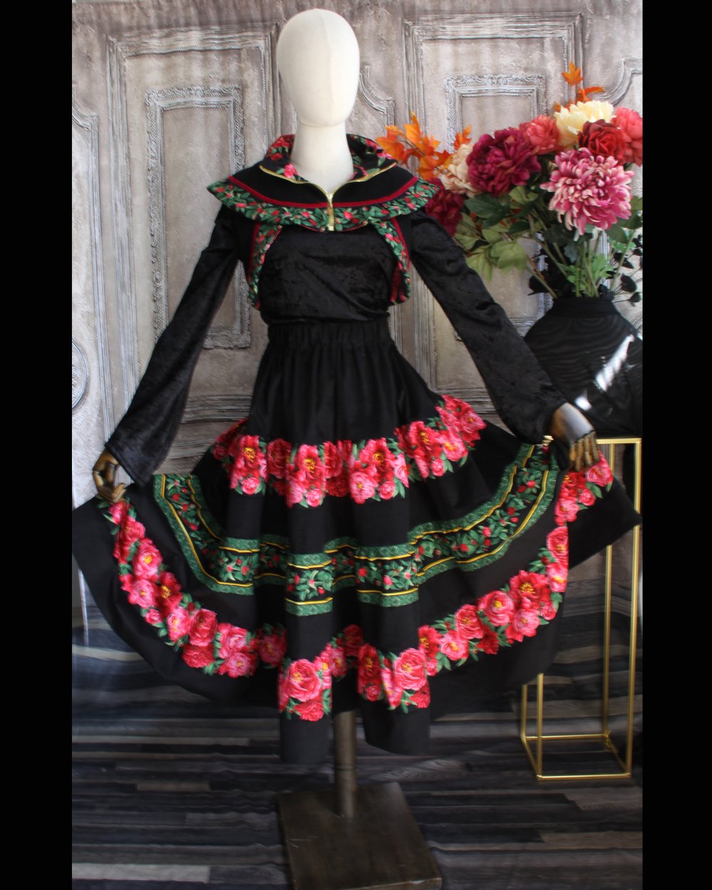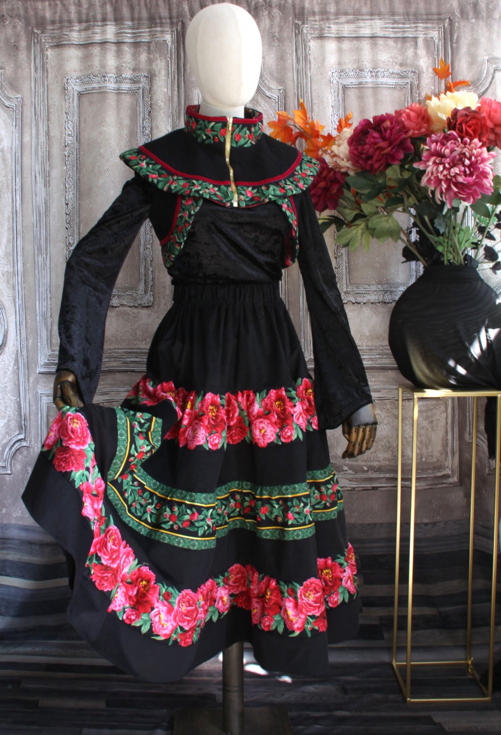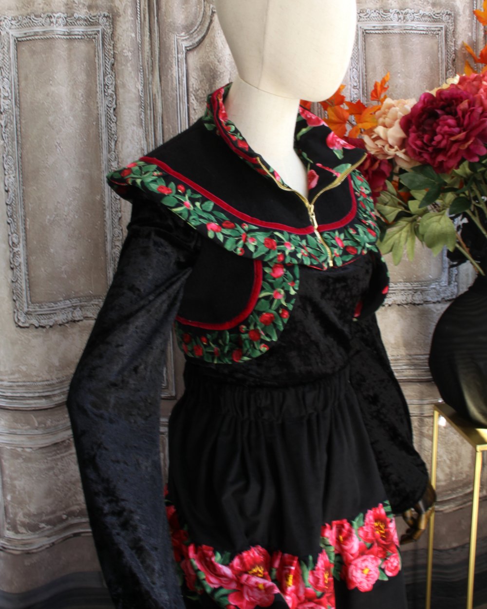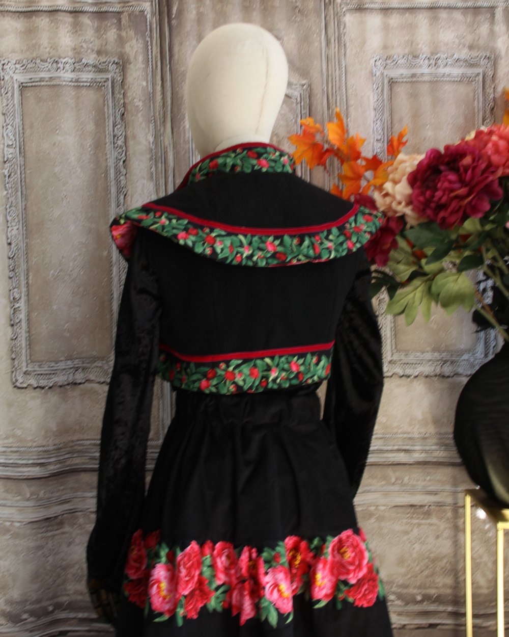 Il est présenté avec le boléro assorti et une jupe en velours et coton imprimé (vendue).