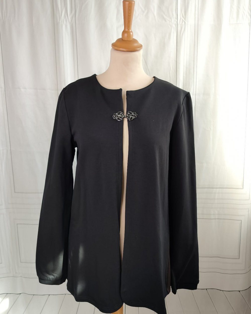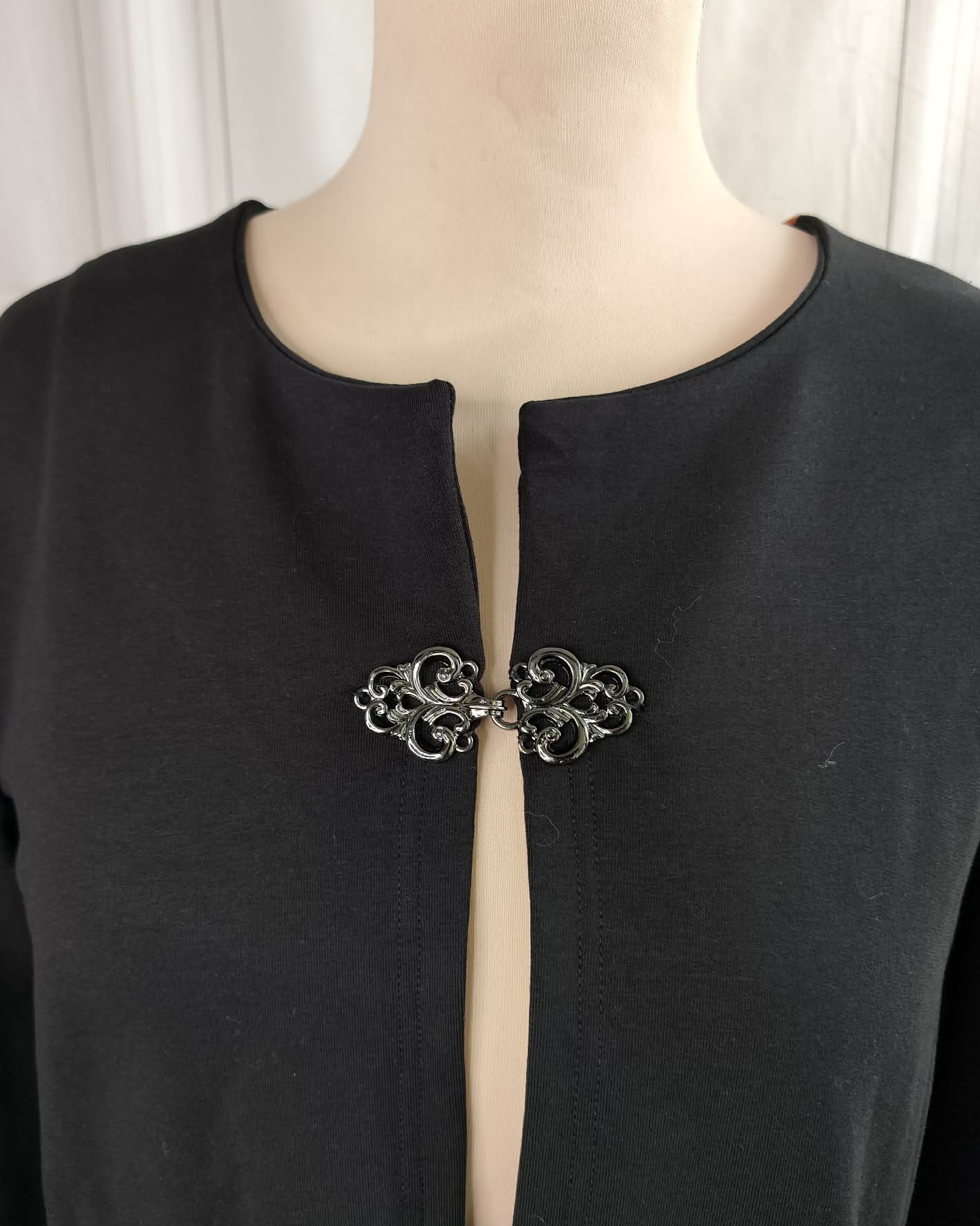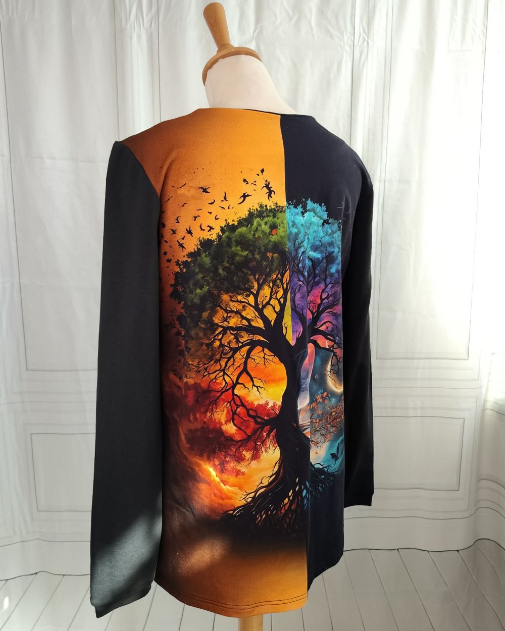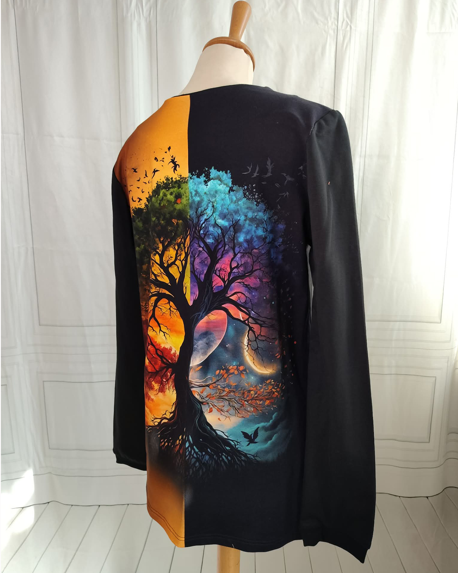 Le gilet est coupé dans un french terry brossé noir, un tissu 95% coton et 5% élasthanne, pour le confort et la souplesse. Dans le dos, j'ai utilisé un panneau de French Terry imprimé d'un motif d'arbre de jour à gauche et de nuit à droite. Un fermoir en métal bronze permet de l'attacher sur l'avant.