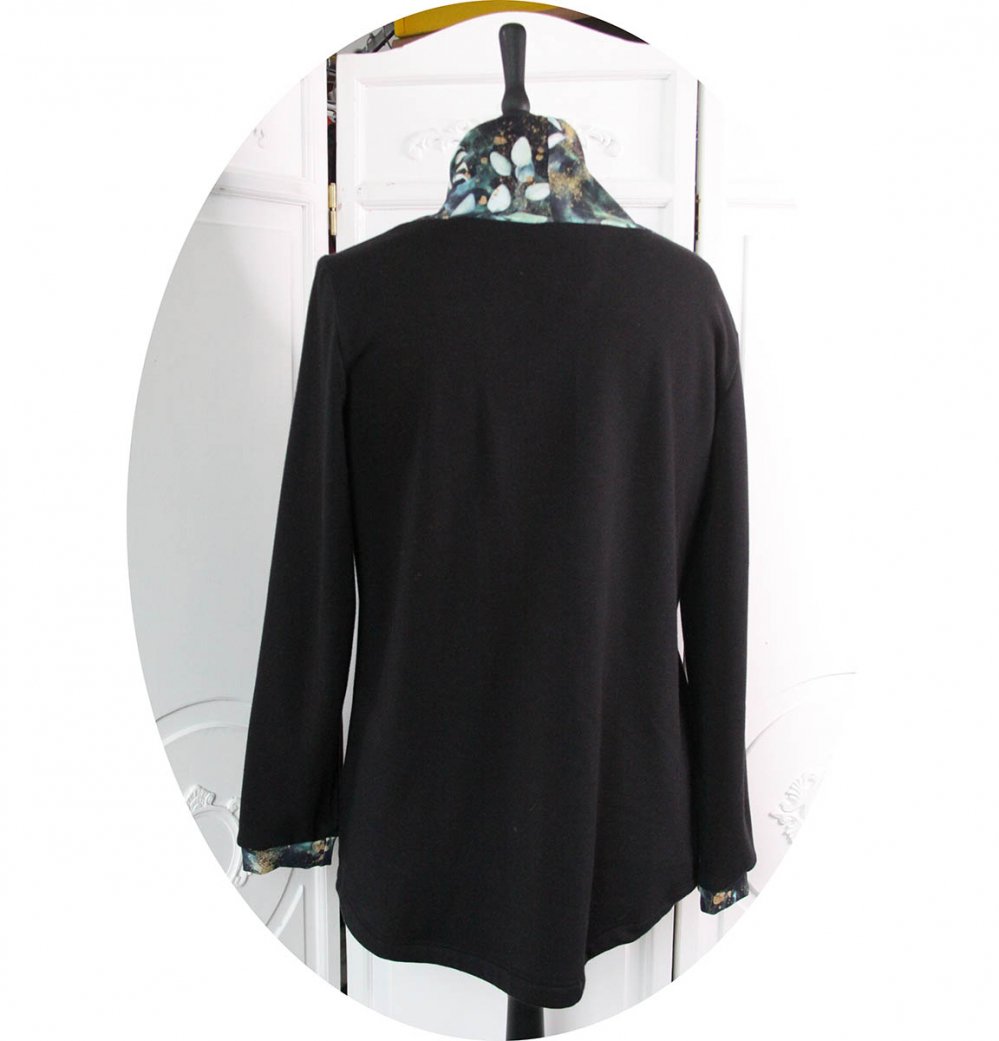 Gilet long en polaire alpine (extérieur jersey coton, intérieur polaire) en coloris noir et col noir imprimé.