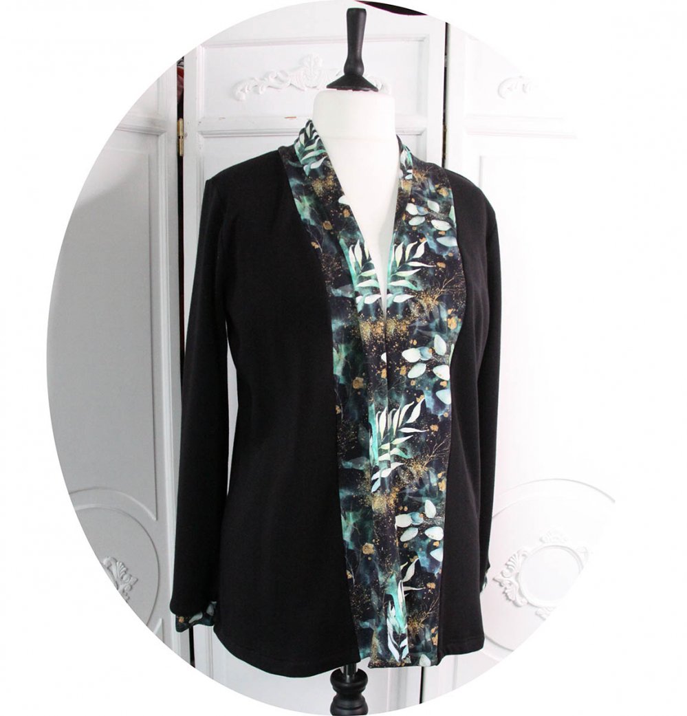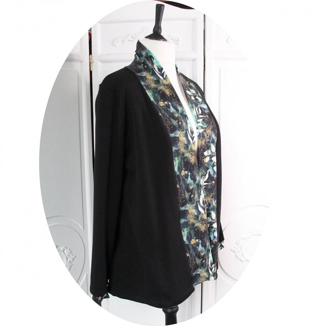 Le gilet est coupé dans une polaire alpine, un tissu 35% coton et 65% polyester, pour le confort et la chaleur. J'y ai ajouté un grand col kimono en jersey coton imprimé. J'ai choisi ce jersey pour ces belles couleurs profondes, et la forme du col qui remonte bien haut sur le cou pour vous garder la nuque au chaud.