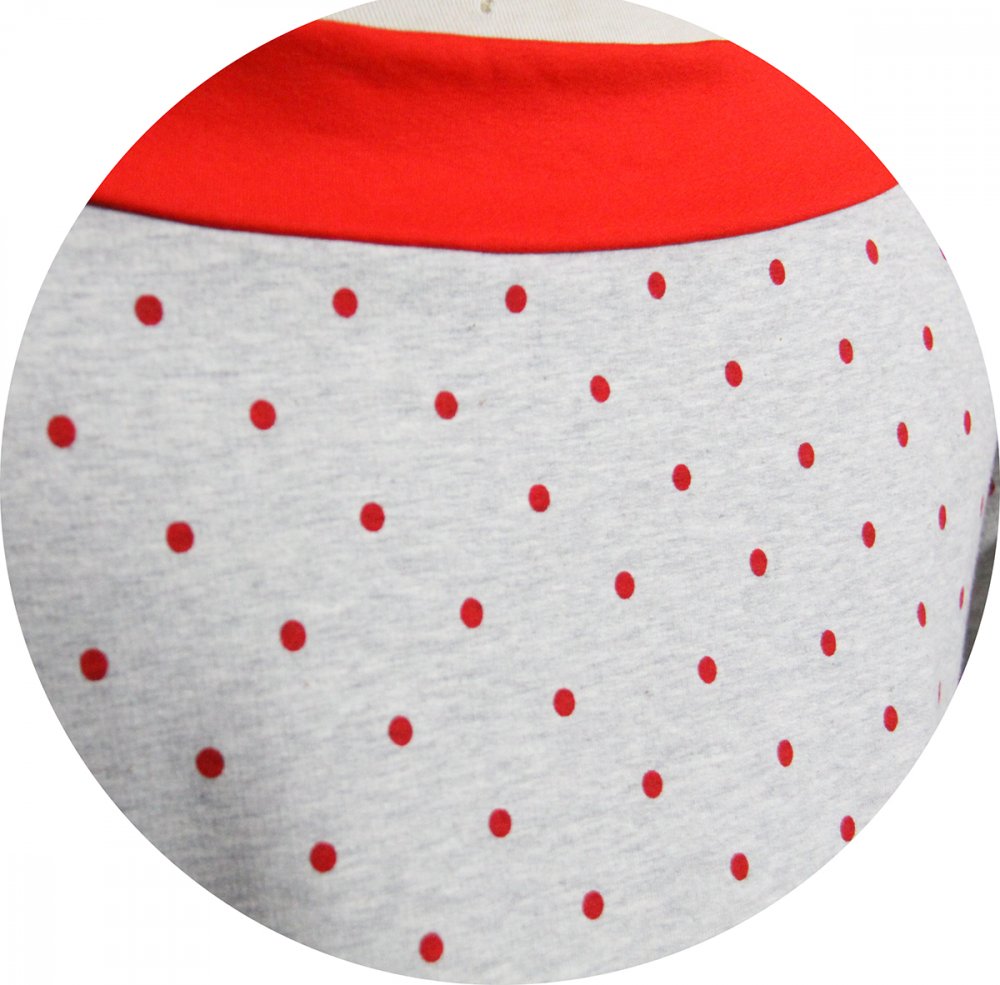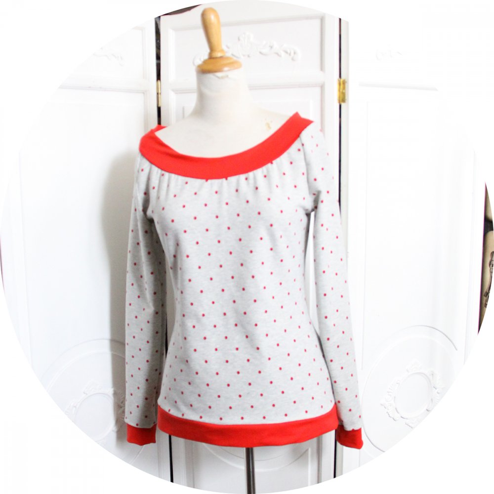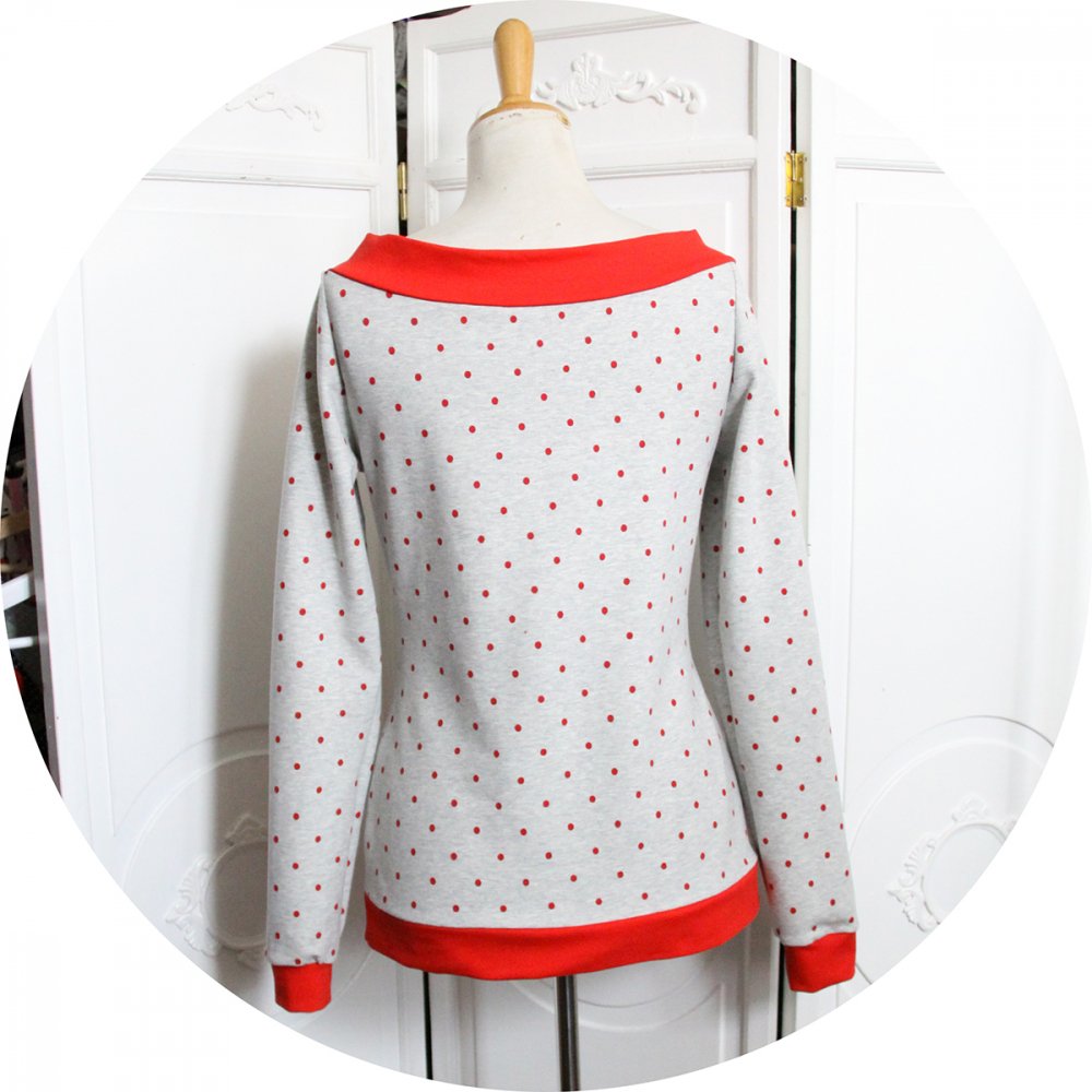 Pour vous j'ai choisi cette jolie maille 'French Terry' gris chiné à pois rouges, un sweatshirt léger, bien souple, bien cocooning.