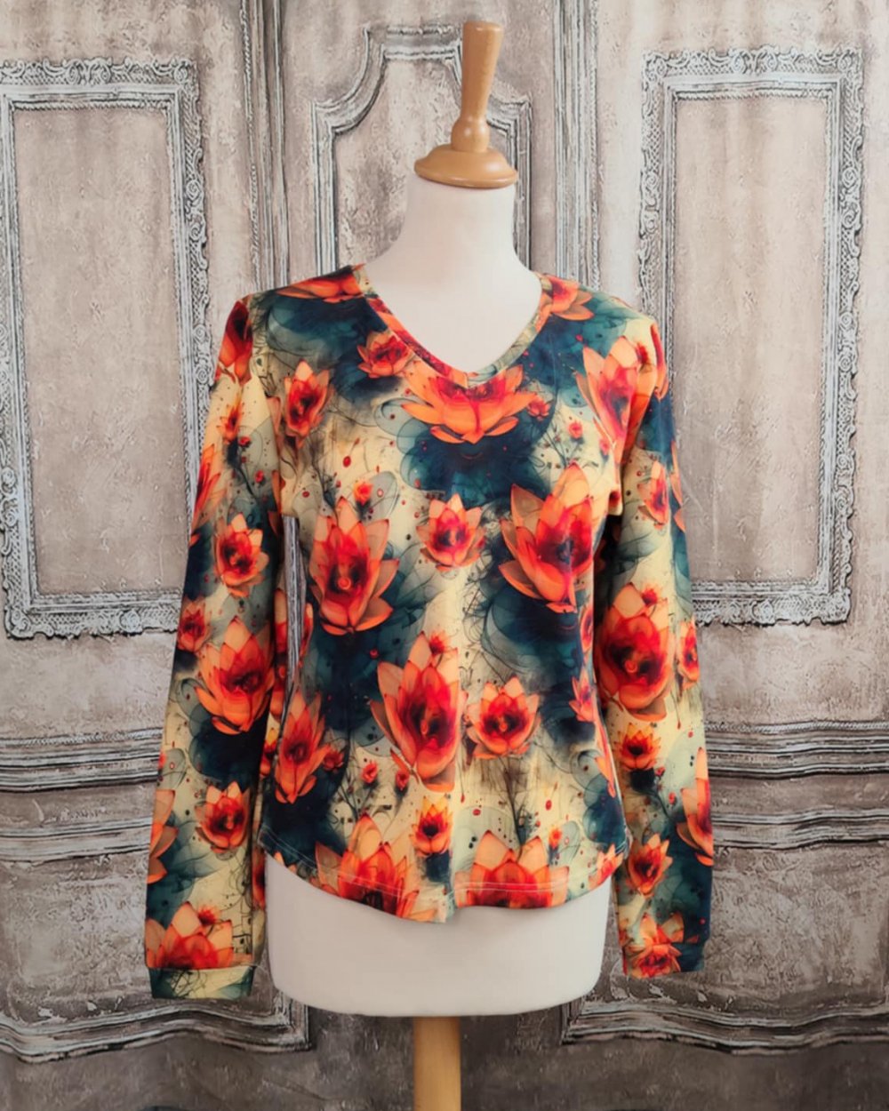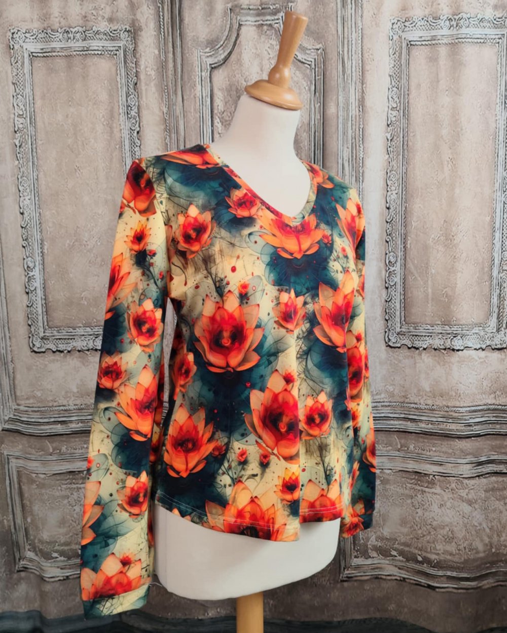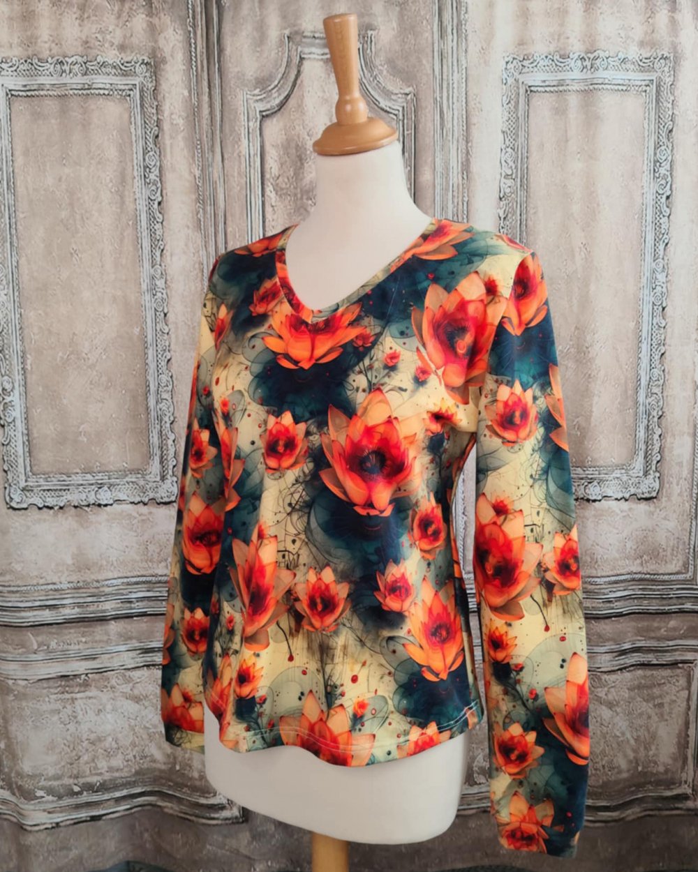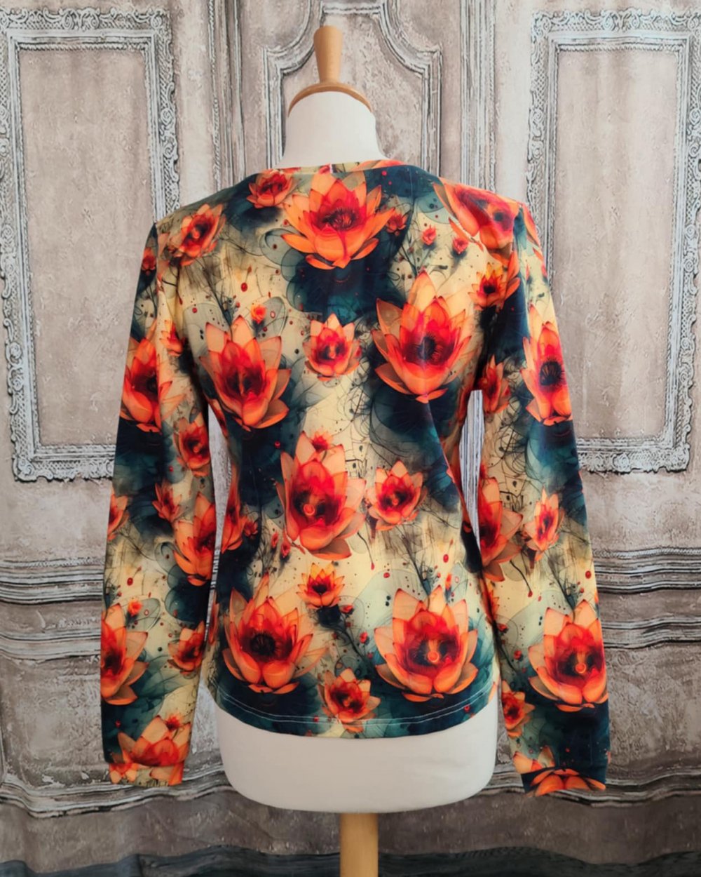 Taille M, présentée sur un buste en 38 en stock. Sur commande dans la taille de votre choix, sous 1 semaine, dans la limite du tissu disponible.