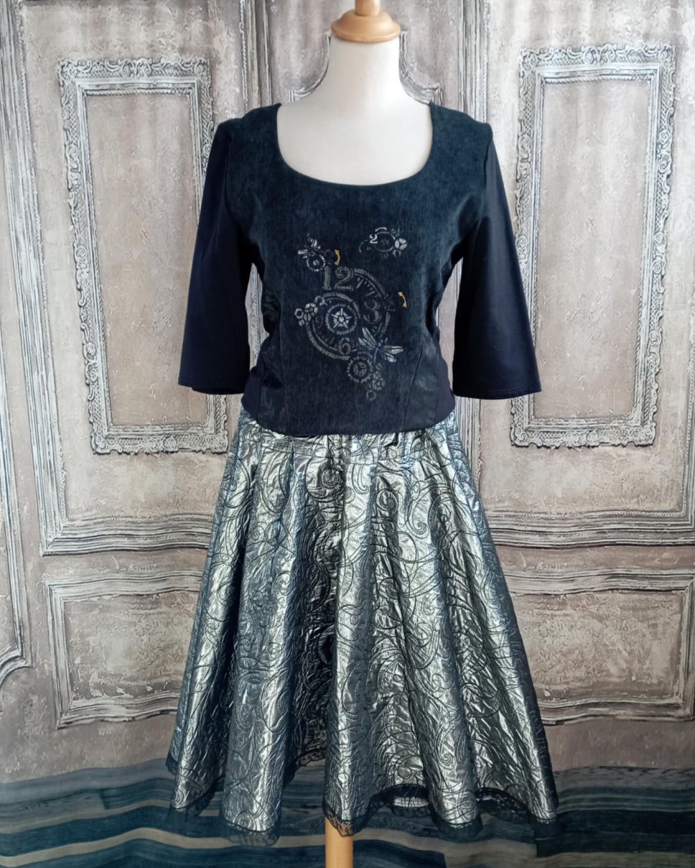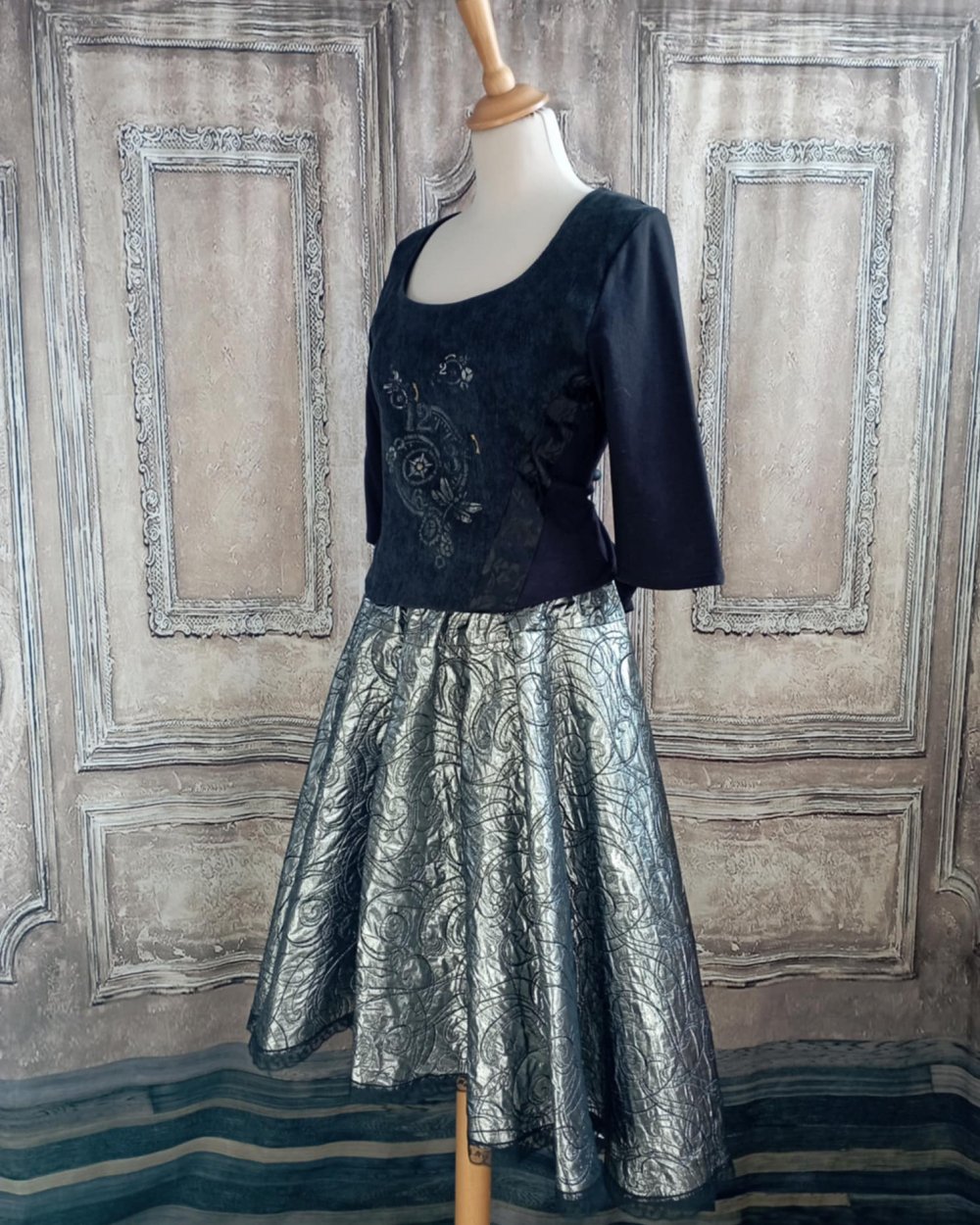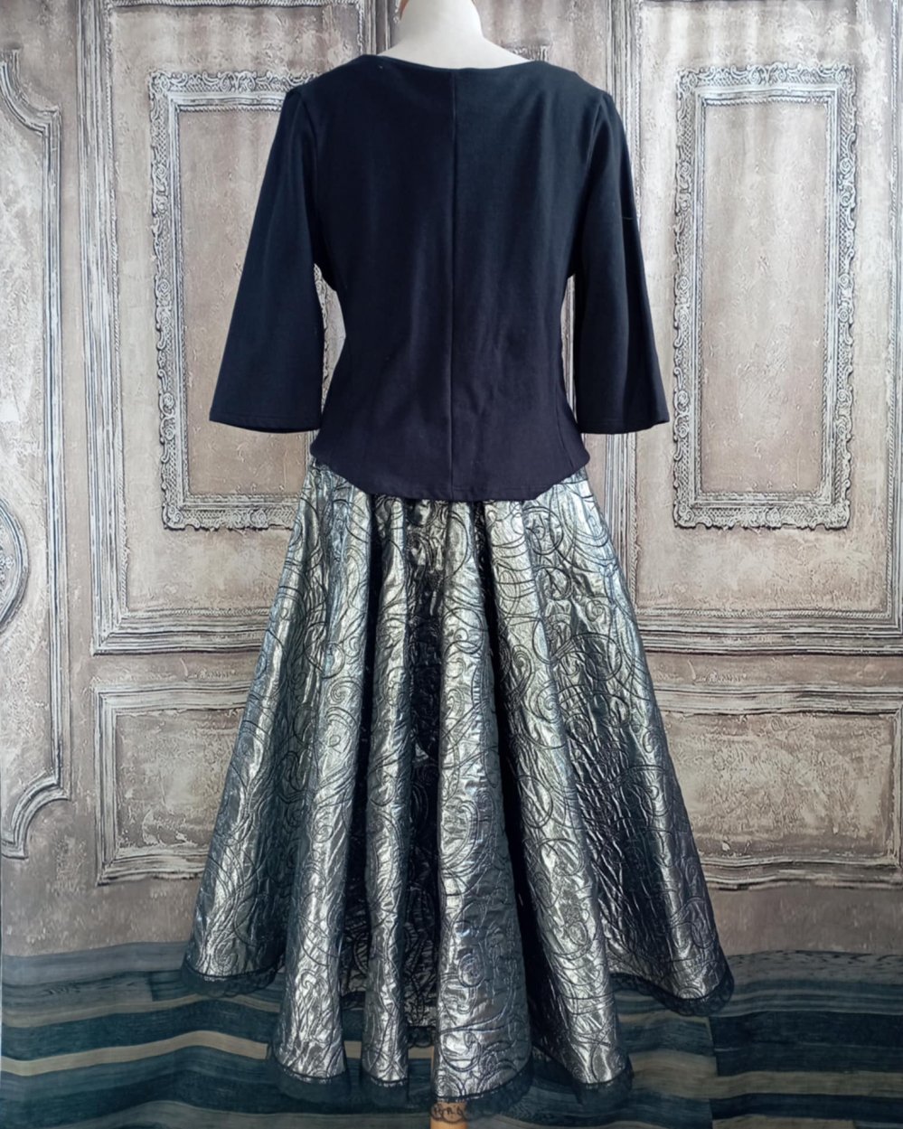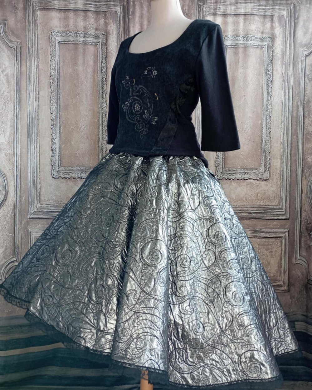 Jupe mi-longue asymétrique en tissus jacquard argent et noir.