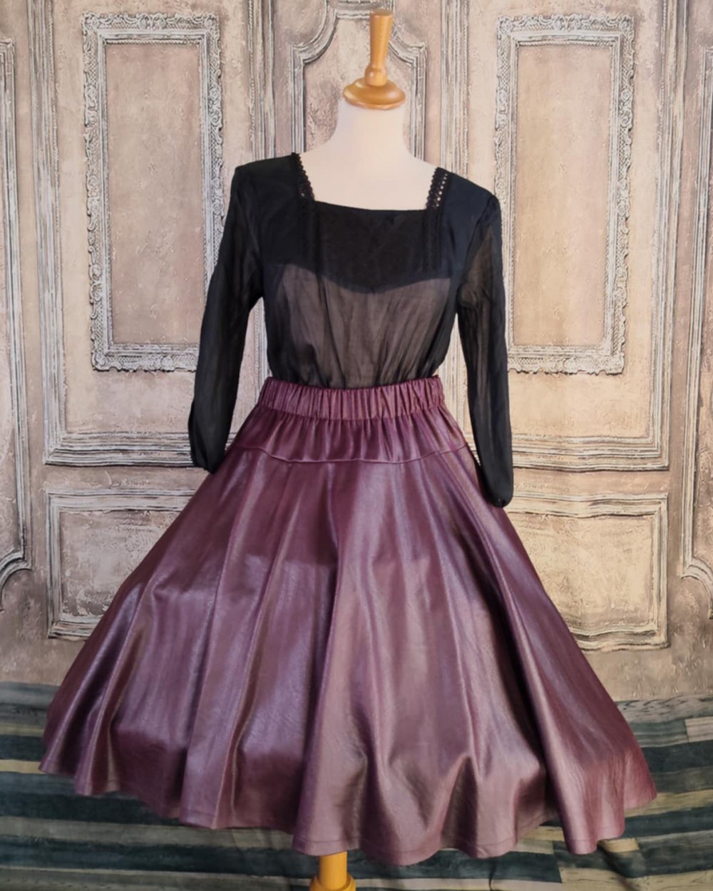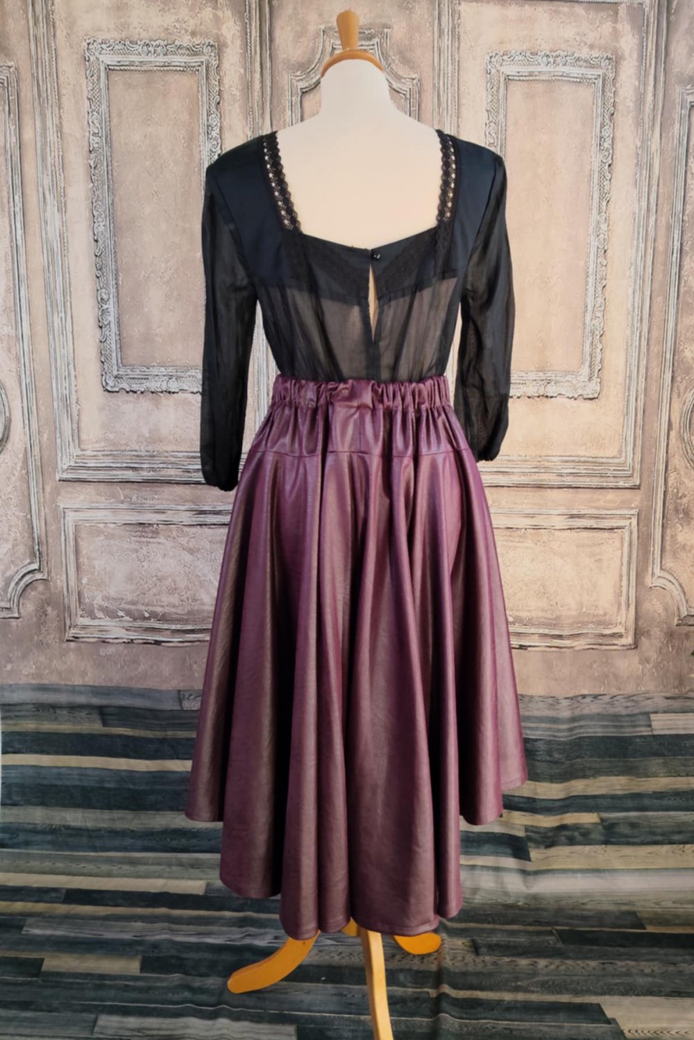 Jupe mi-longue asymétrique en simili cuir prune.