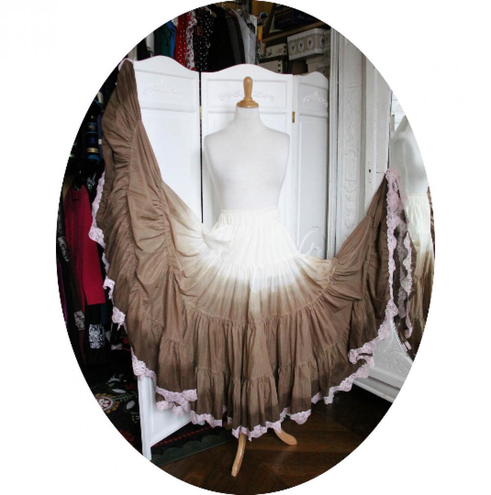 Toute en coton, cette jupe/jupon est composée de quatre volants froncés montés sur une taille élastiquée. Une bande de dentelle orne l'ourlet ( sur demande). Ce jupon a été teint par mes soins en coloris marron chocolat au lait, en dégradé de marron. Le haut de la jupe a gardé son coloris écru d'origine pour passer du marron clair au marron très foncé dans le bas.
