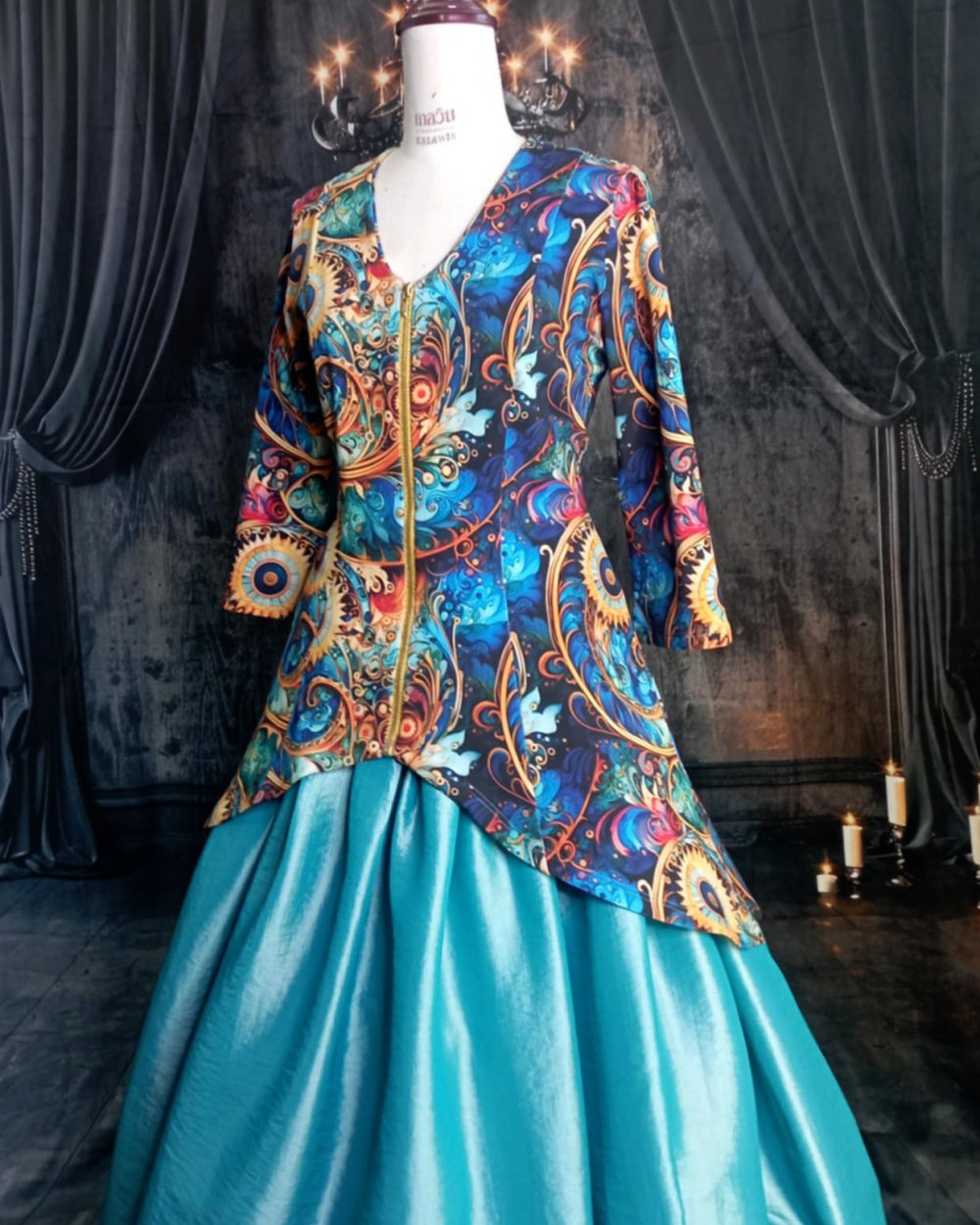 Elle est présentée avec une crinoline de taille moyenne, le haut en jersey imprimé disponible sur le site et une cape en velours imprimé (vendue séparément).