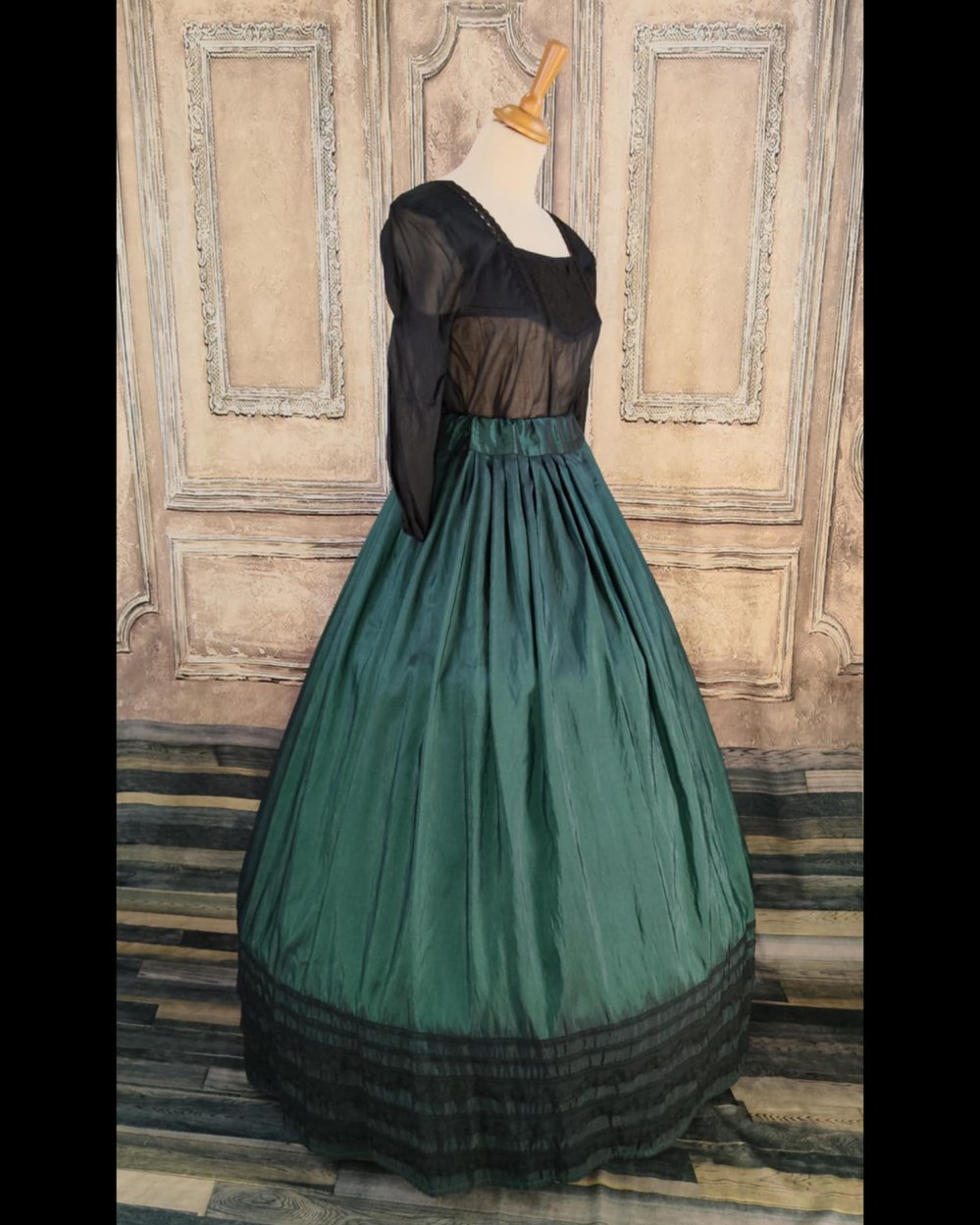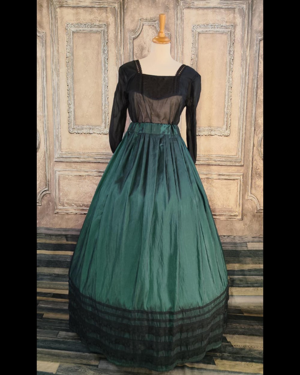 Jupe évasée longue en taffetas vert et noir.