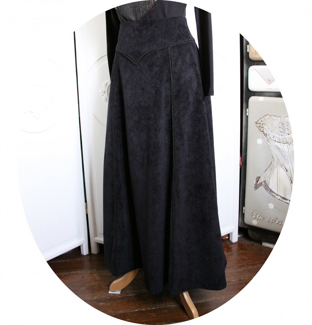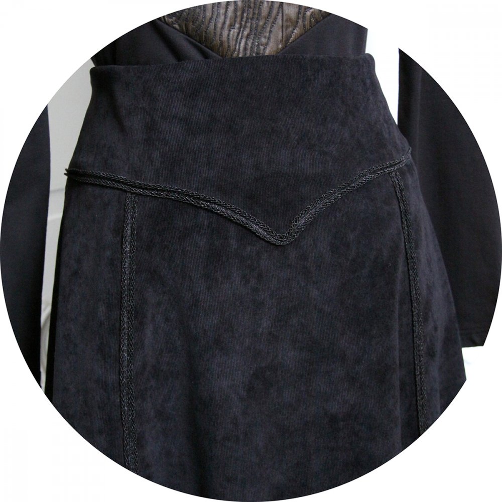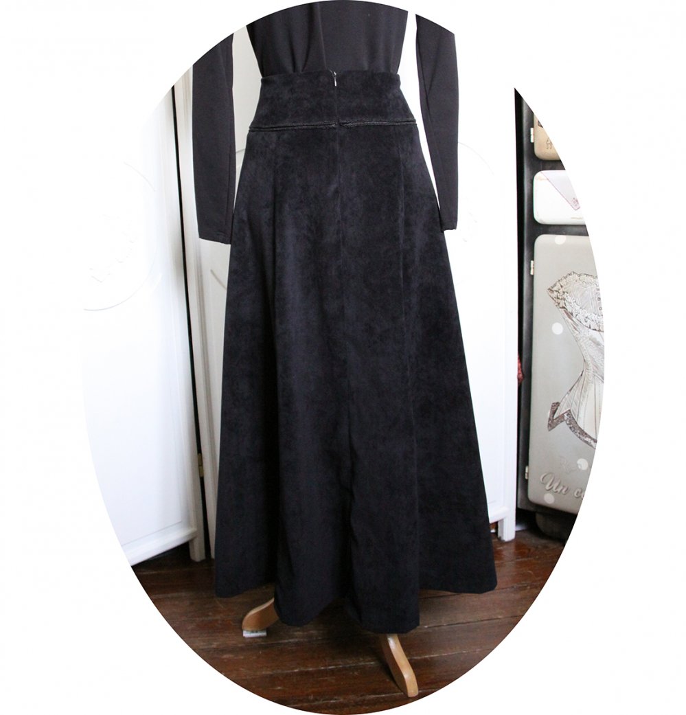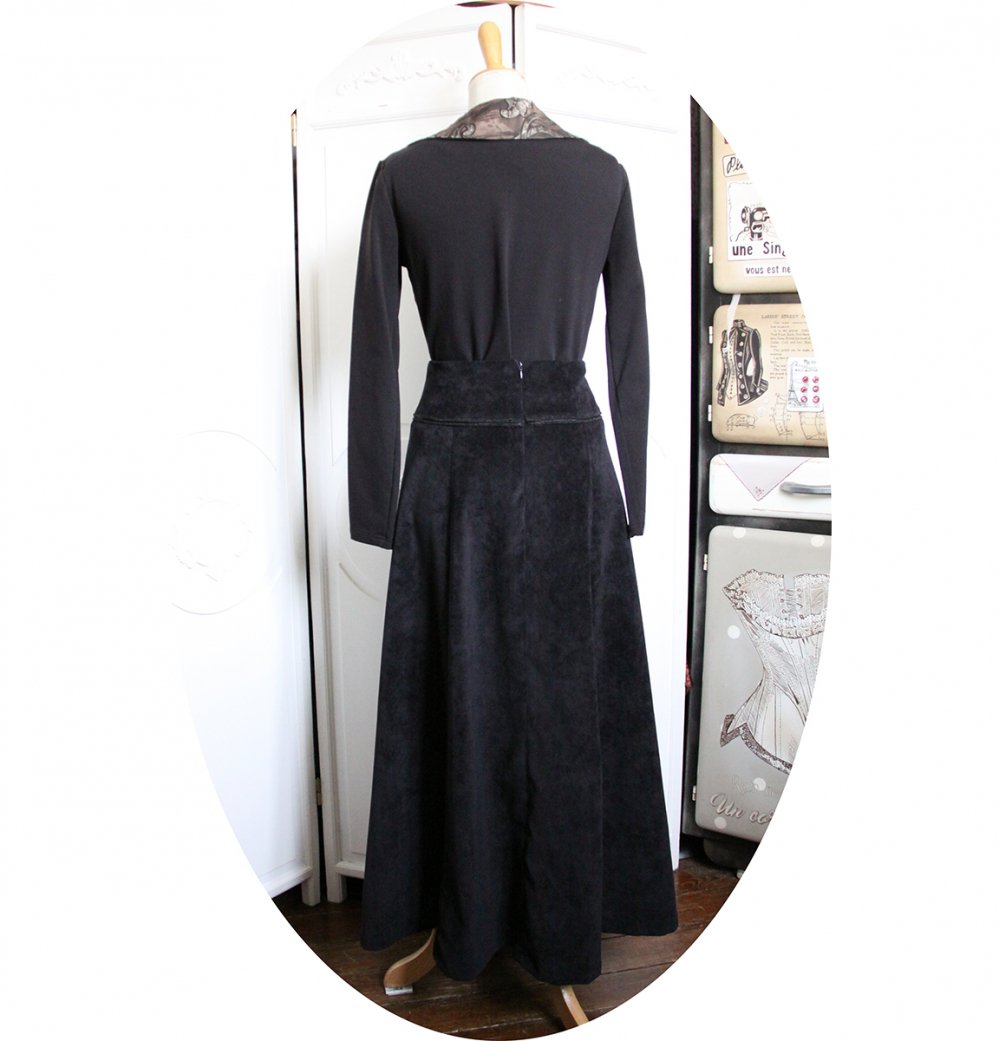 Jupe longue évasée en velours noire et et galon noir irisé. Pour cette jupe longue noire, j'ai travaillé une forme évasée à partir de la taille, qui permet d'être à l'aise dans ces mouvements. La jupe en velours noir est conçue en deux parties : une ceinture qui épouse la taille et le haut des hanches, de façon à bien suivre votre silhouette sans y ajouter de volume. La ceinture est coupée en pointe sur l'avant et soulignée d'un galon de passementerie noir irisé. La jupe longue noire s'évase à partir de cette partie ceinture au moyen de pans de tissus de forme trapèze pour vous donner de l'ampleur dans le bas de la jupe. Le pan central de la jupe est aussi souligné du galon noir irisé. La jupe longue en velours noir se ferme par un zip invisible dans le dos.Pour le tissu de cette jupe longue, j'ai choisi un velours cotelé synthétique, qui a un beau tombé, ne froisse pas, et a un petit aspect irrégulier que j'aime beaucoup. La jupe est en stock en taille 38, présentée sur un mannequin en 38. Elle est réalisable sur commande dans la taille de votre choix, en sur mesure et/ou dans d'autres tissus et coloris sur demande. Entretien en machine à 30°C