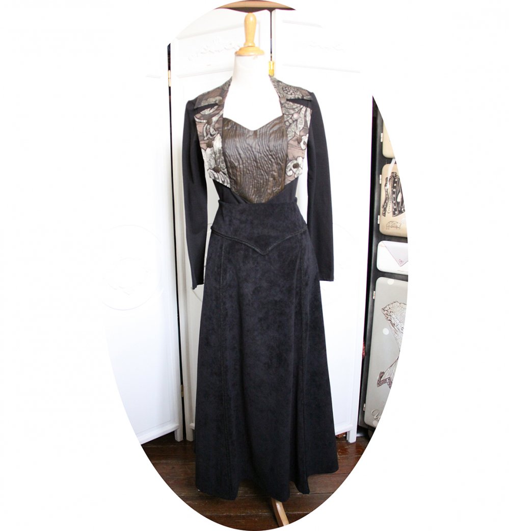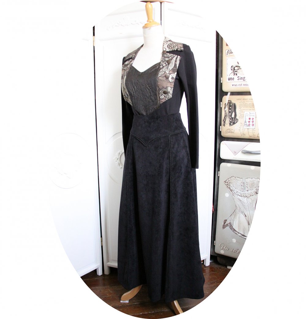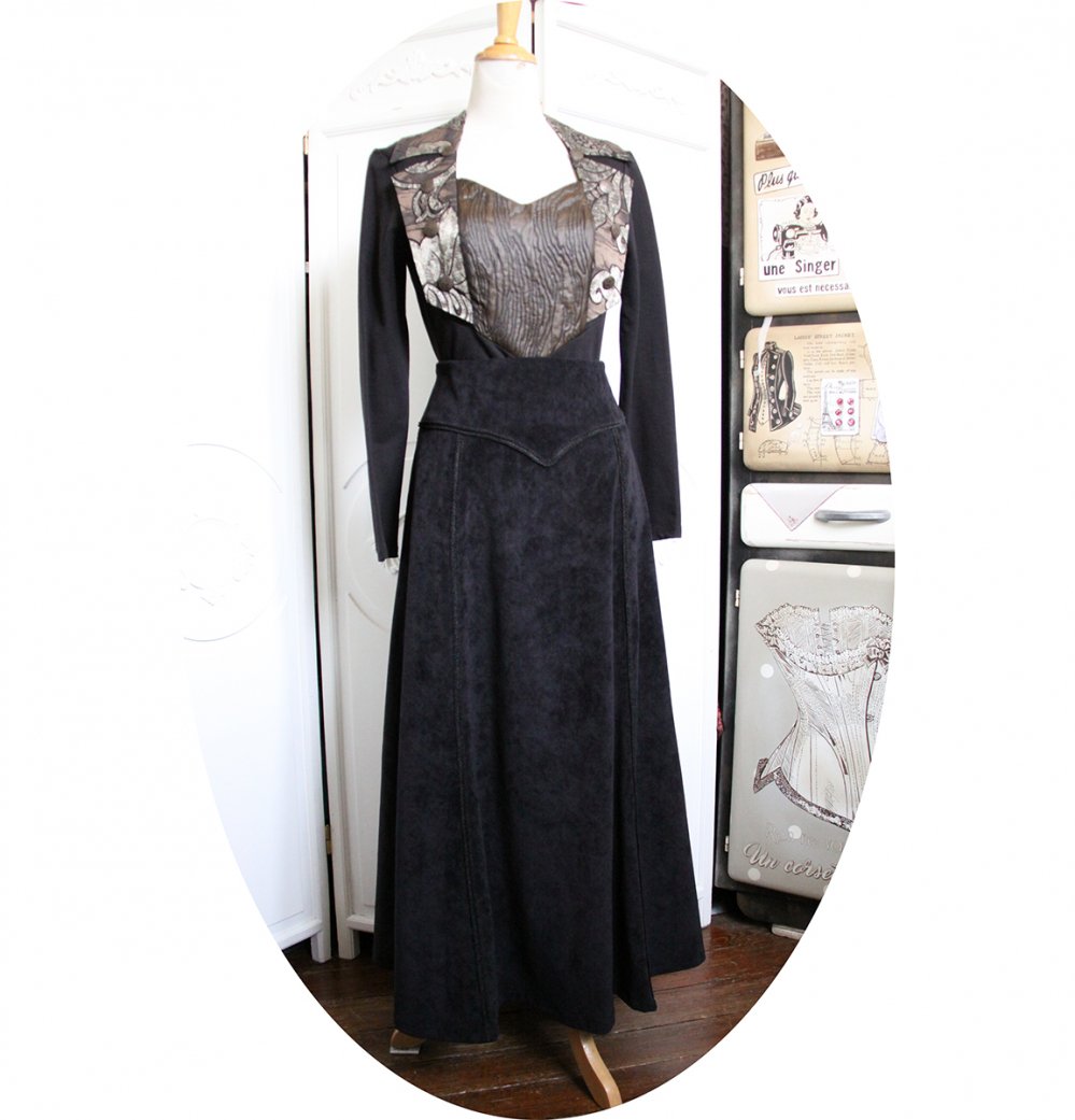 Jupe longue évasée en velours noire et et galon noir irisé. Pour cette jupe longue noire, j'ai travaillé une forme évasée à partir de la taille, qui permet d'être à l'aise dans ces mouvements. La jupe en velours noir est conçue en deux parties : une ceinture qui épouse la taille et le haut des hanches, de façon à bien suivre votre silhouette sans y ajouter de volume. La ceinture est coupée en pointe sur l'avant et soulignée d'un galon de passementerie noir irisé. La jupe longue noire s'évase à partir de cette partie ceinture au moyen de pans de tissus de forme trapèze pour vous donner de l'ampleur dans le bas de la jupe. Le pan central de la jupe est aussi souligné du galon noir irisé. La jupe longue en velours noir se ferme par un zip invisible dans le dos.Pour le tissu de cette jupe longue, j'ai choisi un velours cotelé synthétique, qui a un beau tombé, ne froisse pas, et a un petit aspect irrégulier que j'aime beaucoup. La jupe est en stock en taille 38, présentée sur un mannequin en 38. Elle est réalisable sur commande dans la taille de votre choix, en sur mesure et/ou dans d'autres tissus et coloris sur demande. Entretien en machine à 30°C