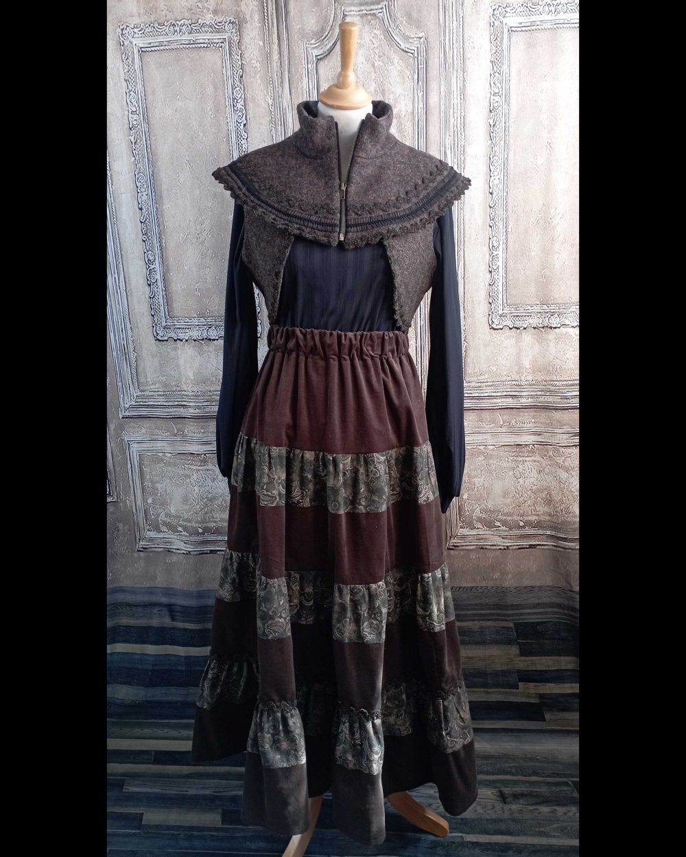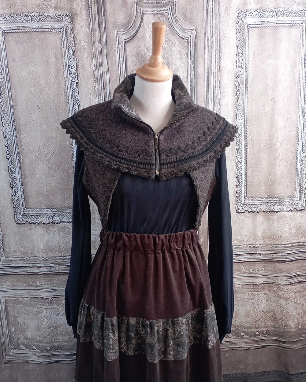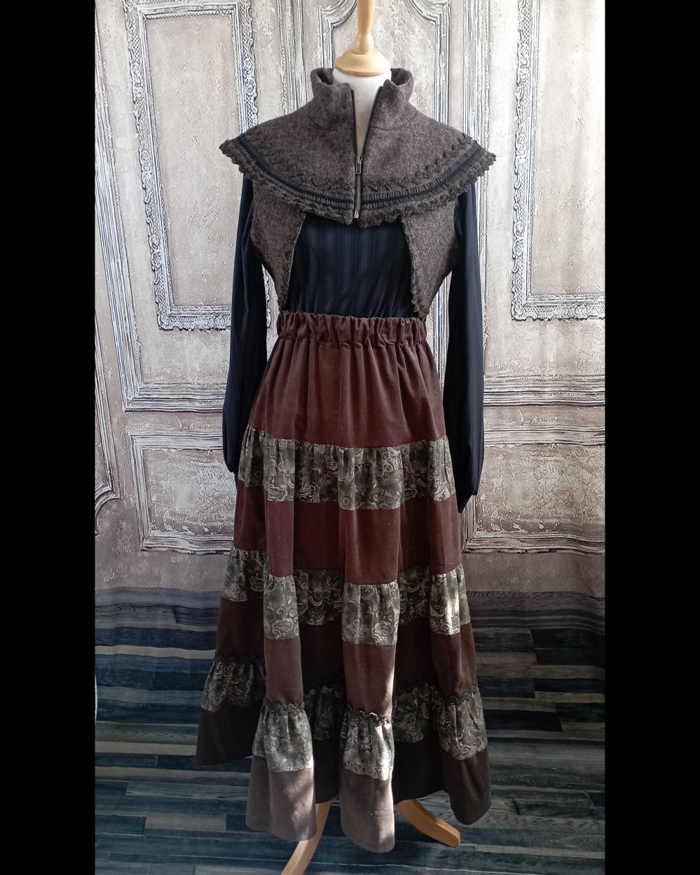La jupe est présentée en taille unique sur un buste en 38 avec le boléro et le col dont la doublure est coupée dans le même coton que l'imprimé de la jupe.