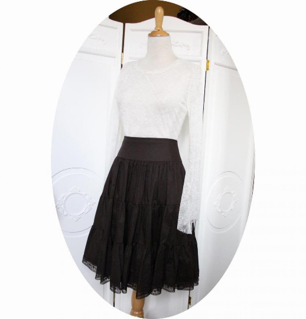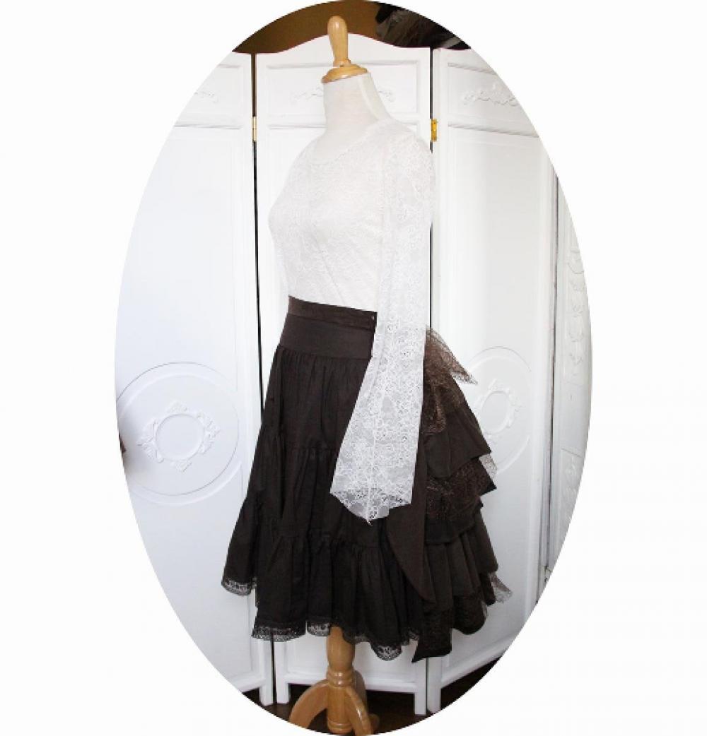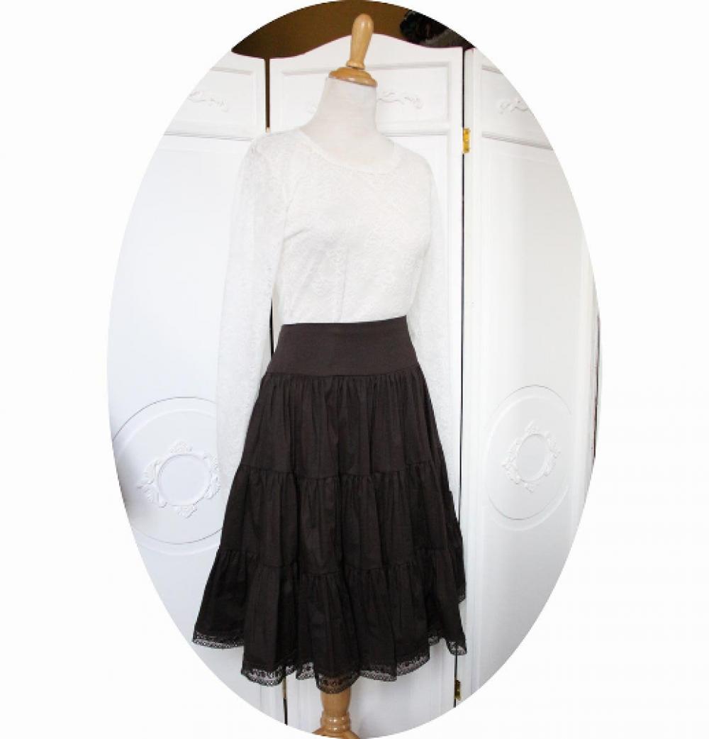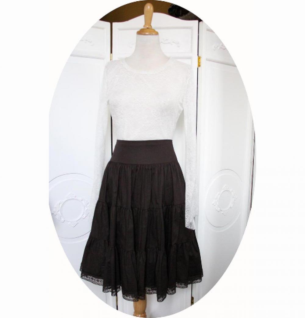 Jupe à volant en coton marron foncé terminée par une bordure de dentelle marron.