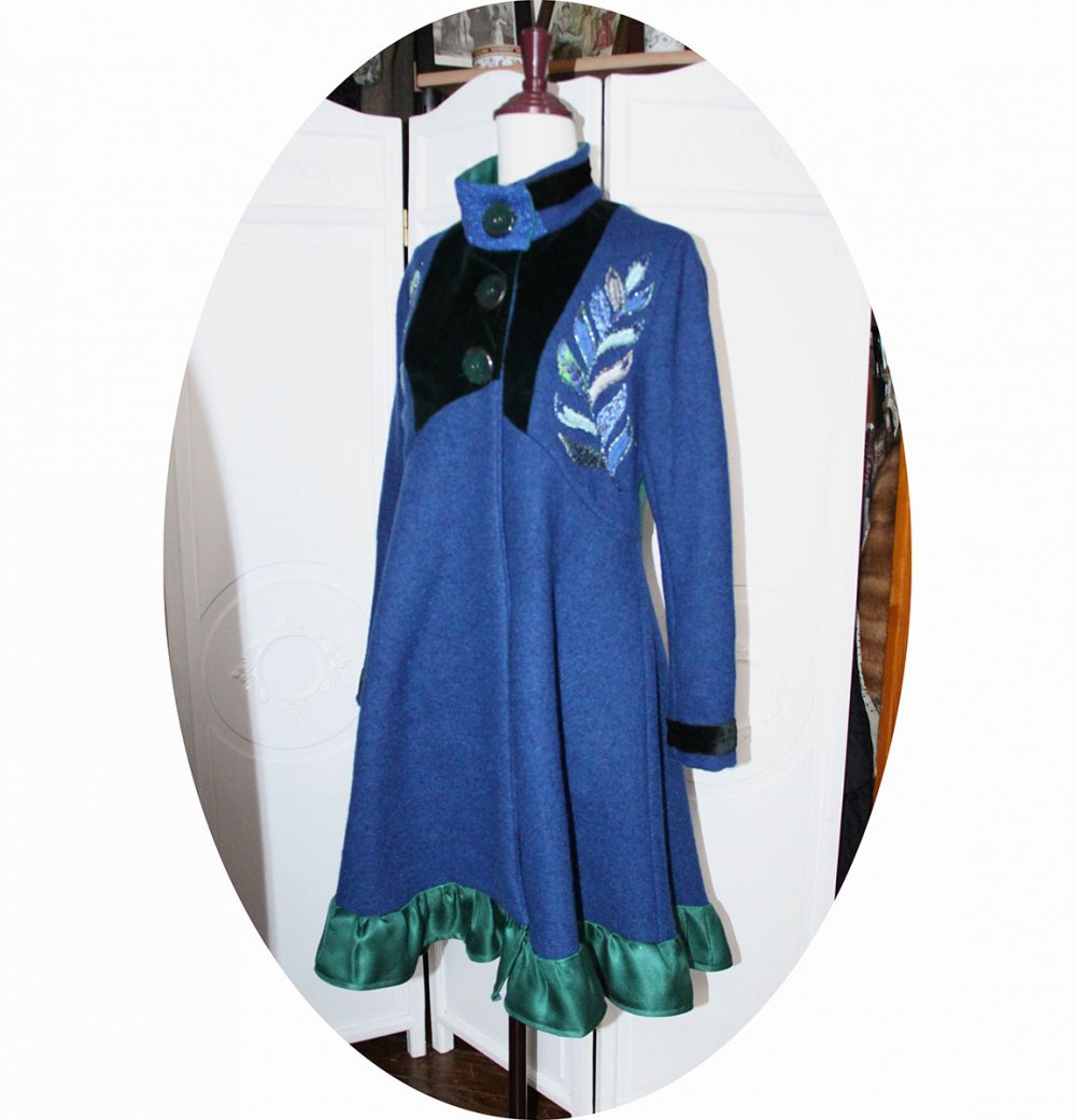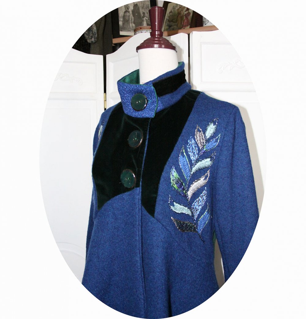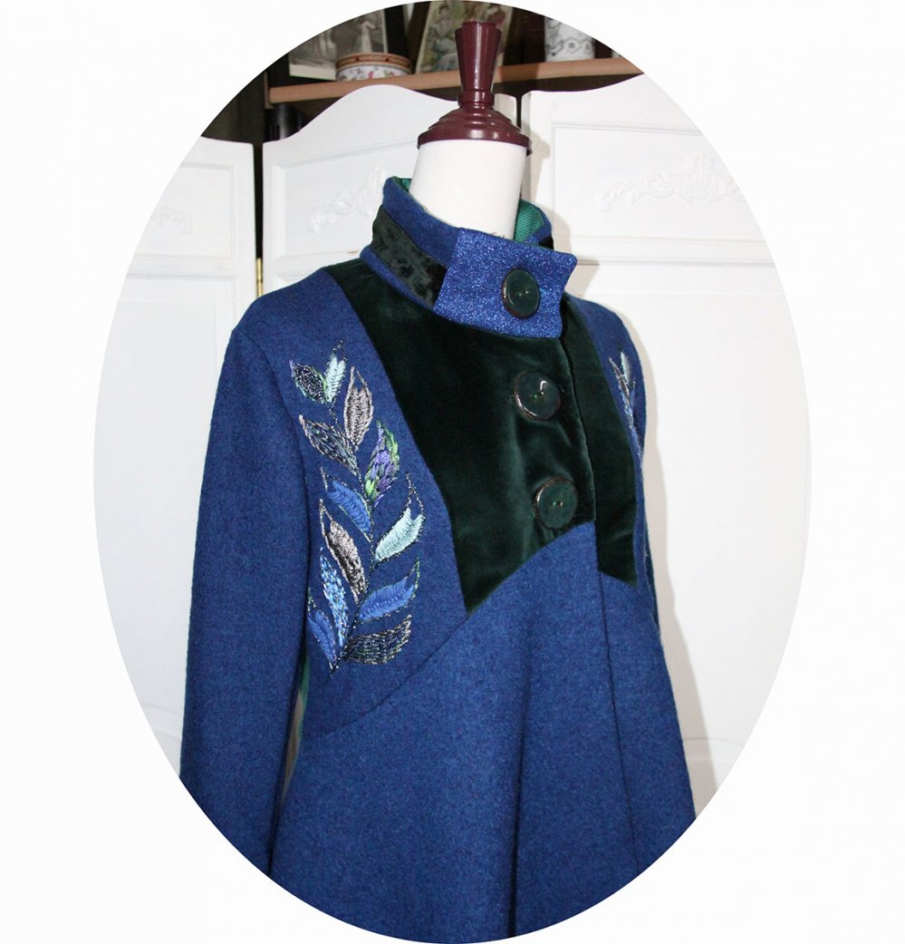 Manteau mi-long en pure laine bouillie bleu roi, velours vert émeraude et natté de soie vert jade, doublure en partie haute maille lurex bleue et satin pour les manches.