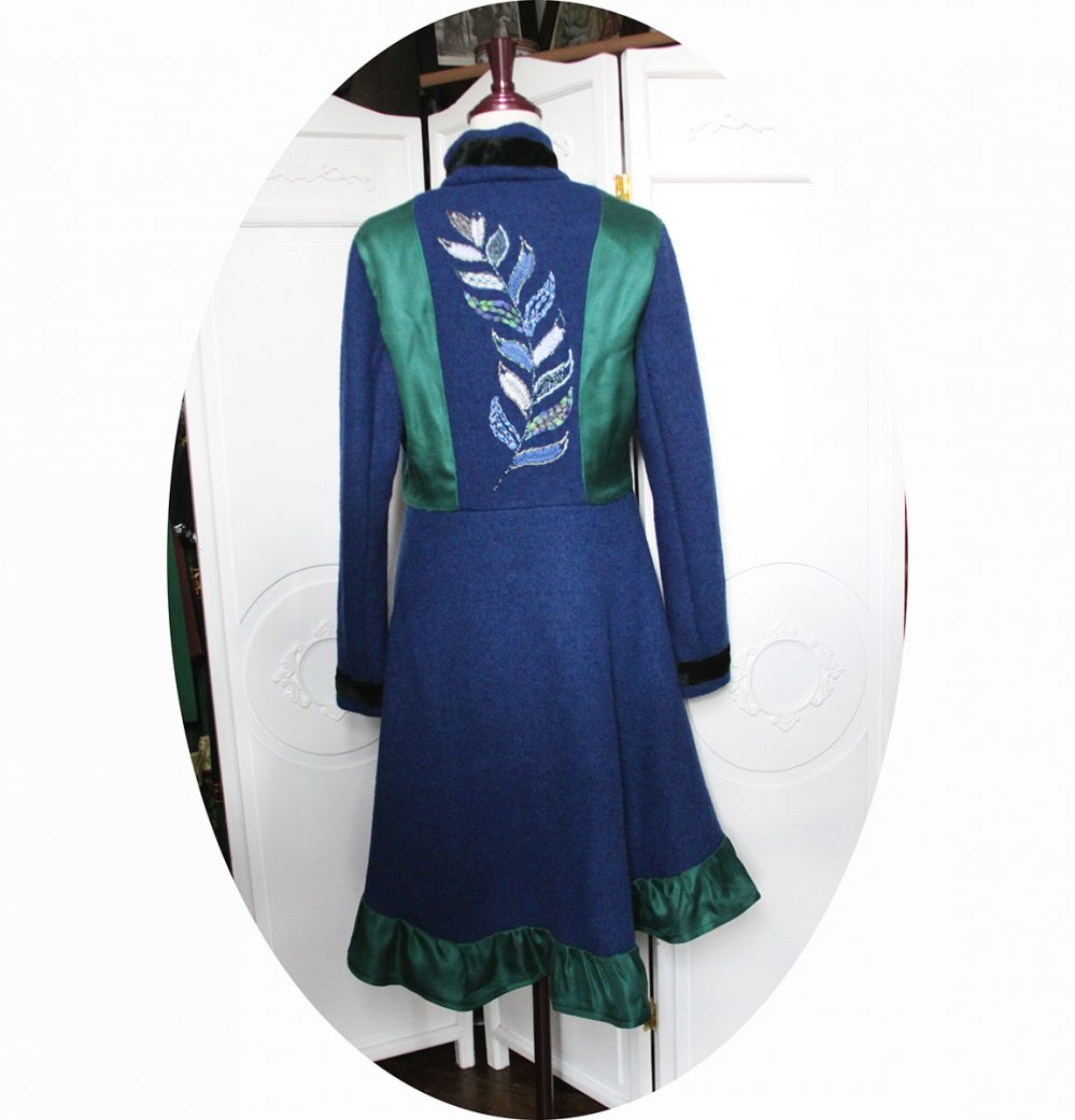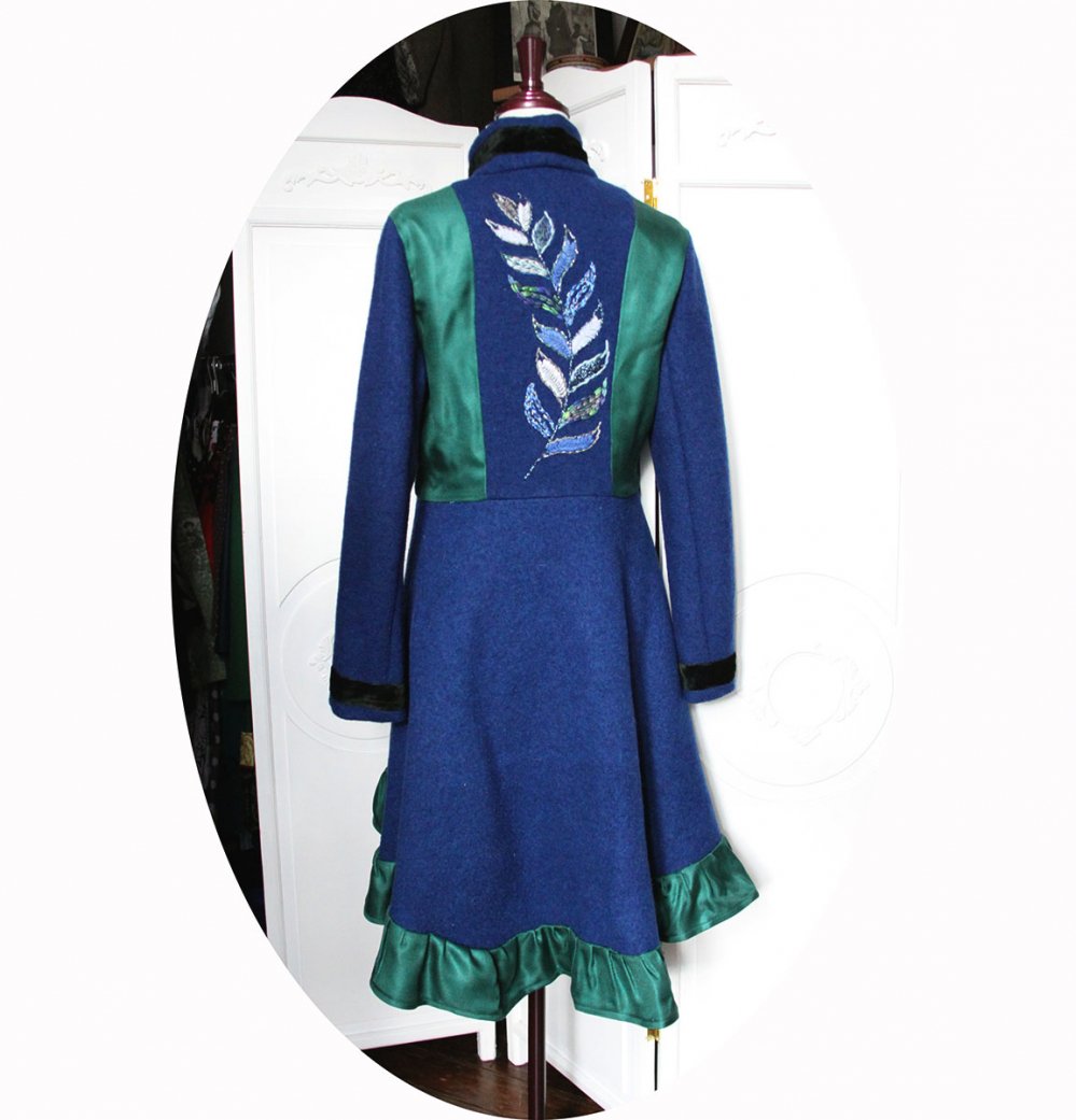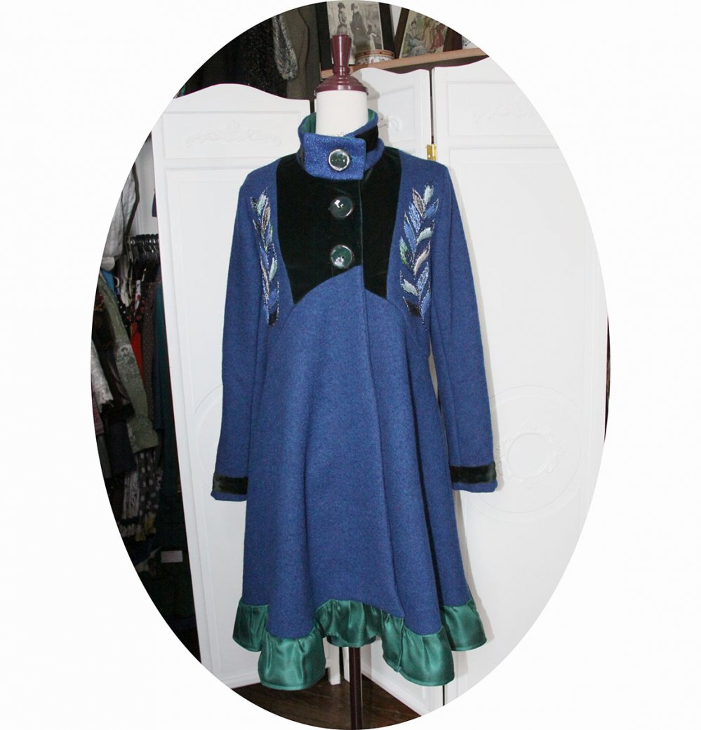 Manteau mi-long en pure laine bouillie bleu roi, velours vert émeraude et natté de soie vert jade, doublure en partie haute maille lurex bleue et satin pour les manches.