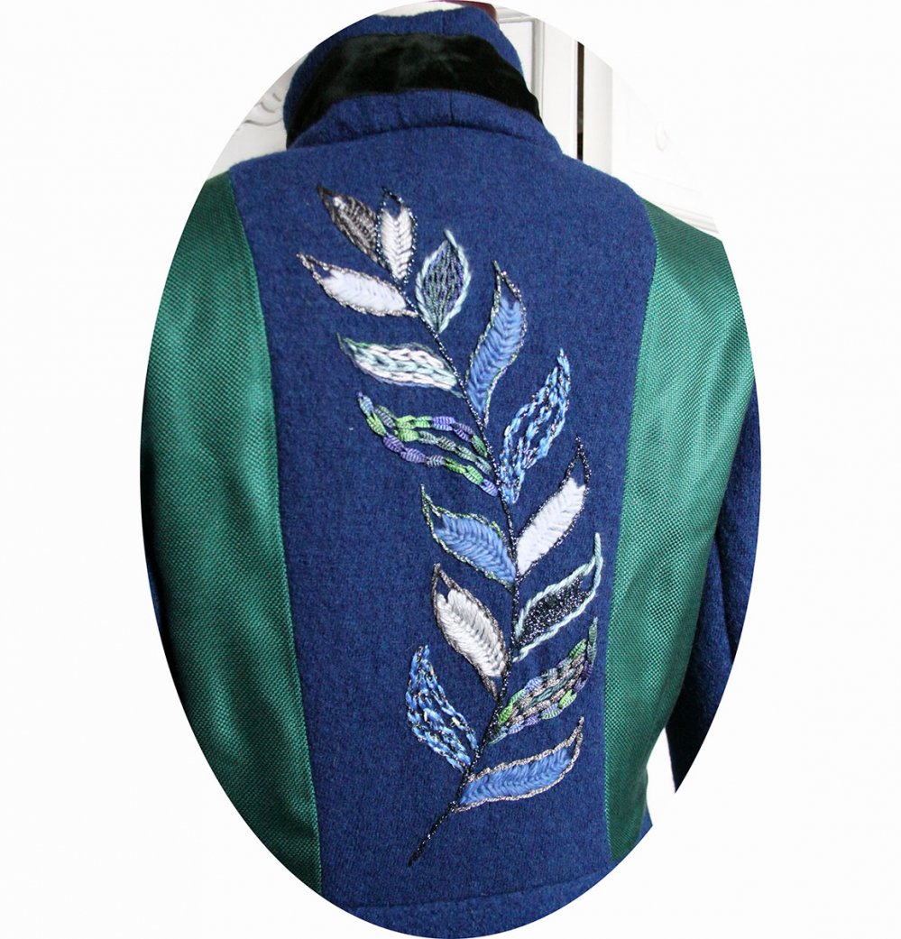 Ce manteau souple présente des broderies faites main sur le dos et les cotés devant, avec un motif de feuille ou plume bordé à partir de fils de laine, de soie, de viscose, de lurex, d'organza métallique...