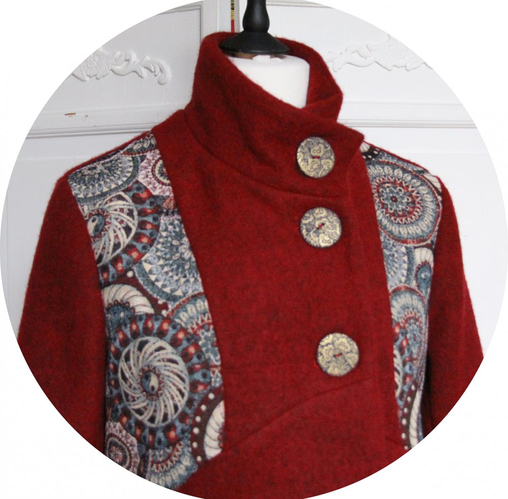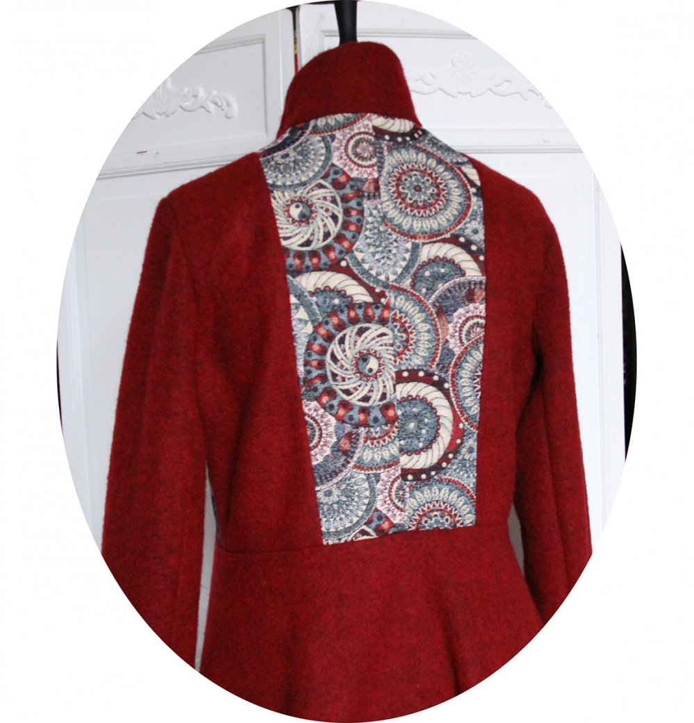 Manteau Spencer trapèze ample en laine feutrée bordeaux et tissu Jacquard à motifs bleus et rouges..