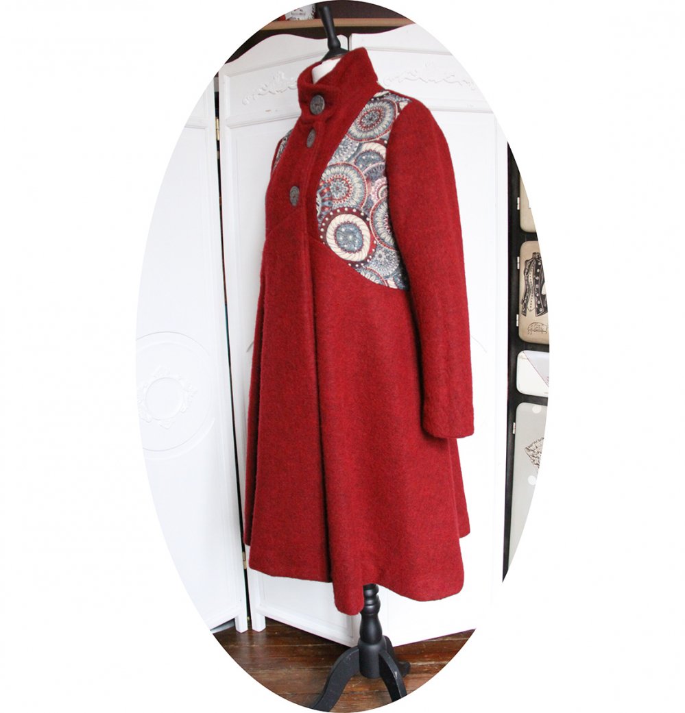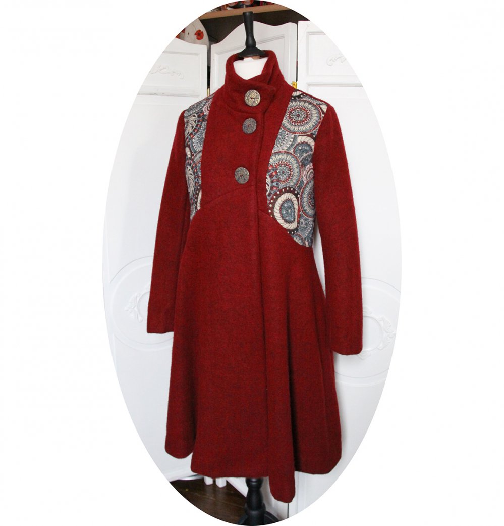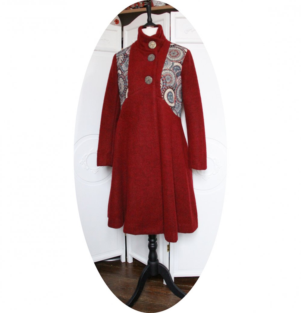 Manteau mi-long en pure lainage bordeau et tissu Jacquard, doublure en satin stretch bordeaux.