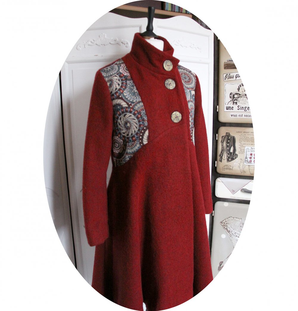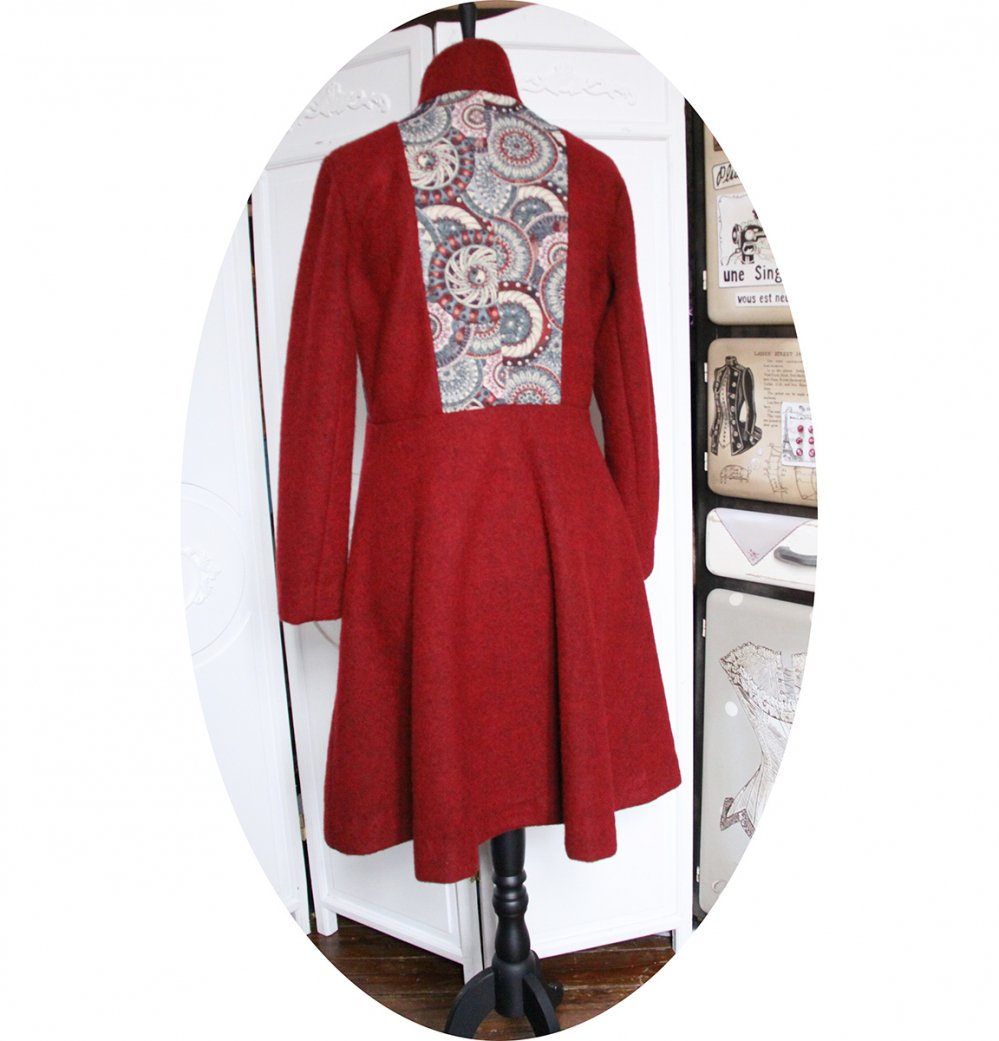 Pour vous, j'ai choisi un très beau lainage, de laine feutrée sur une base maille pour un effet doux et duveteux, travaillé en manteau mi-long (pour être bien au chaud), cintré a la taille, évasé ensuite pour une jolie forme trapèze.