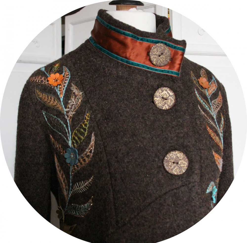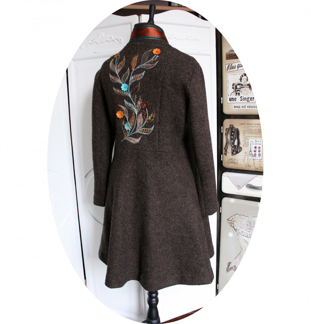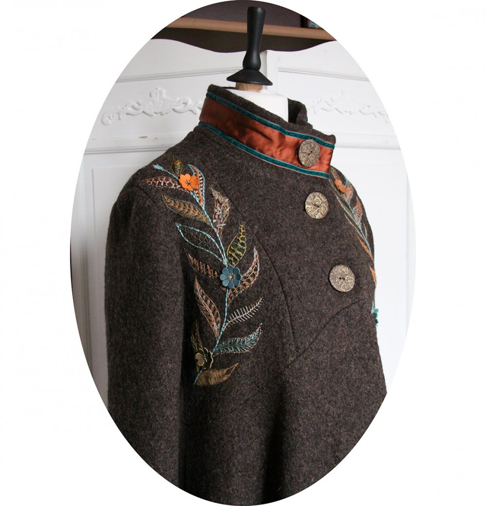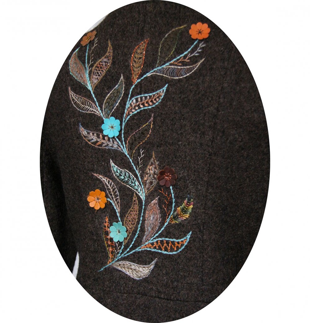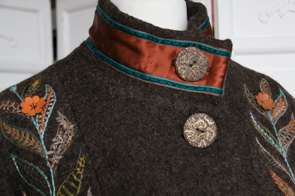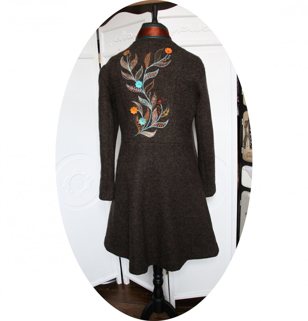 Manteau d'hiver mi-long en pure laine marron chiné, brodé dans les tons rouille et turquoise.