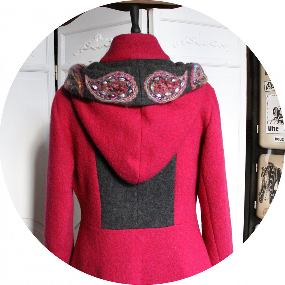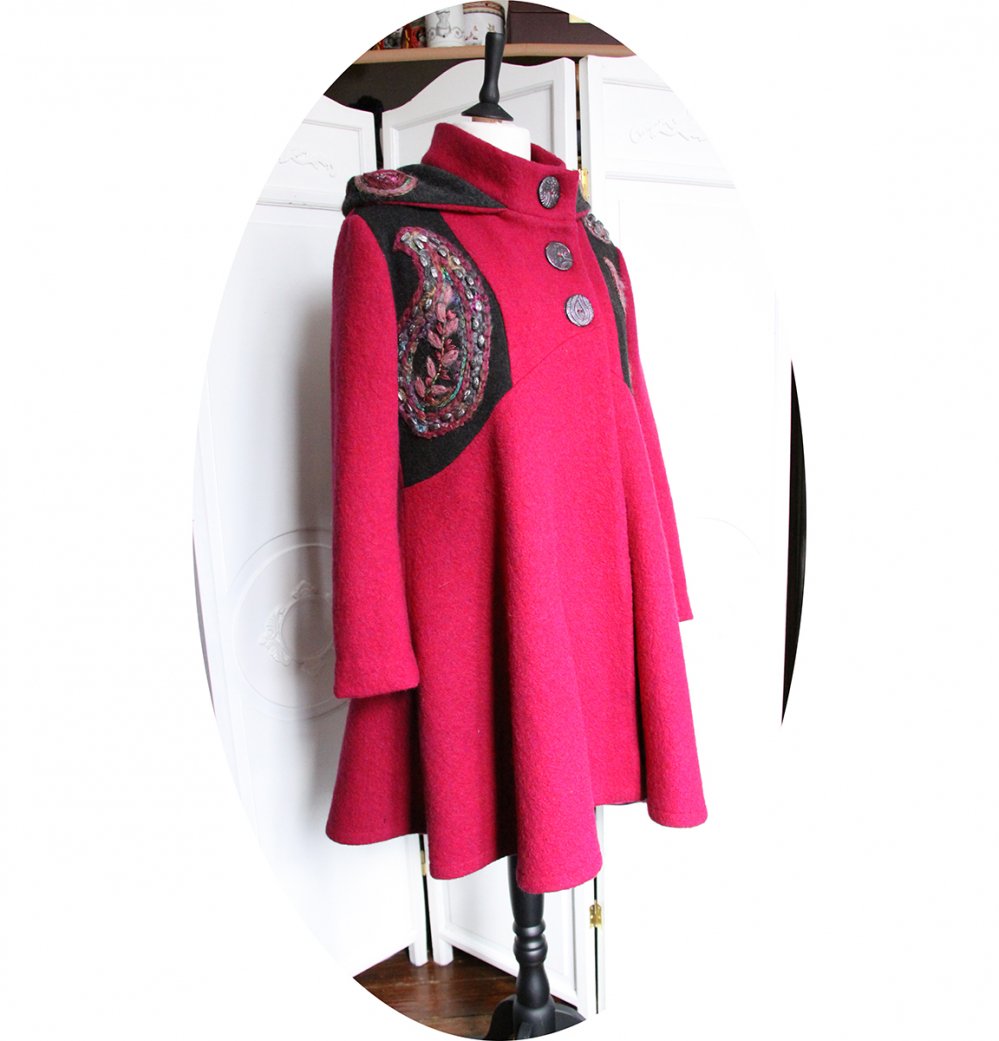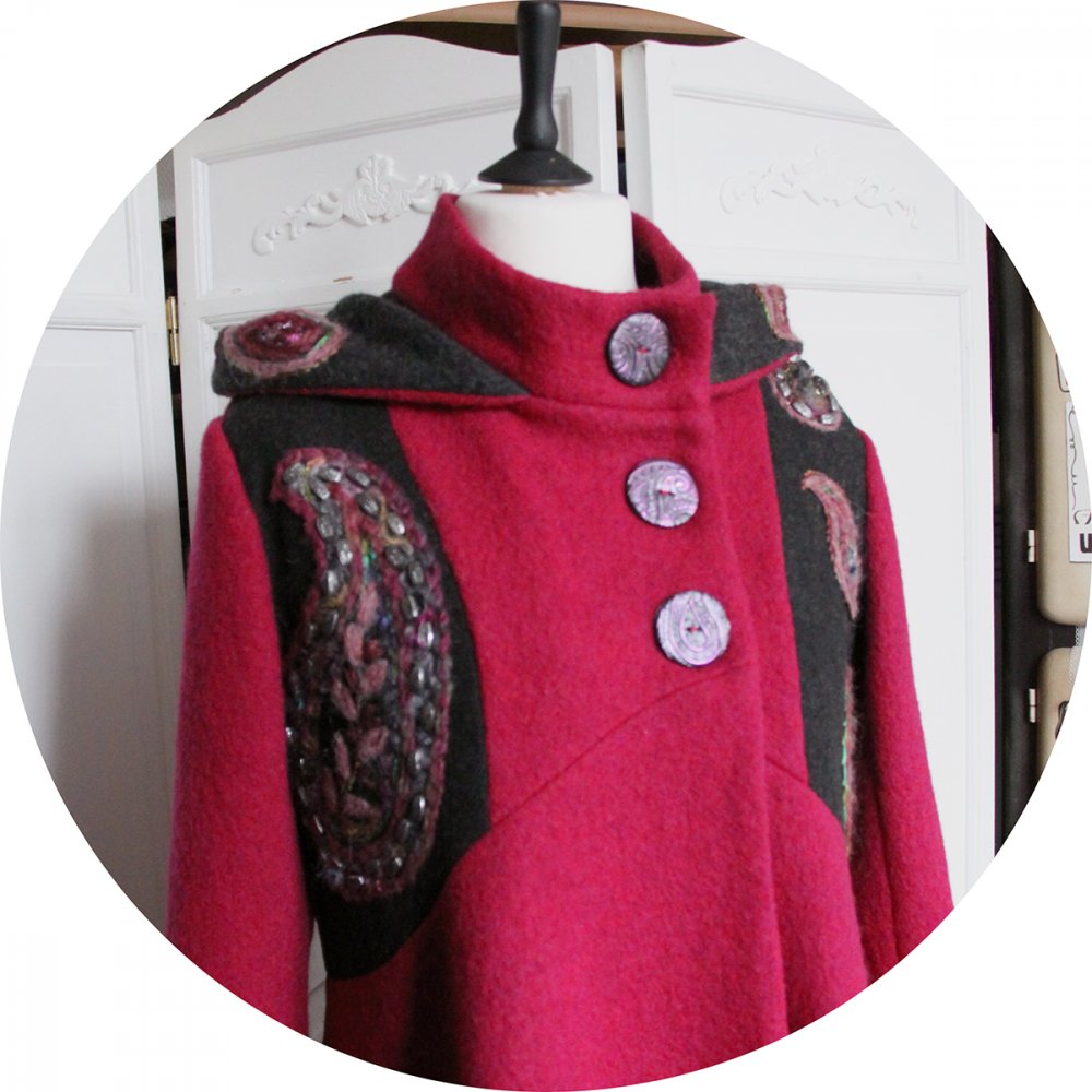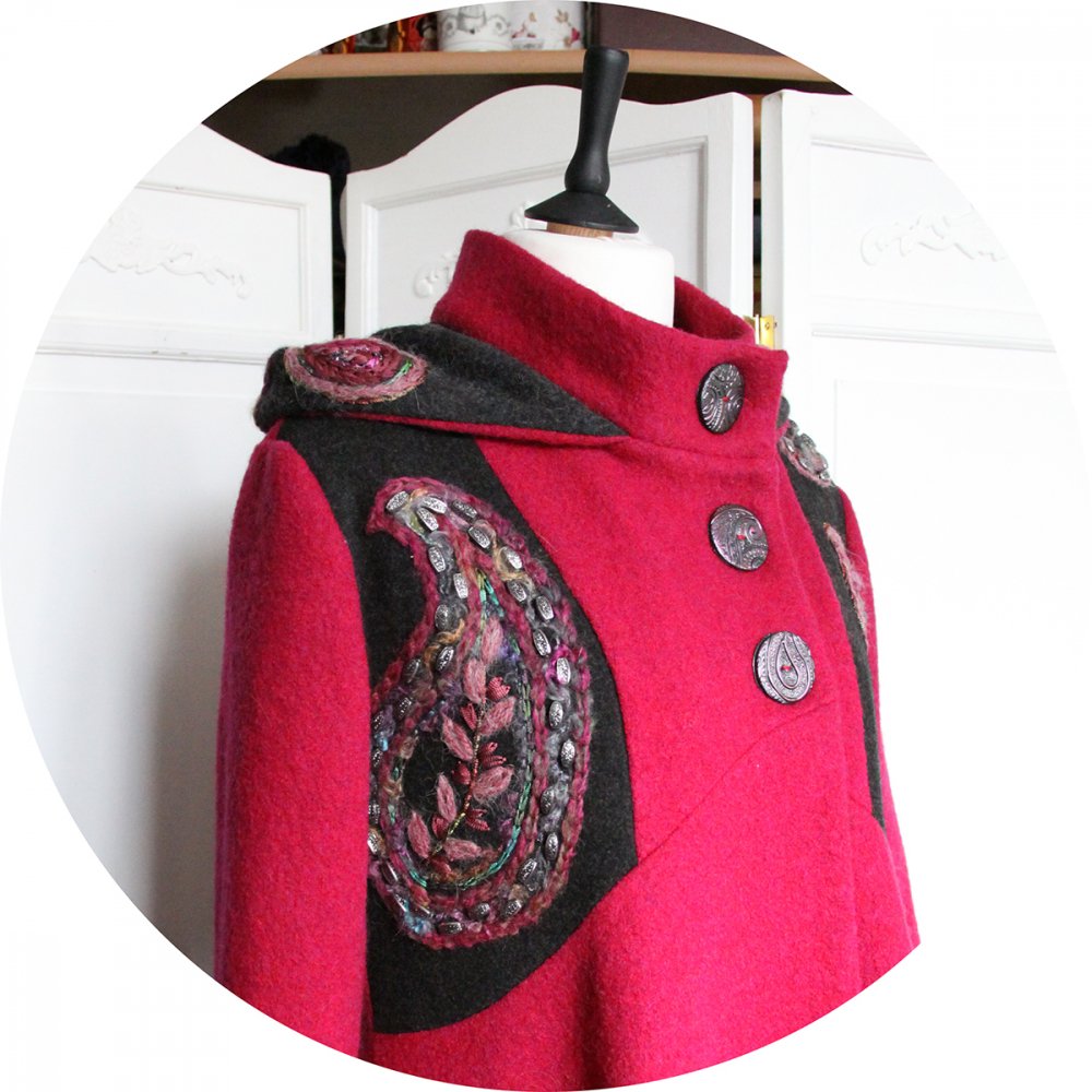 Le manteau se ferme par de jolis boutons noirs à motifs cachemire rose assortis à la broderie, réalisés par mes soins. Son col montant peut se porter ouvert ou remonté, pour garder le cou bien au chaud. Pour répondre à la demande de mes clientes préférées j'y ai ajouté une capuche, dont le tour est brodé.