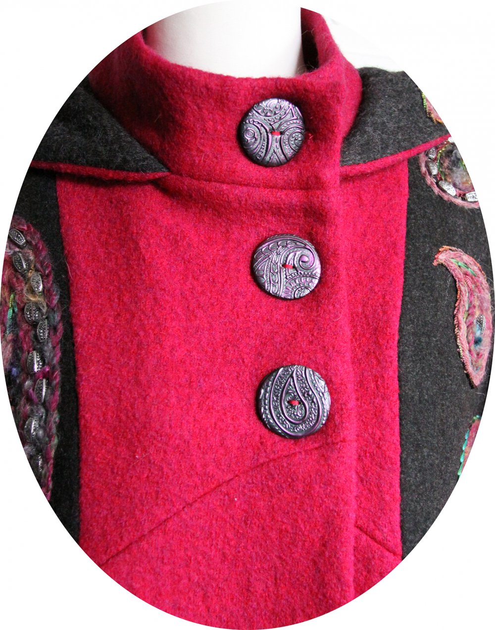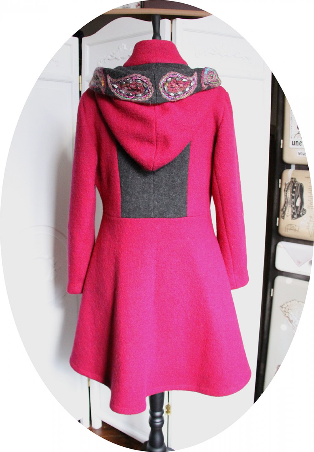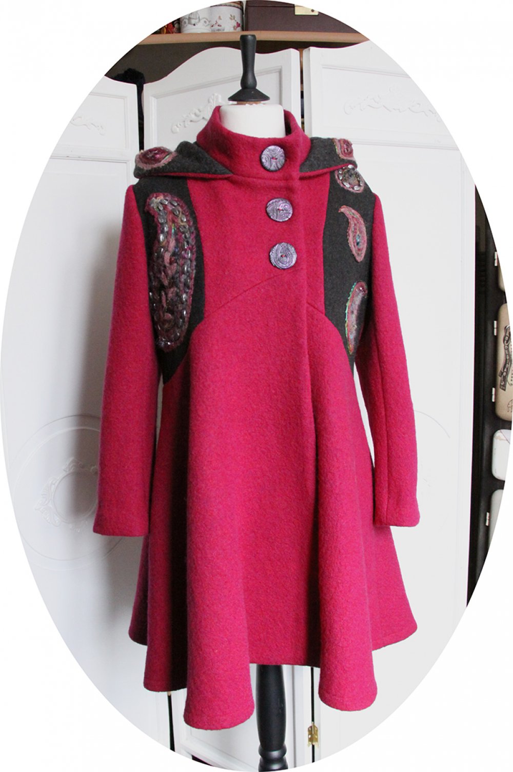 Le manteau se ferme par de jolis boutons noirs à motifs cachemire rose assortis à la broderie, réalisés par mes soins. Son col montant peut se porter ouvert ou remonté, pour garder le cou bien au chaud. Pour répondre à la demande de mes clientes préférées j'y ai ajouté une capuche, dont le tour est brodé.