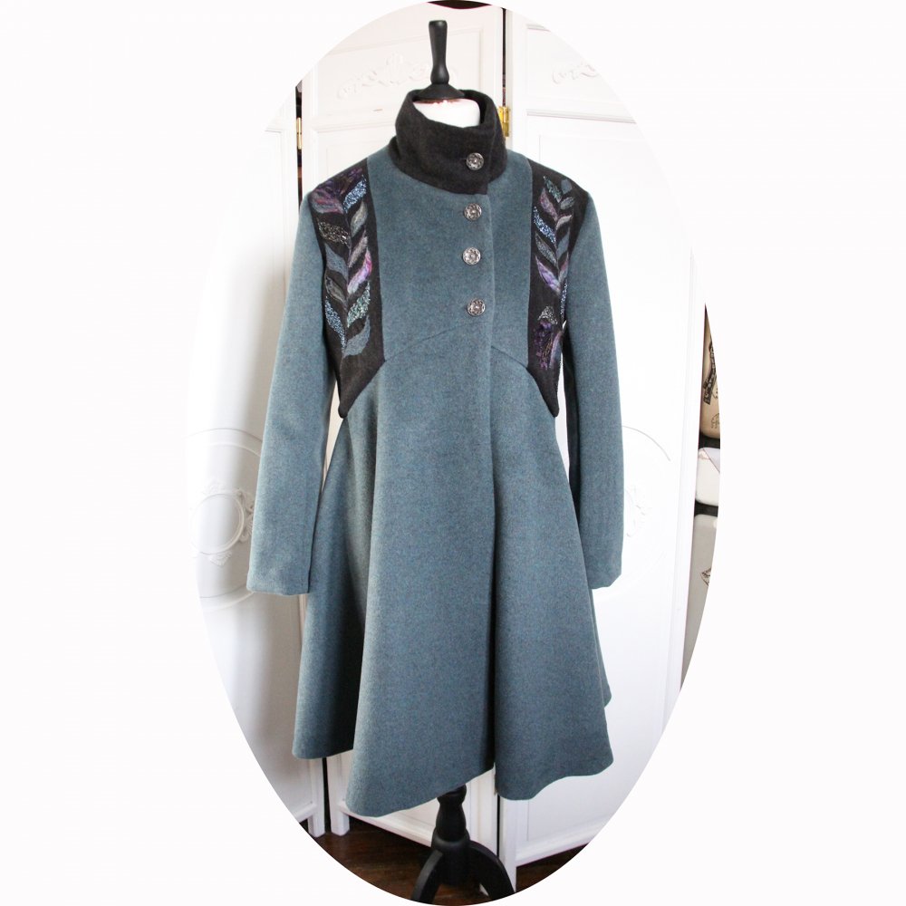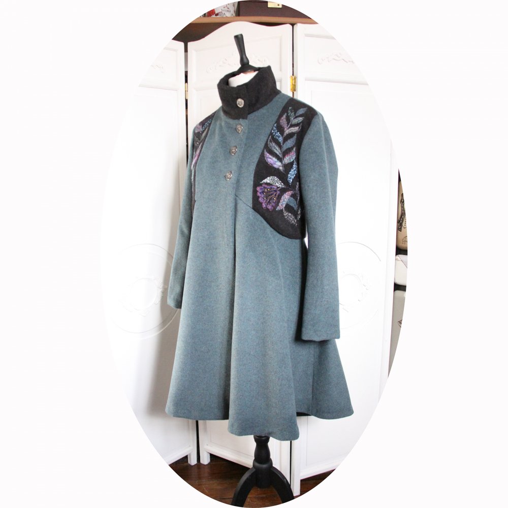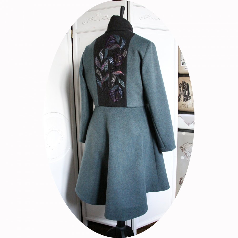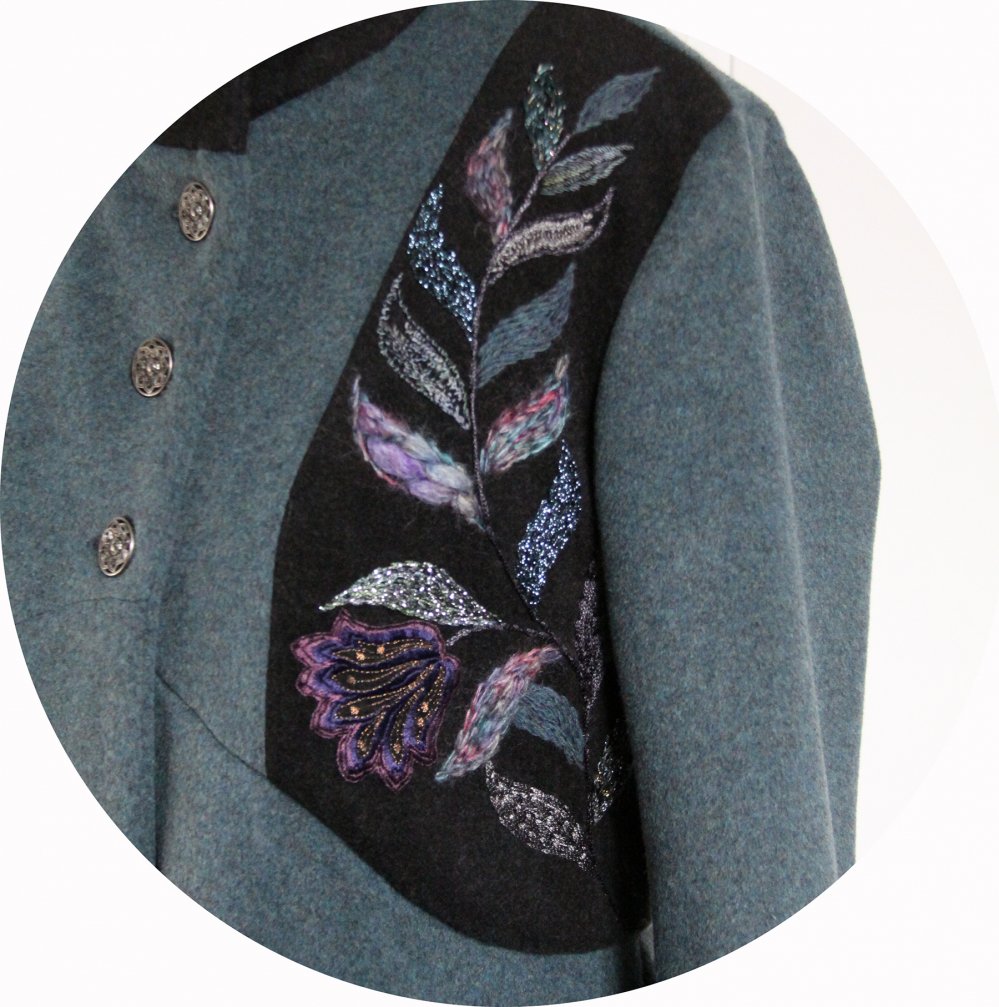 Manteau Spencer de forme trapèze en drap de laine bleu et gris brodé à la main motif feuilles